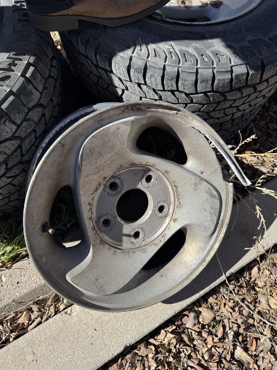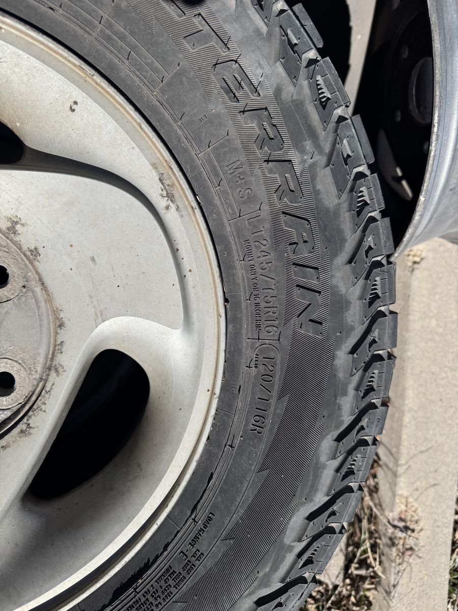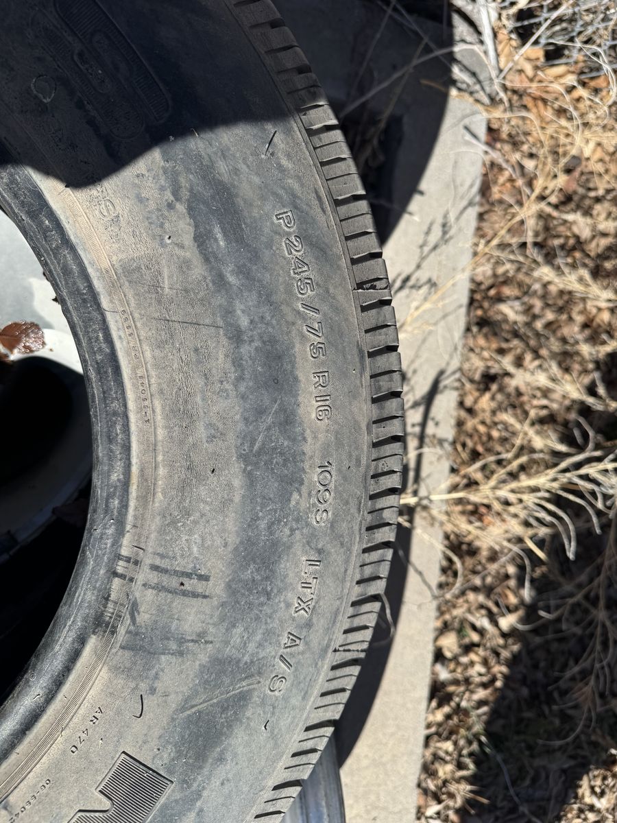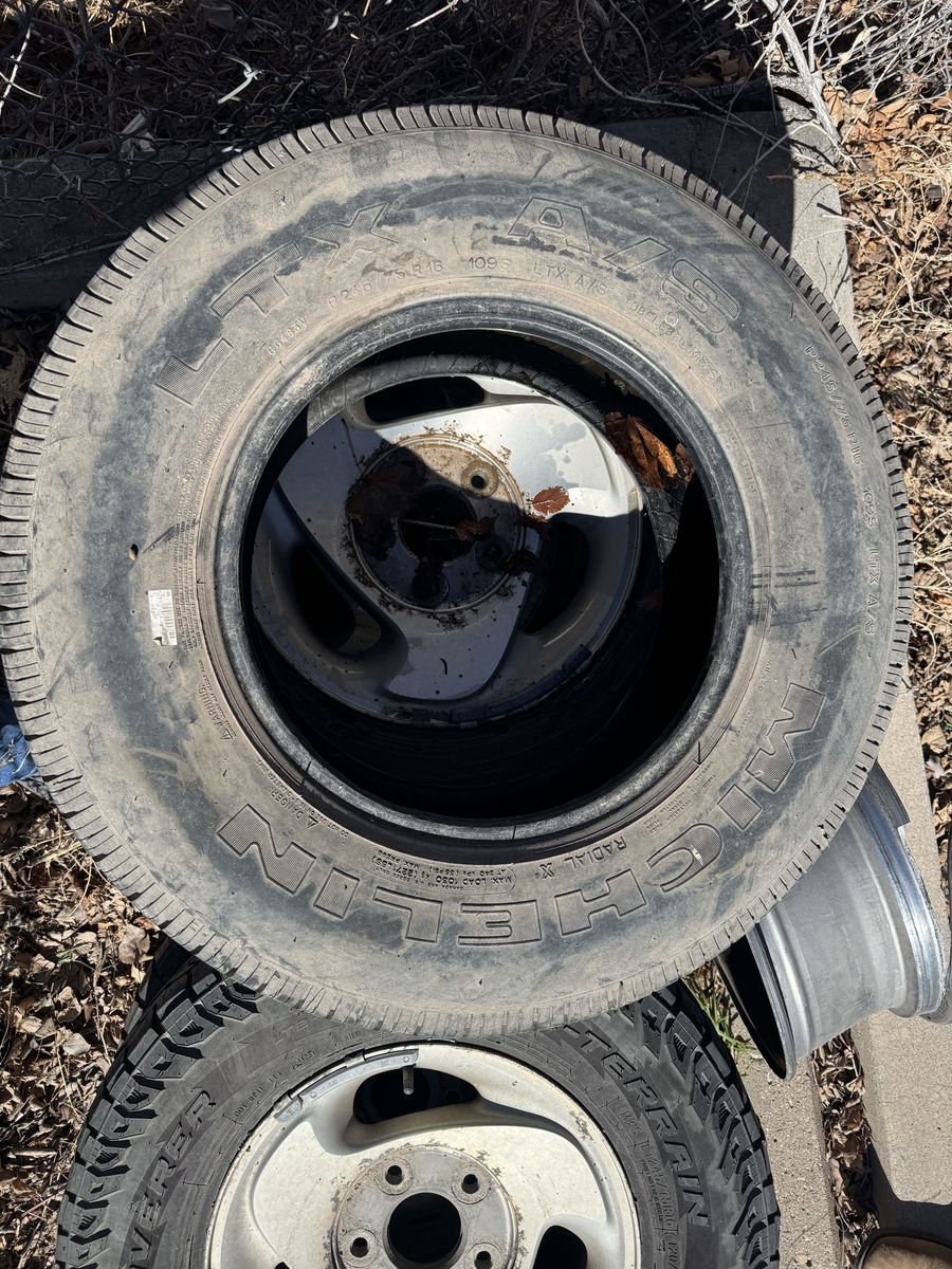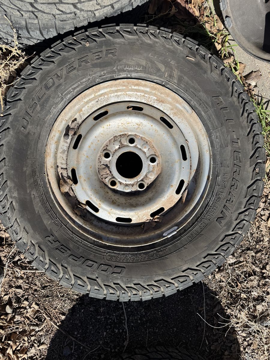 5 rims off a 2000 Ram 1500, one is broken (if you want it), one is the spare rim. 4 Cooper Discoverer 245/75r16 tires mounted to the 4 good rims, 1 Michelin LTX tire that was originally mounted to the spare rim. Hubcaps are included, will add pics later. The Cooper tires have about 10k-11k miles on them, and were on the truck for just over a year.