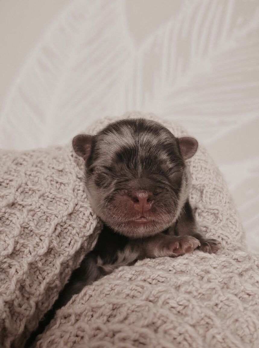 Sire is a blue Merle who carries one copy of fluffy, giving him an exceptionally soft short coat. AKC titled (CGC & CGCA), health tested and clear. He weighs 20 lbs and is the best cuddle buddy.