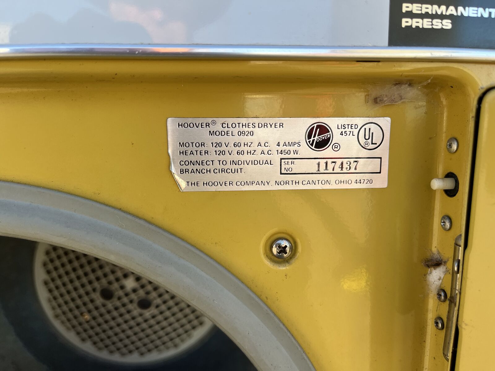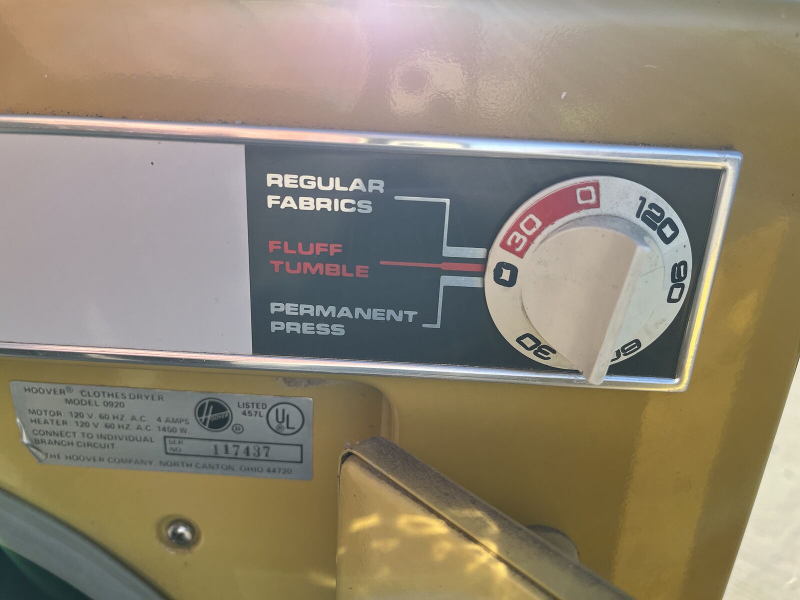 VenmoA genuine 1970s Hoover® electric dryer finished in signature yellow enamel. The Model 0920 delivers straightforward performance with solid construction and simple mechanical controls — built in an era when appliances were made to last.