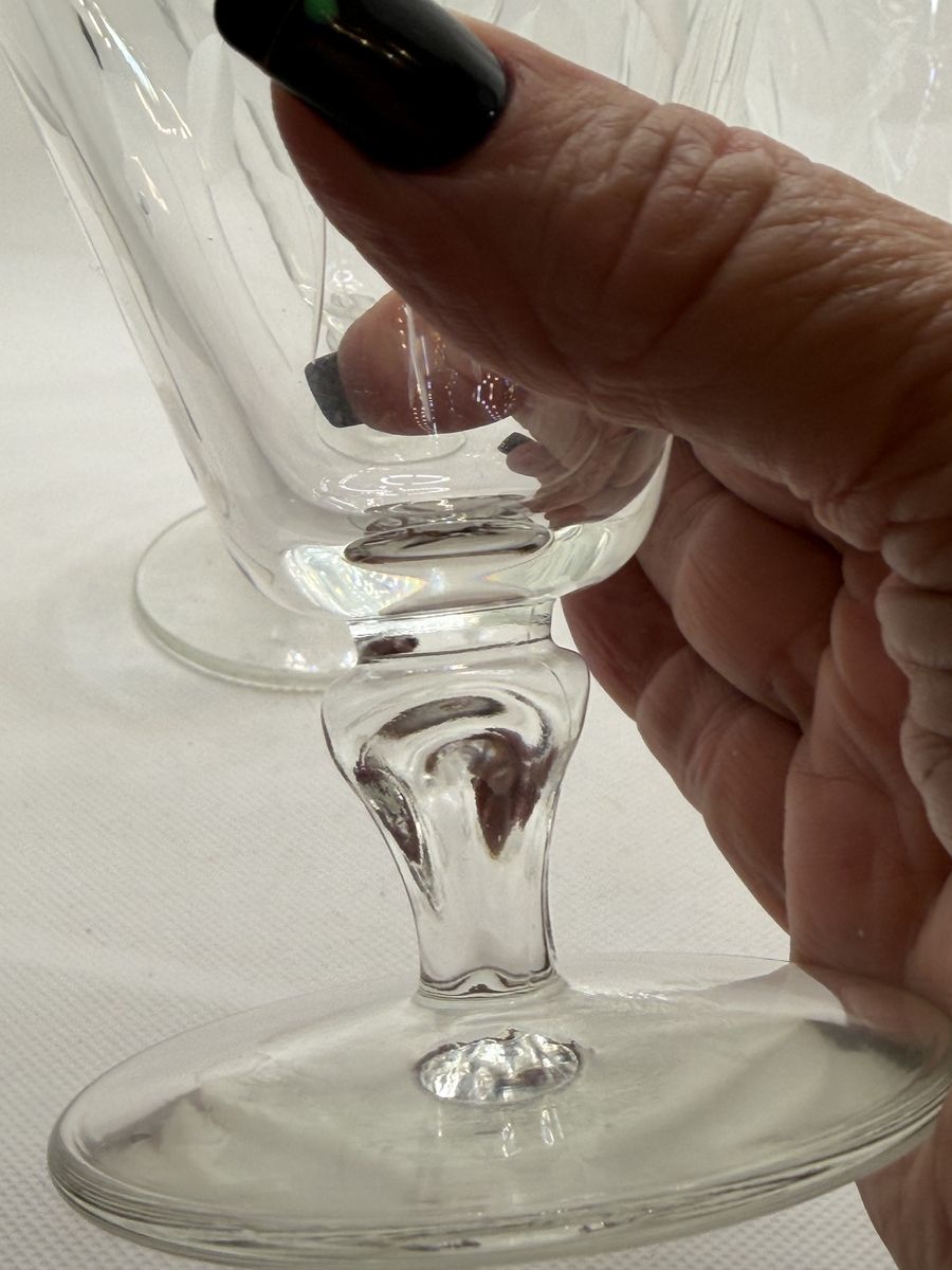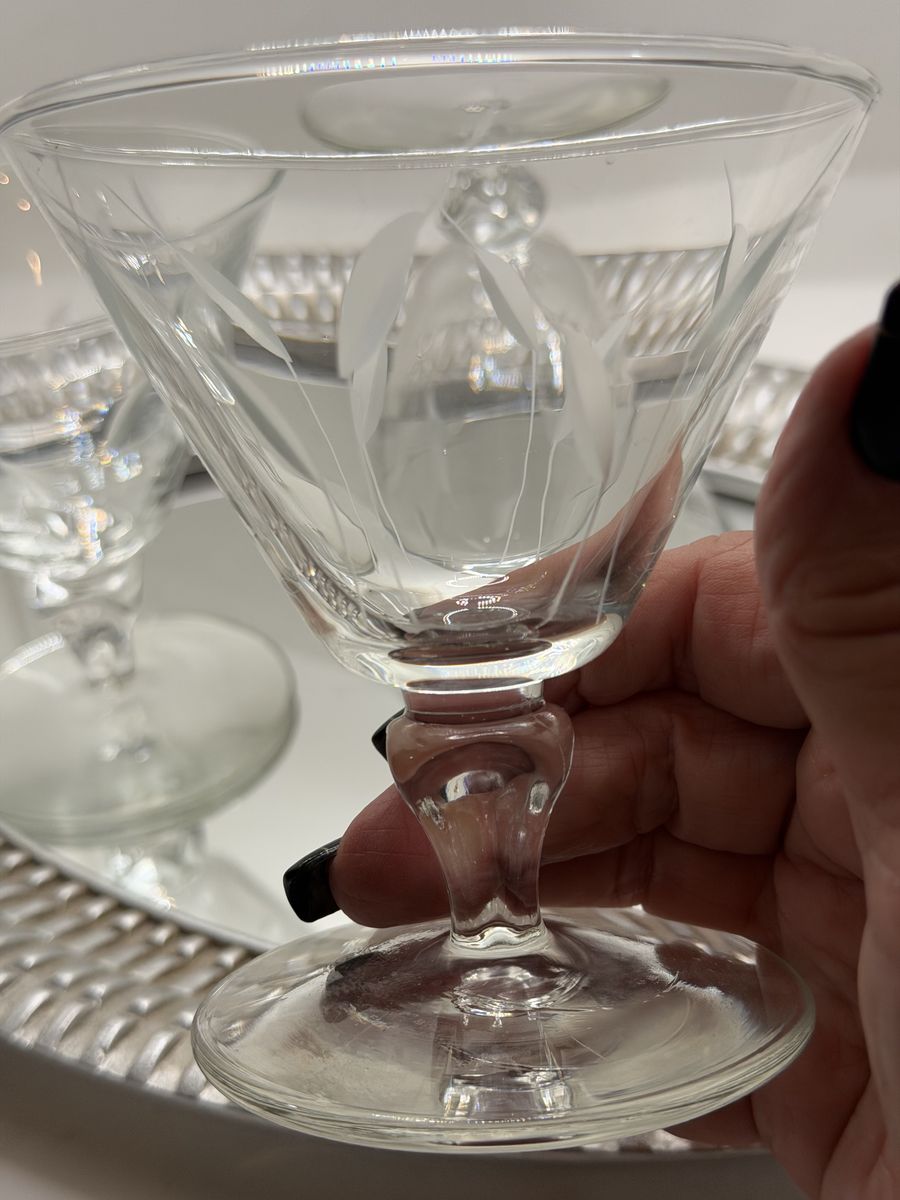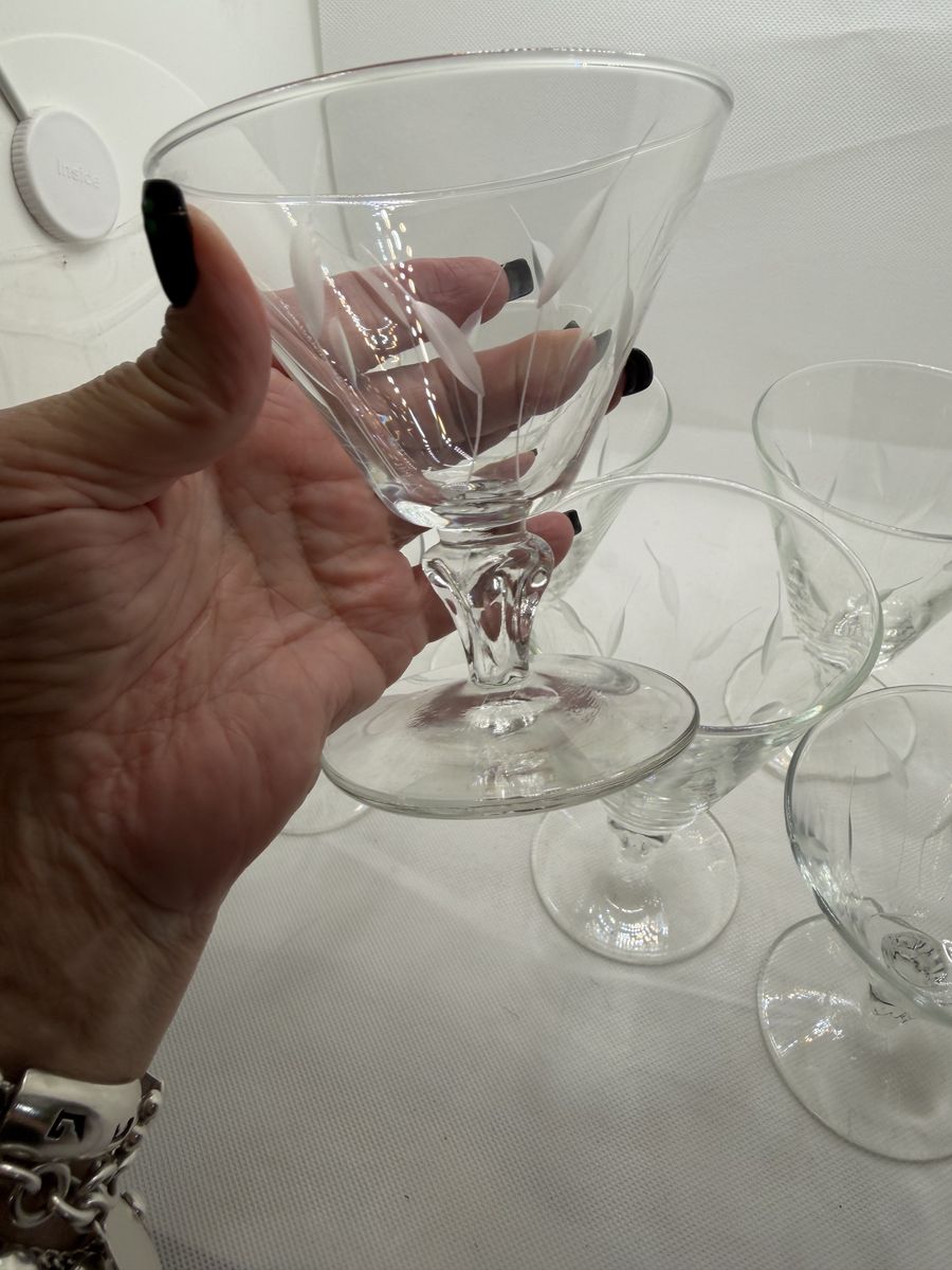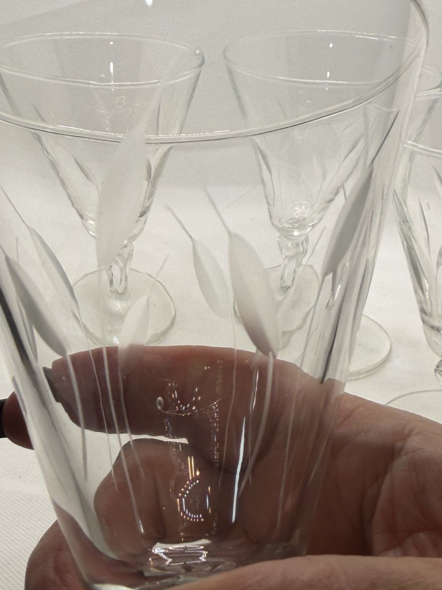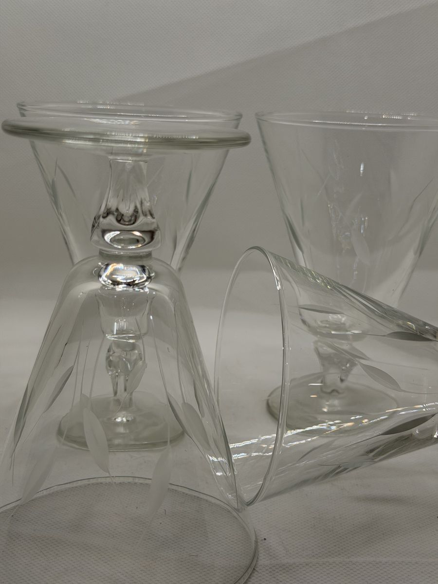 VenmoExcellent like new. Vintage glassware by Libby. Made in1950's -- discontinued now (4 )Water goblets at 5.5" H and 3.7/8's . (3 )champagne/sherbet glasses at 4" H and 3.75 W. They are sturdy yet delicately etched with leaf patterns. Sure to add a charm to your glass/barware collection.