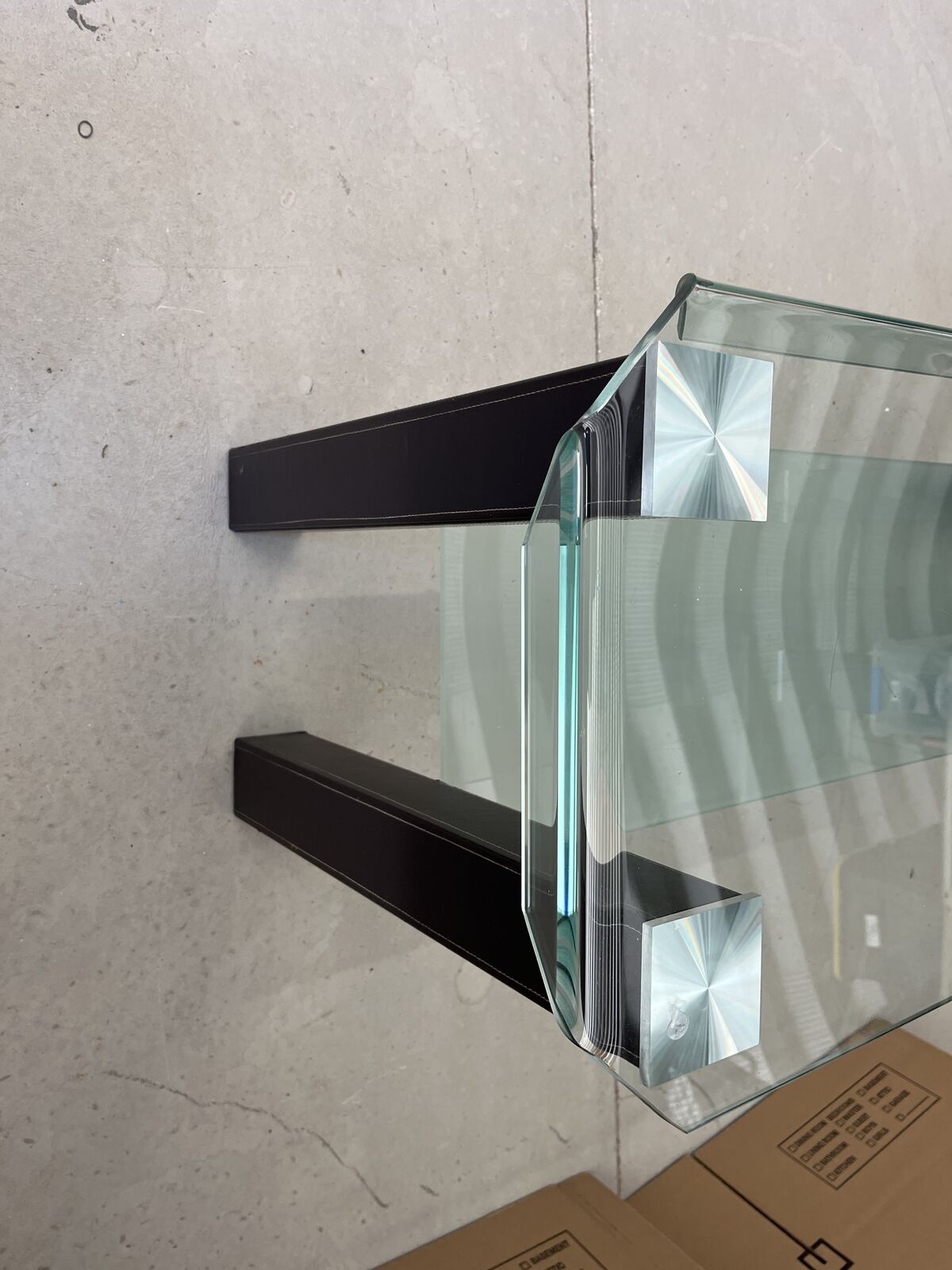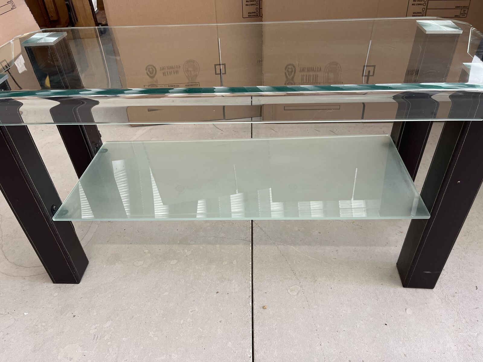 Have glass table 47 inches long 18 inches wide. The glass is curved in the front and the sides has a bottom glass shelf has some flaws on the legs but overall good condition.