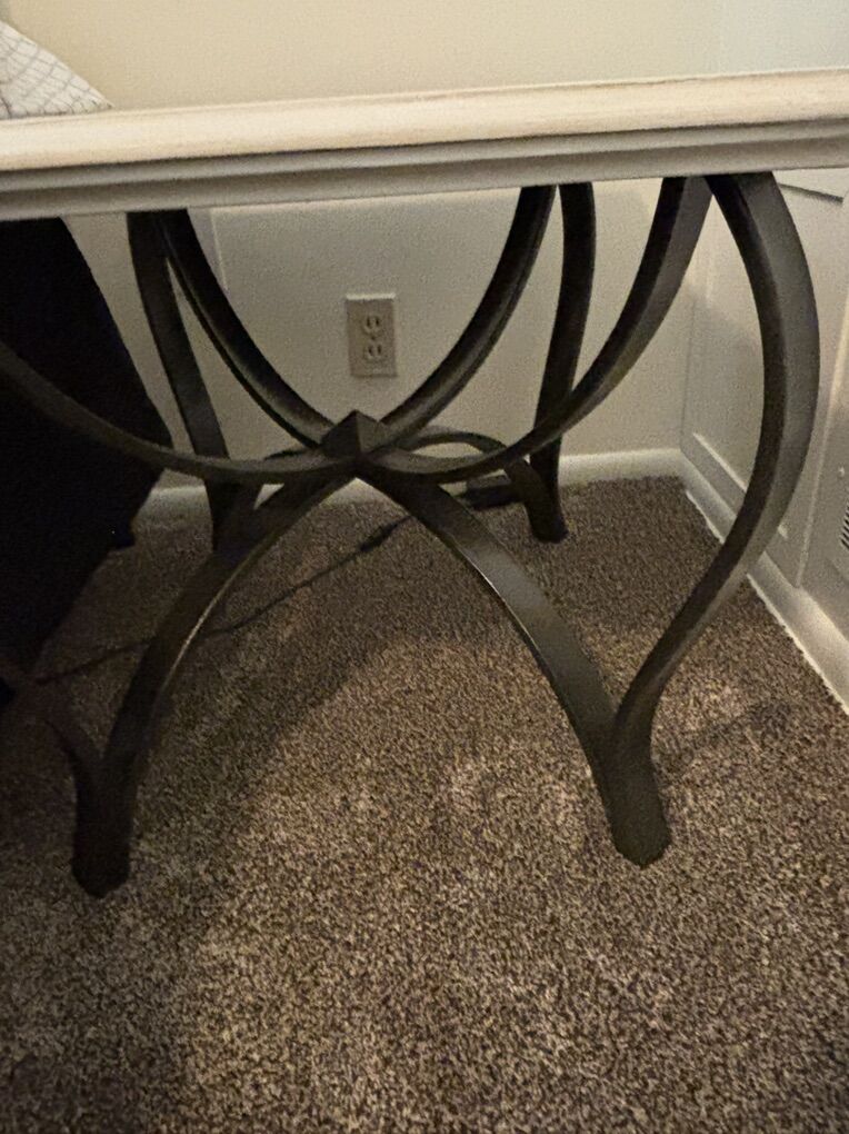 VenmoTwo side tables. Antiqued cream top with black metal. Neat curving design underneath. Works as bed side tables or sofa end tables.