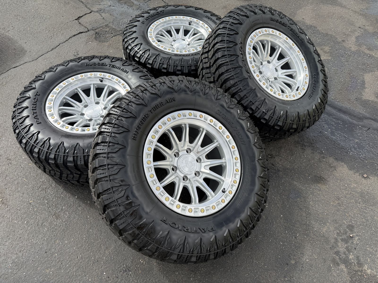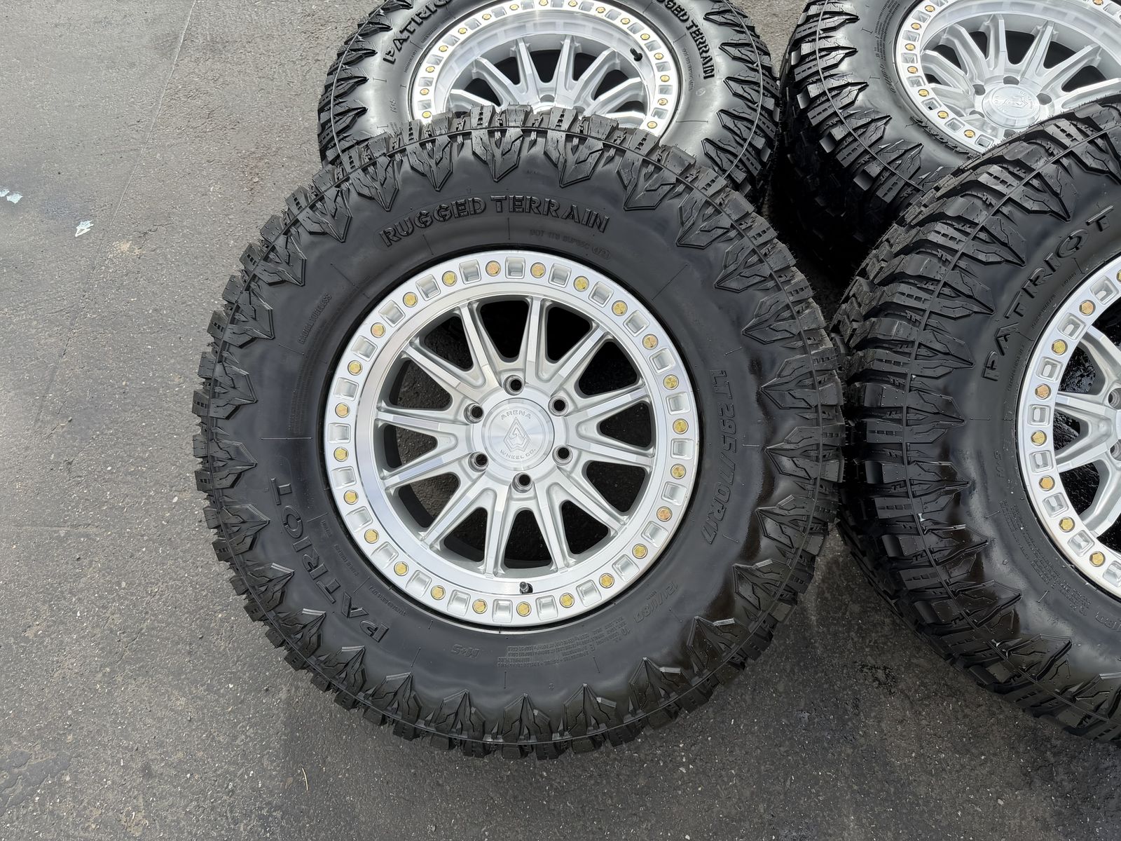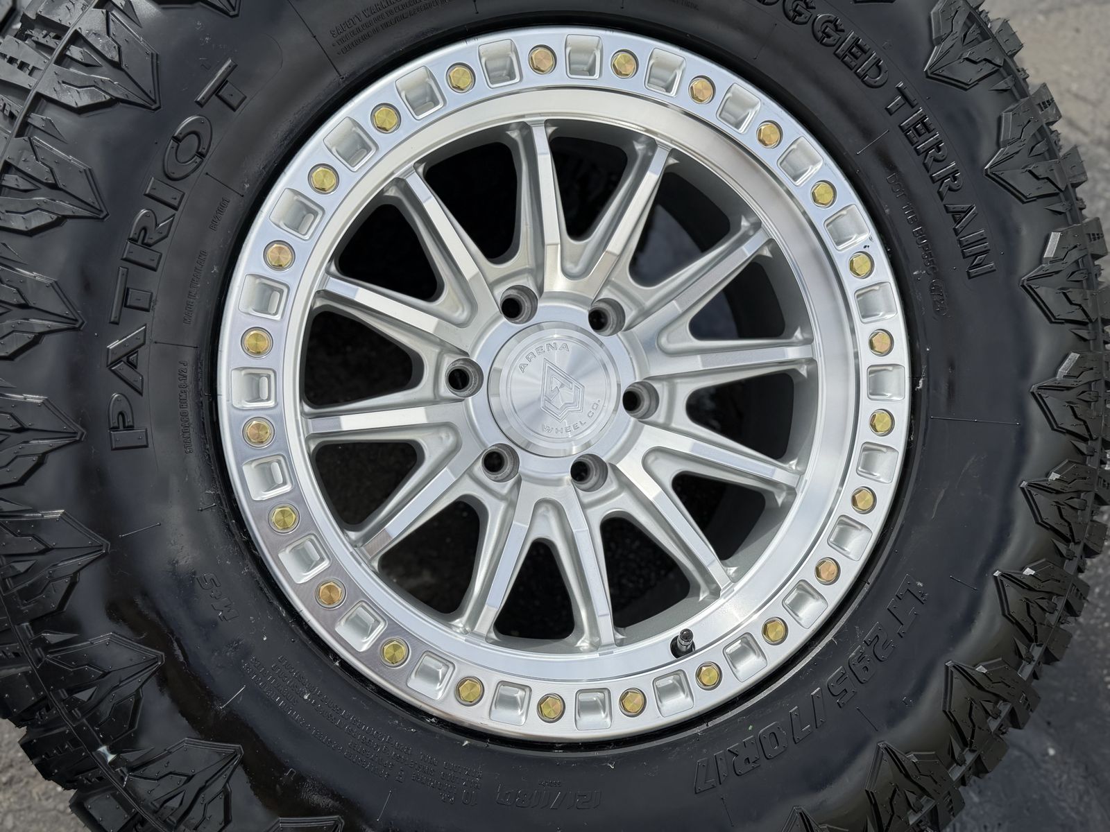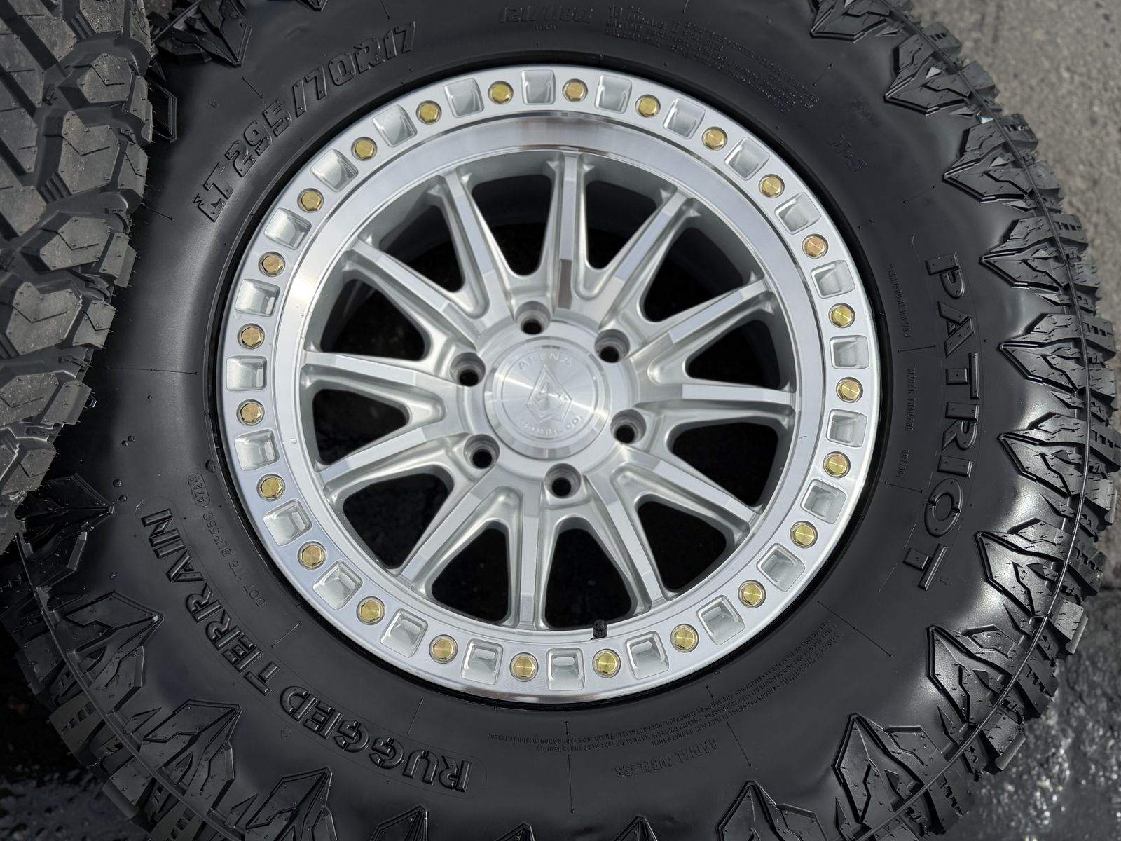 ApplePayOn special! Brand new 17x9 00et offset Arena Mission Silver finish mounted and balanced on 33” LT295/70r17 Patriot RTs. 6x135 bolt pattern. These fit 2004 and newer Ford F-150 and expedition. HUGE Savings these wheels retail over $379 each plus tax and shipping! Plus tires! SAVE!!!