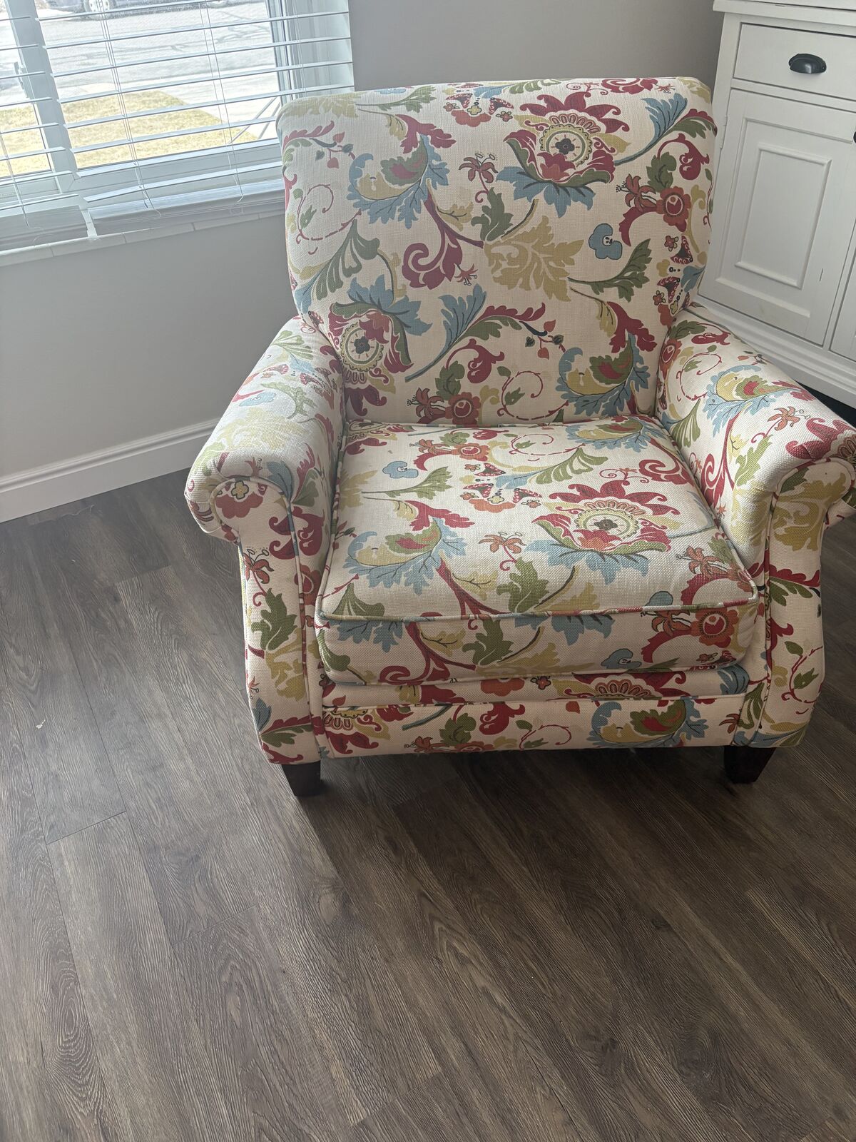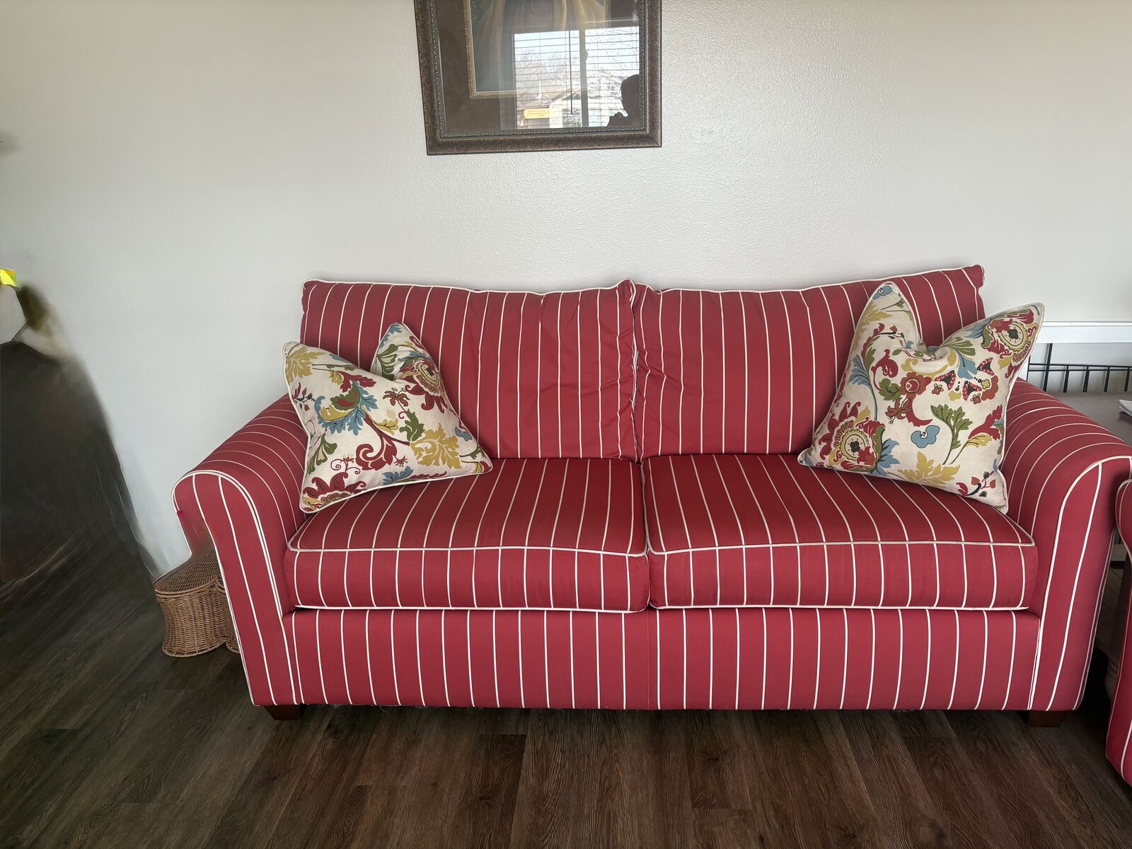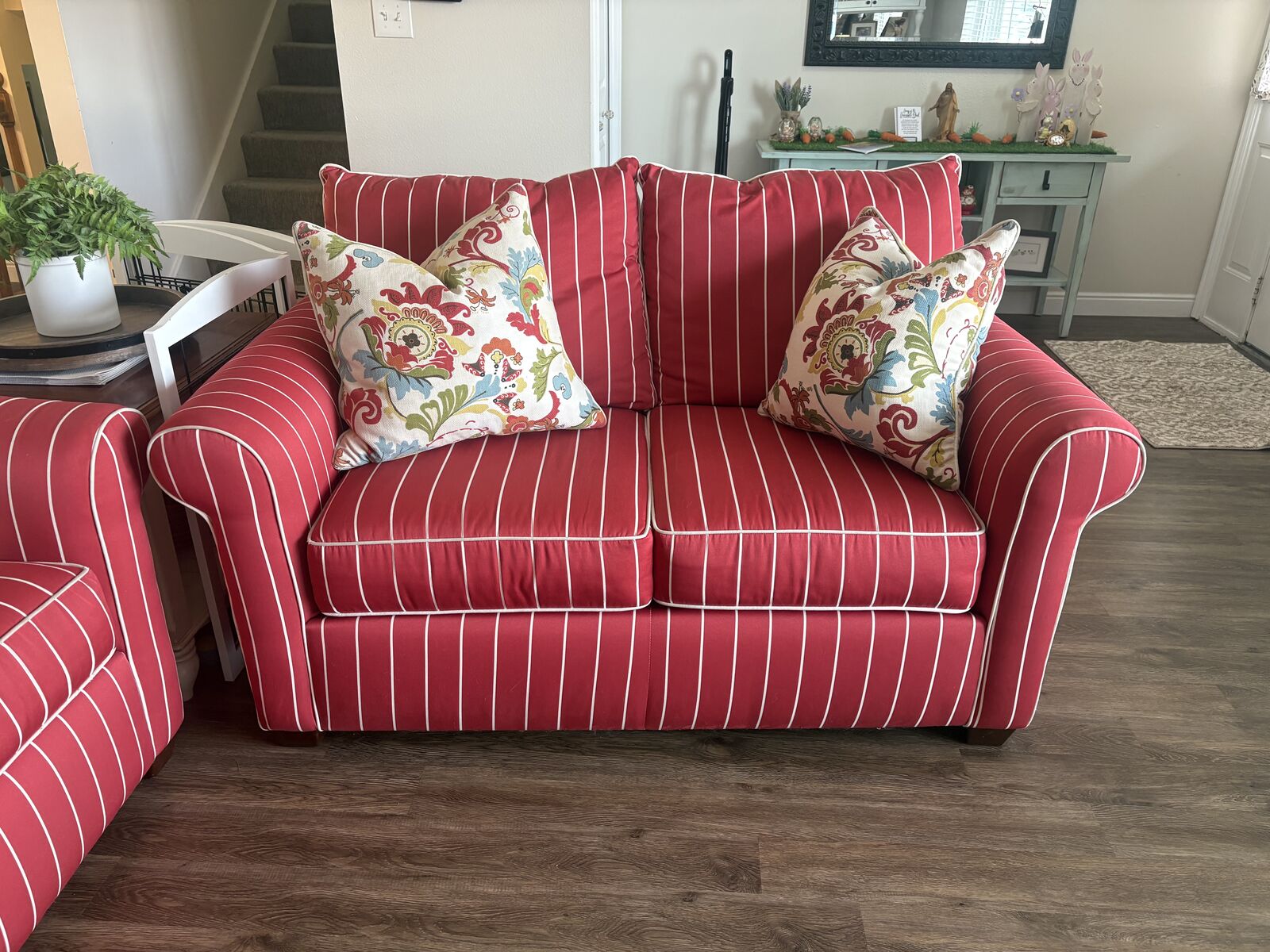 Beautiful sofa set! Sofa, loveseat and accent chair sold as a set. These are high quality pieces but the fabric has faded. All pieces and pillows were recently professionally cleaned. No tears or rips. Very comfortable and has maintained shape well, no sagging on cushions. The couch is 83 inches long and 38 inches deep. The loveseat is 63 inches long and 38 inches deep. $250.00 O.B.O