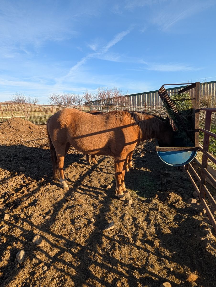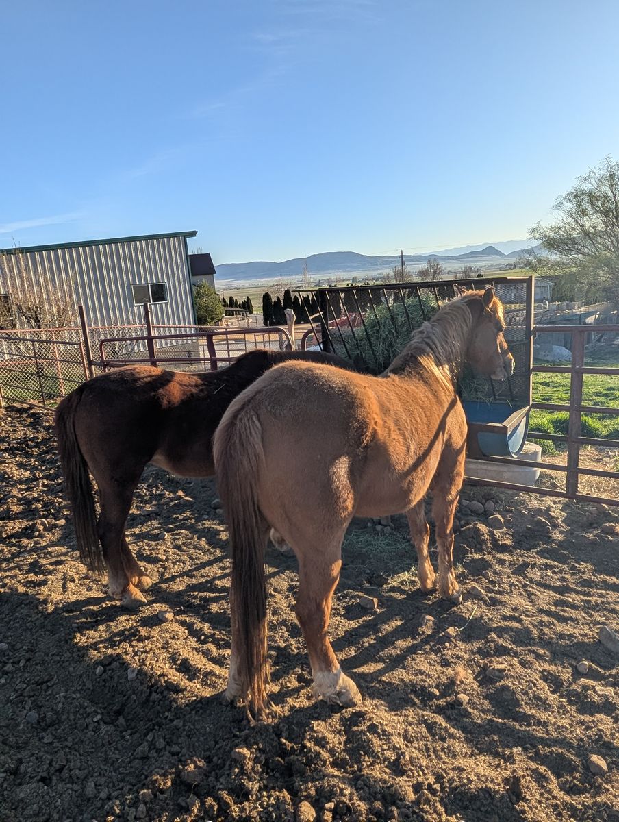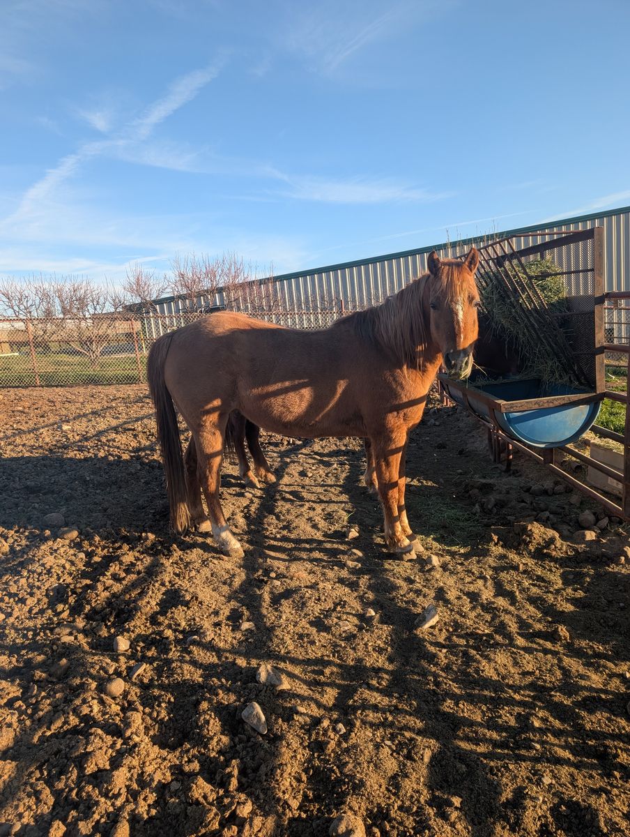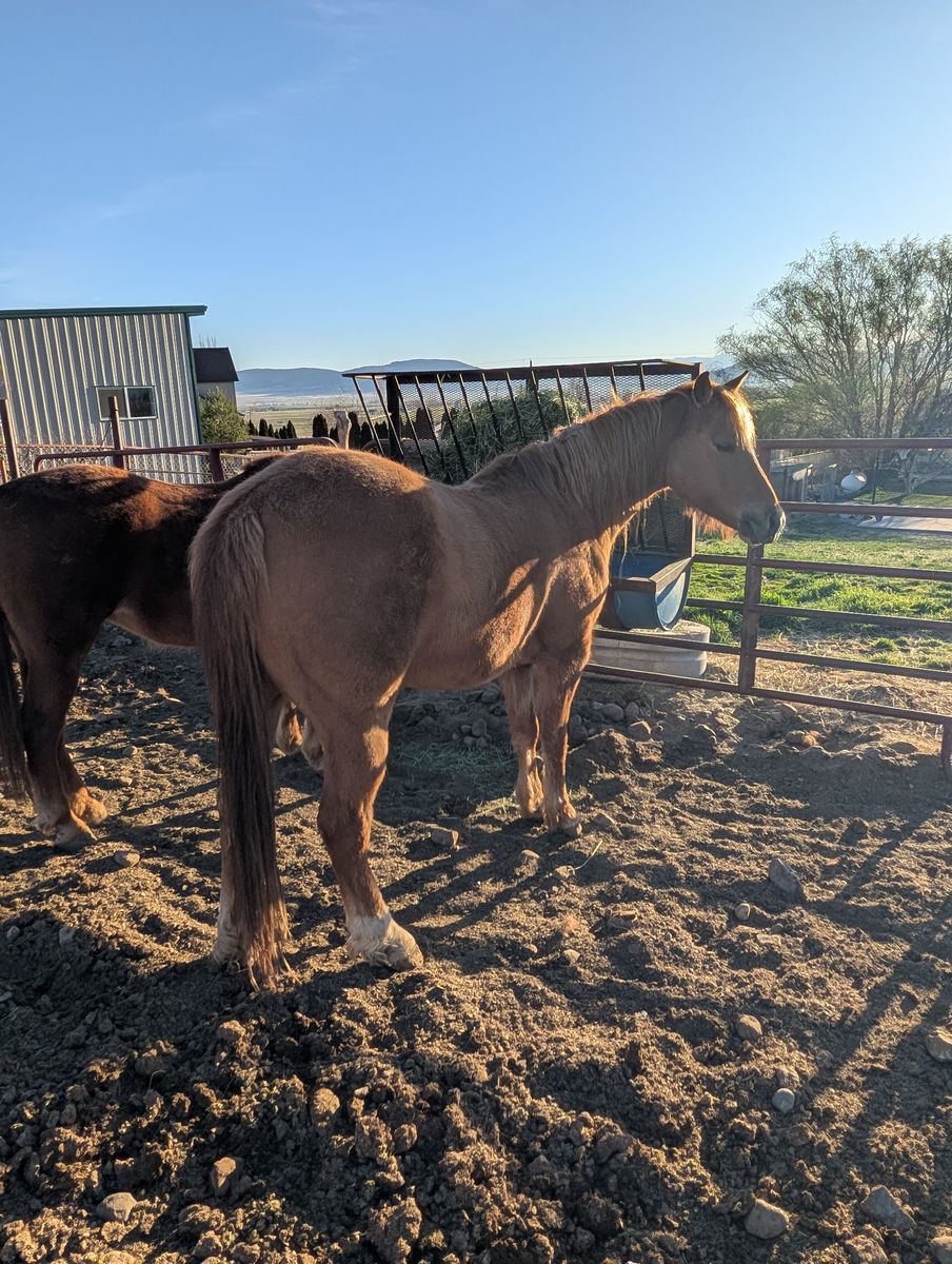 We call him Rooster; He was born May 3, 2016. His dam is a registered Morgan and his Sire is a Quarter Horse. I broke him as a two year old and have been the soul rider for the most part. He has lots of go and has a fantastic flat footed walk that covers a lot of ground. I have riden him in the hills, crossed water, crossed bridges, dead fall and rocking terrans. He is a red dunn and really has beautiful color in the summer time. He gets along with other horses, is great for the farrier and trailers really well. He has been around cows a bit but I have never ropped off of him.