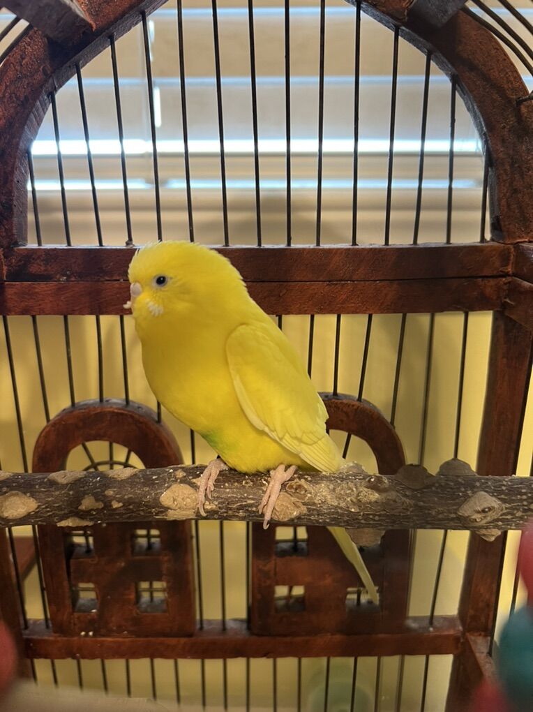 Beautiful yellow female parakeet. She comes with a very unique Taj Mahal wooden cage, toys, food and paper for the bottom of her cage. She is cheerful, and gets along with other birds (we used to have two birds) My daughter has loved having her but is ready to share her with another home.