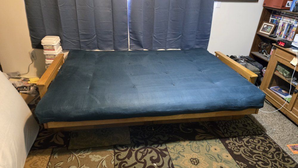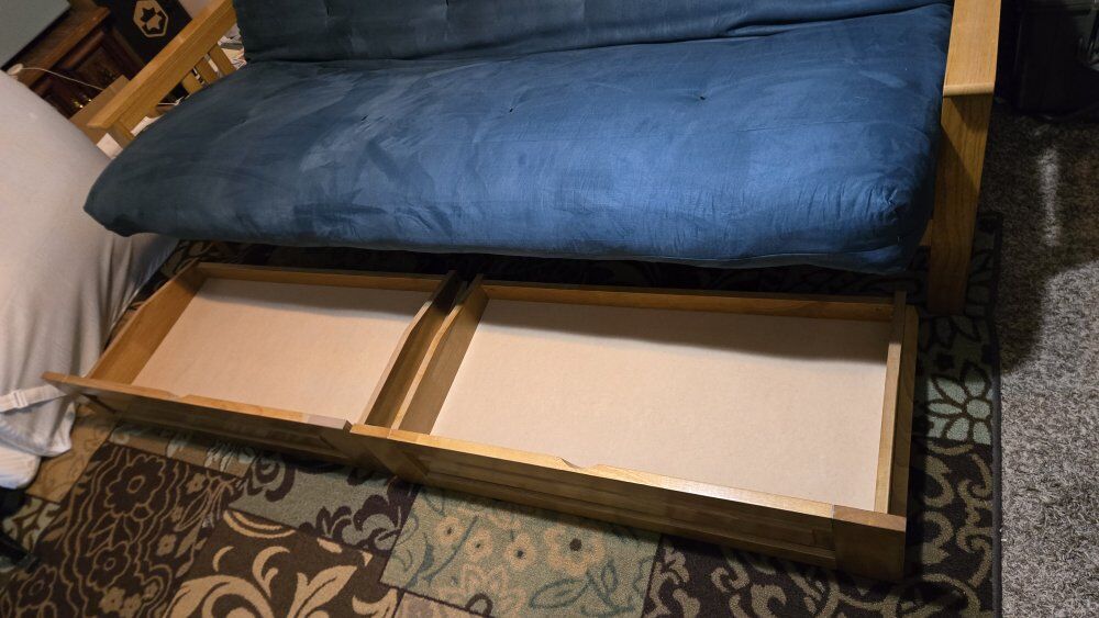PayPalThis is a Queen sized Futon bed by Kodiak Furniture. With large rolling under bed storage drawers. This has a real wood frame. Very solid in the couch setup or laying flat as a Queen sized bed. The 8" mattress is heavy, durable, and comfortable! It's also has had a 2" gel mattress pad on for added comfort. I can include that as an additional charge if interested. This has seen light use and is still in "like new" condition.