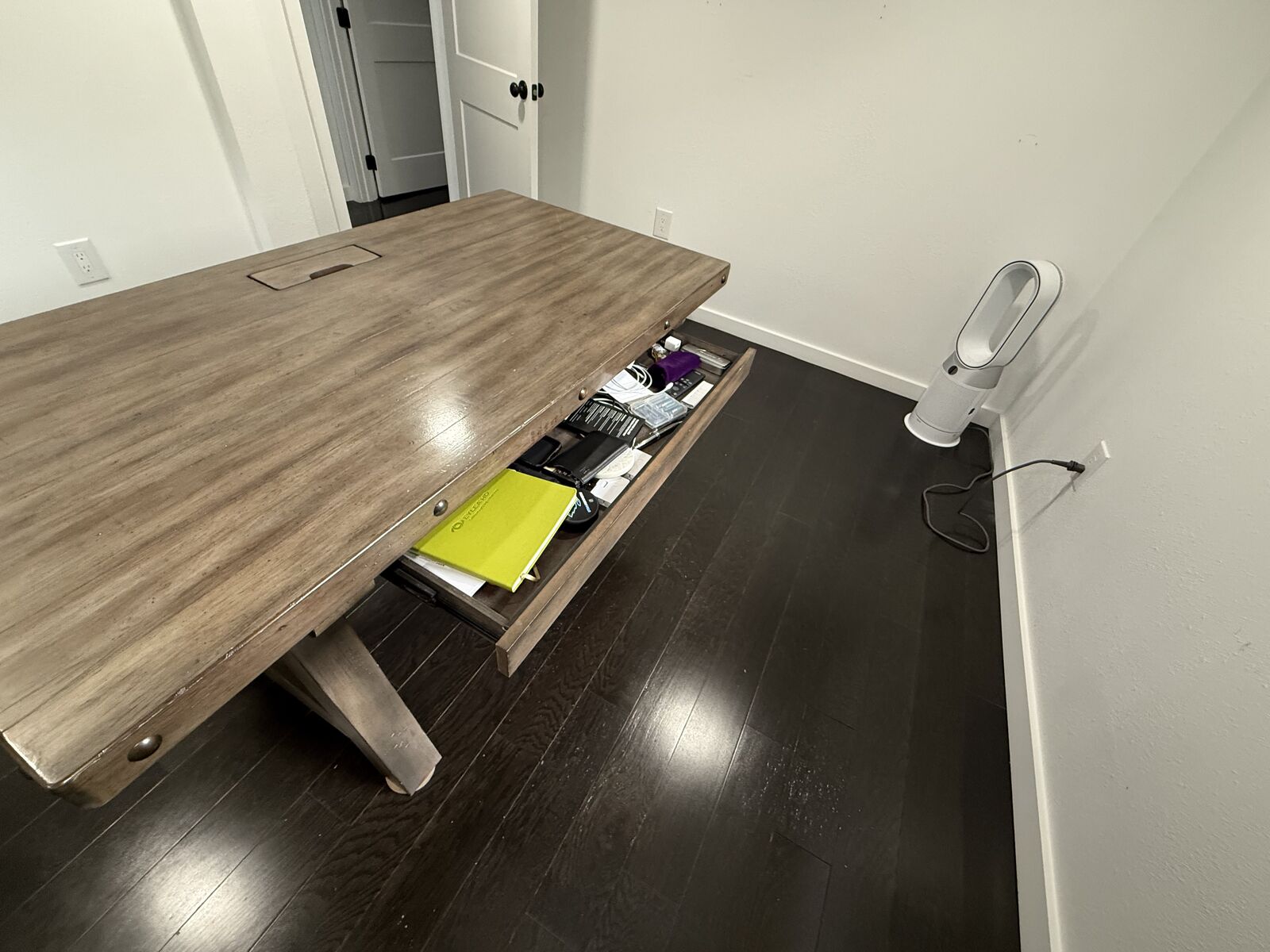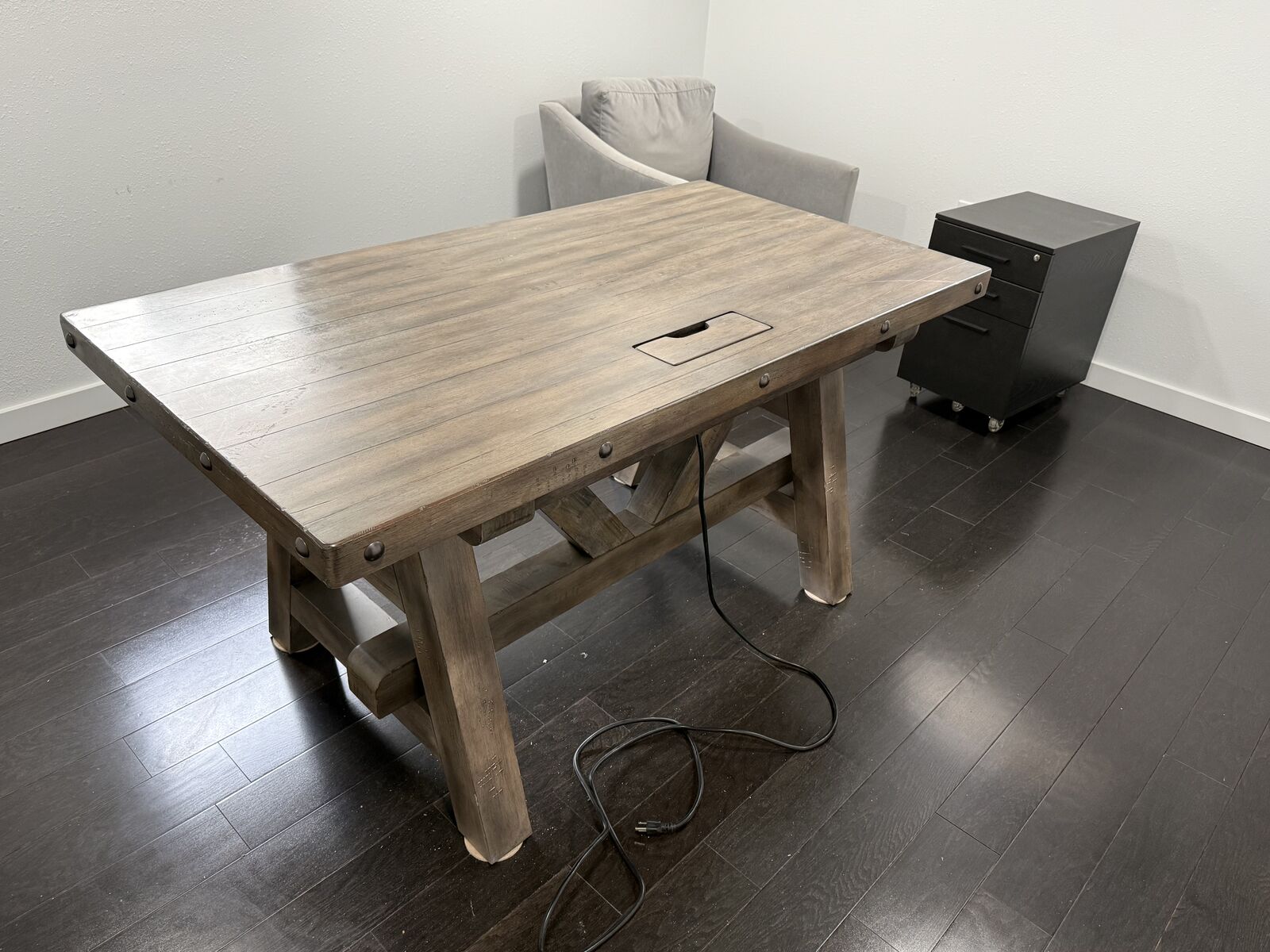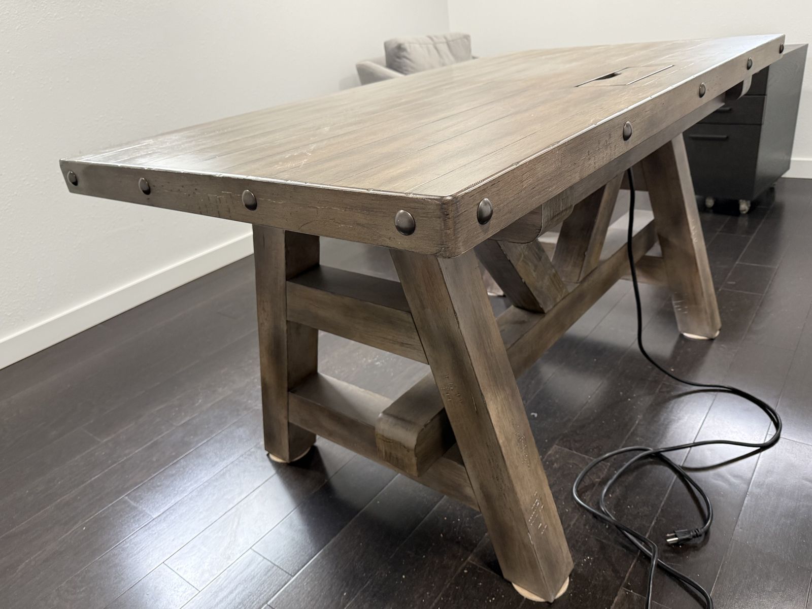 CashAppBeautiful, near new office desk in solid stained and lacquered wood. Measures 60 wide, 32 deep and 30 high. Has hidden plugs and integrated power cord for neat organization. Nice large central drawer.