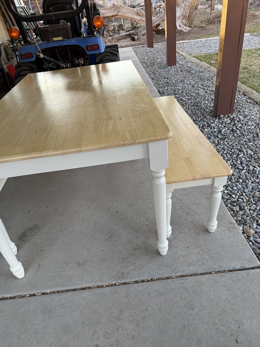 Farm table and benches in good condition. Table Measures 59”long, 35” wide, and 30” high.