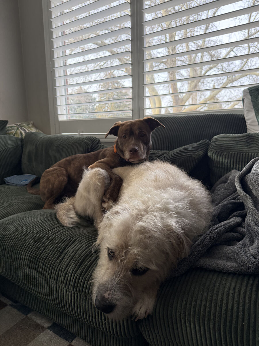 He curled up on the couch, snuggled in close, and let out the biggest sigh of relief. Within days, his anxiety began melting away, and we started working on training. Now, almost two weeks later, he is truly a different dog — learning quickly, gaining confidence, and settling into home life beautifully.