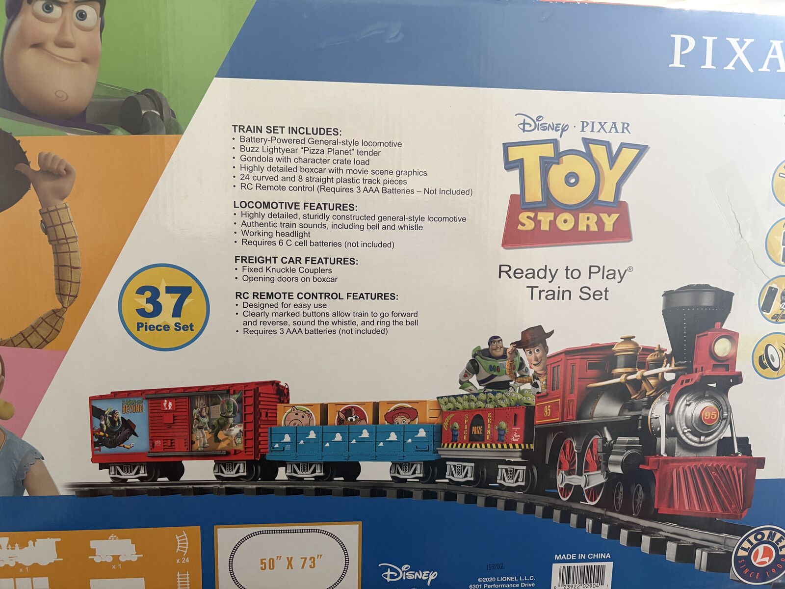 32 pieces of track Locomotive, Buzz Light year “Pizza Planet” tender car, Gondola with character crate loads Box car with movie scene graphics