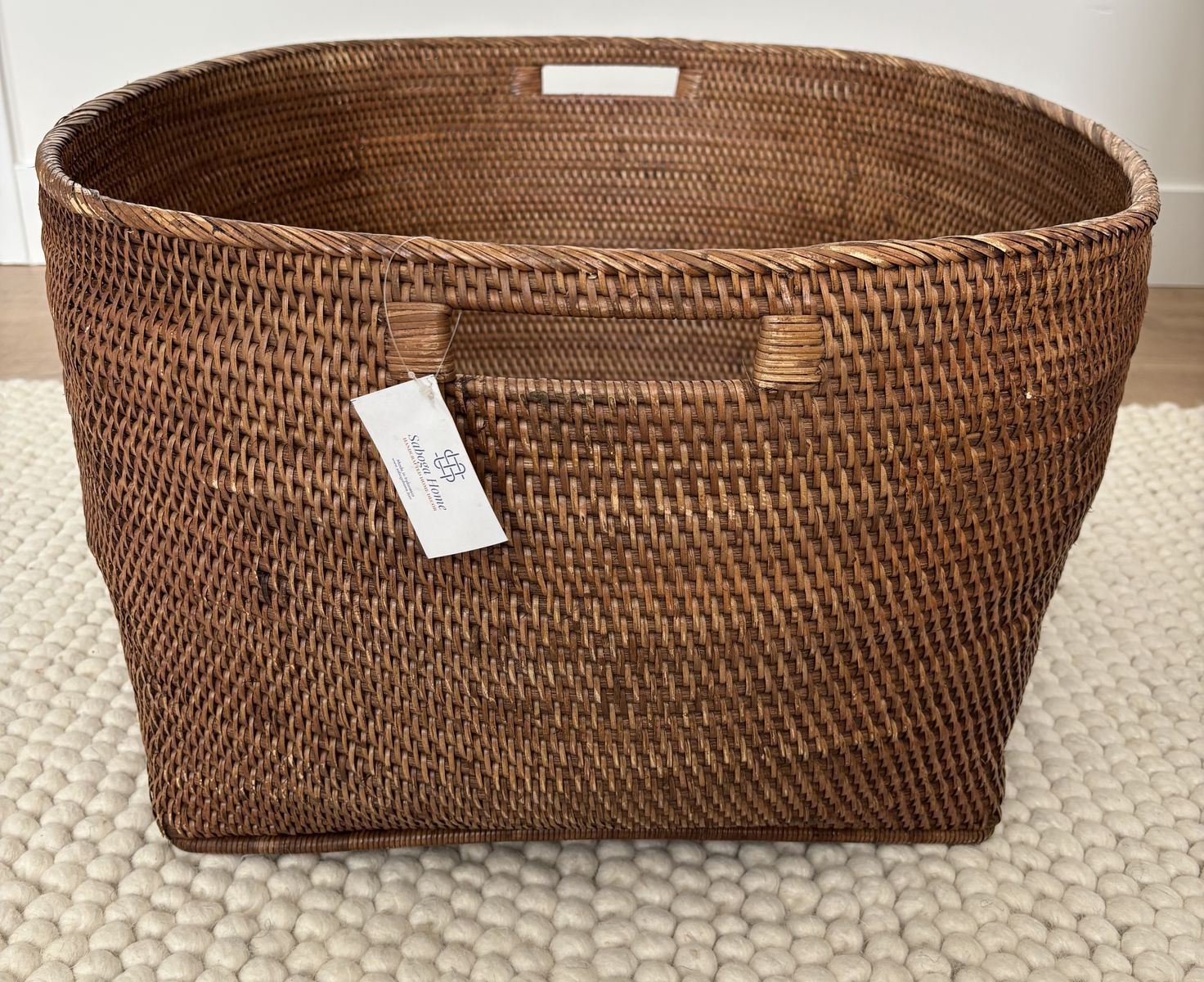 This is the stunning Saboga Home Family Basket with Cutout Handles from Artifacts Trading Company – a premium, artisan-crafted beauty made from 100% natural Burmese rattan in rich honey brown.