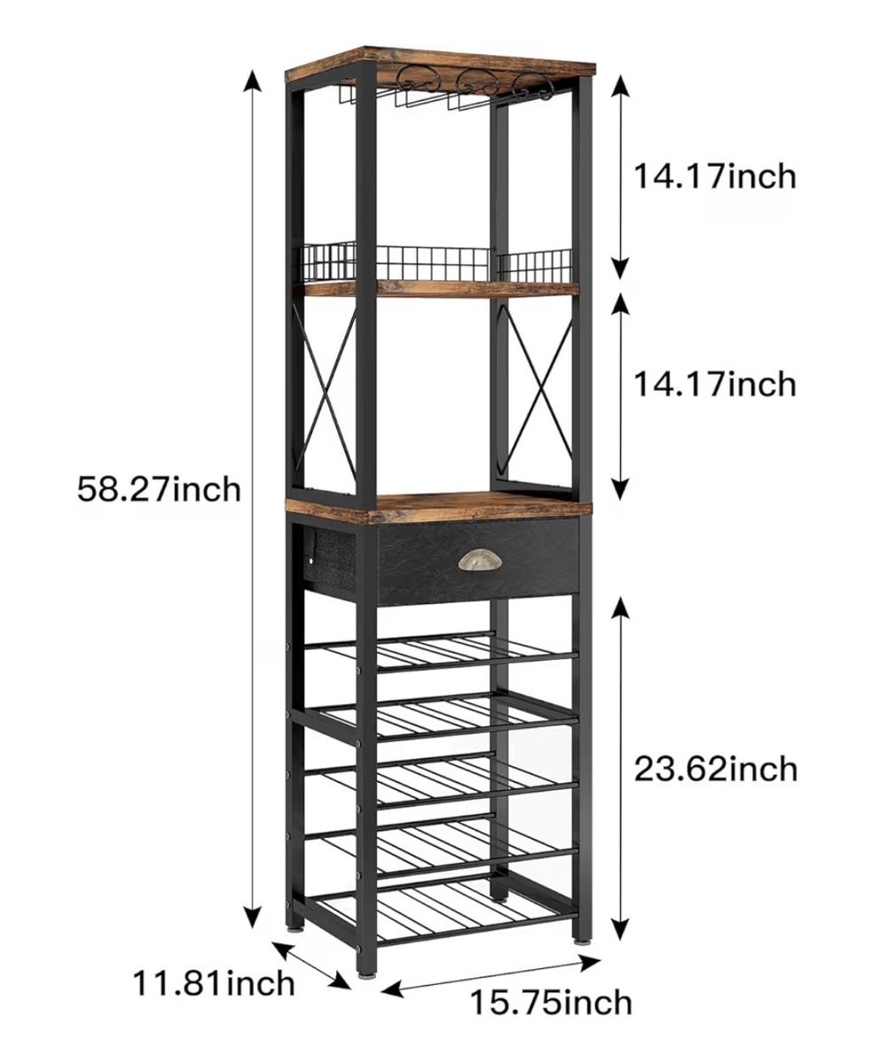 ApplePayWine Rack Freestanding Floor, Bar Cabinet for Liquor and Glasses, 4-Tier bar Cabinet with Tabletop, Glass Holder, Storage Drawer and Wine Storage (20) bottles. Barely used. Dimensions are in final picture. Message or text if interested.