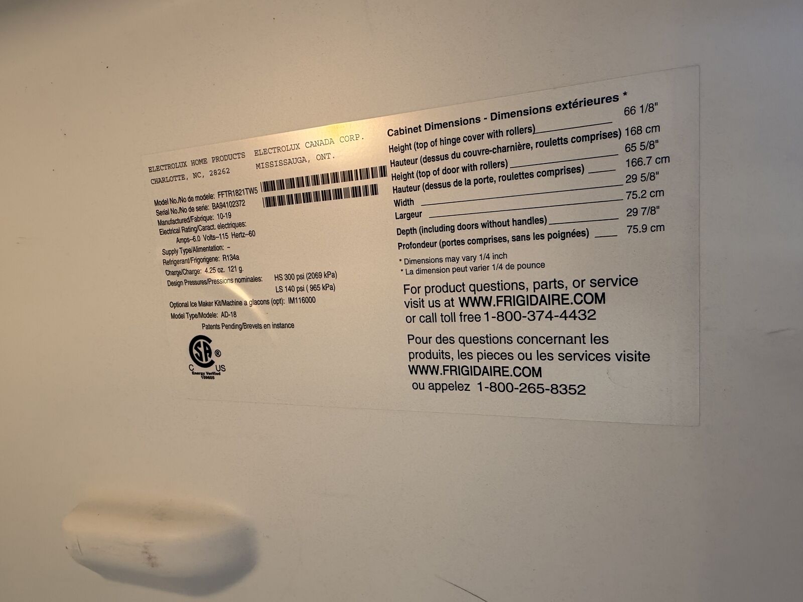 VenmoFrigidaire top-freezer refrigerator, model FFTR1821TW5. 18 cubic feet.