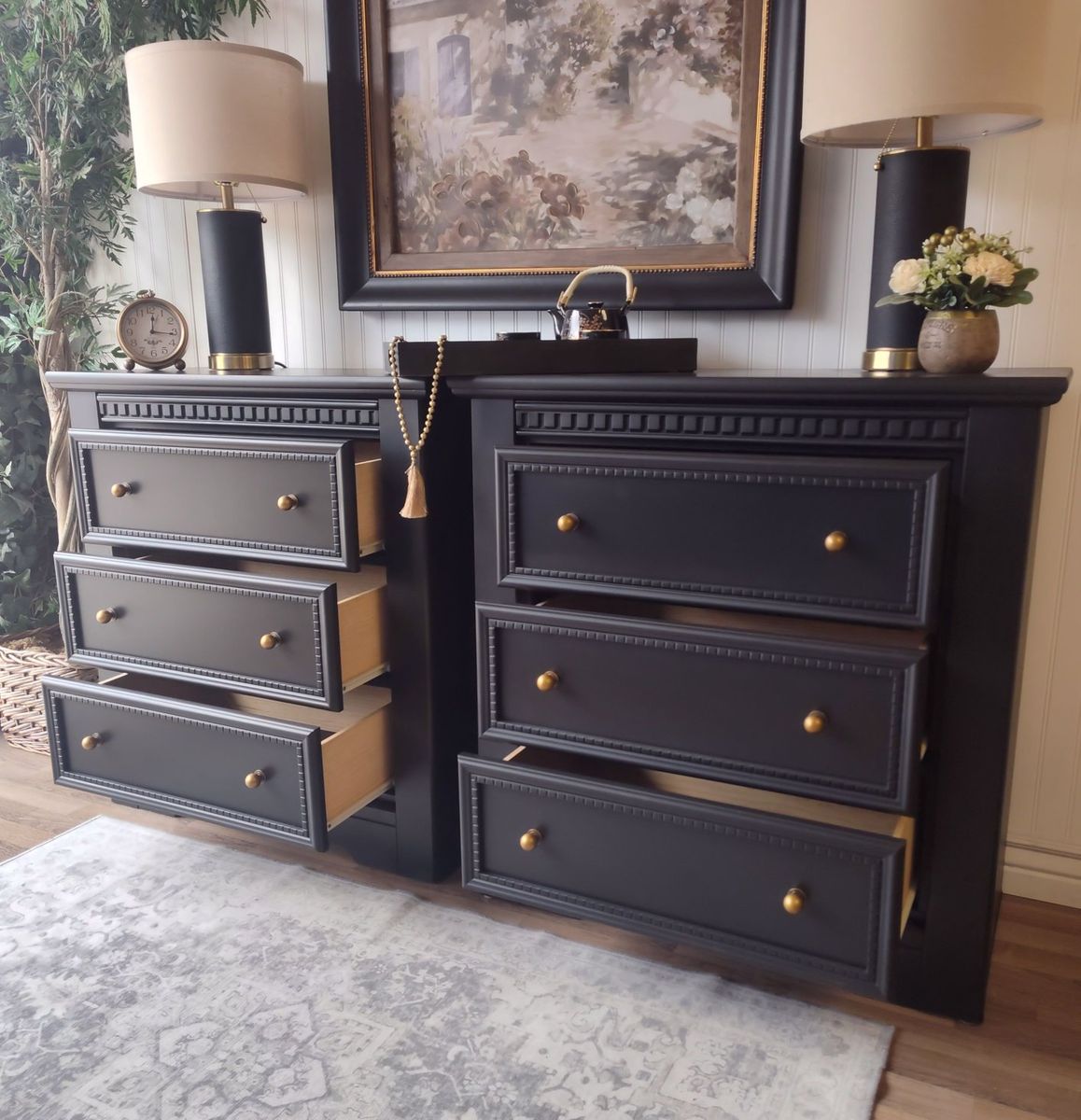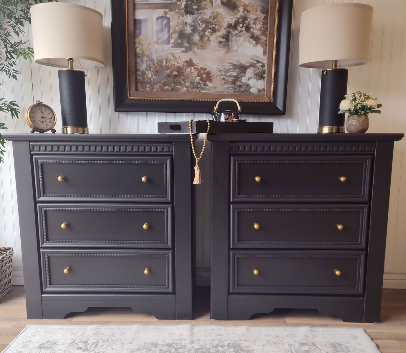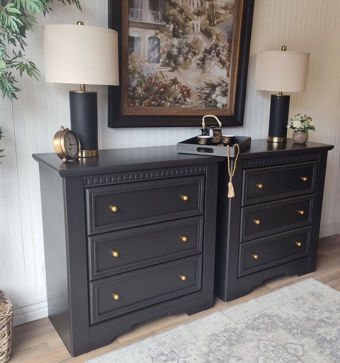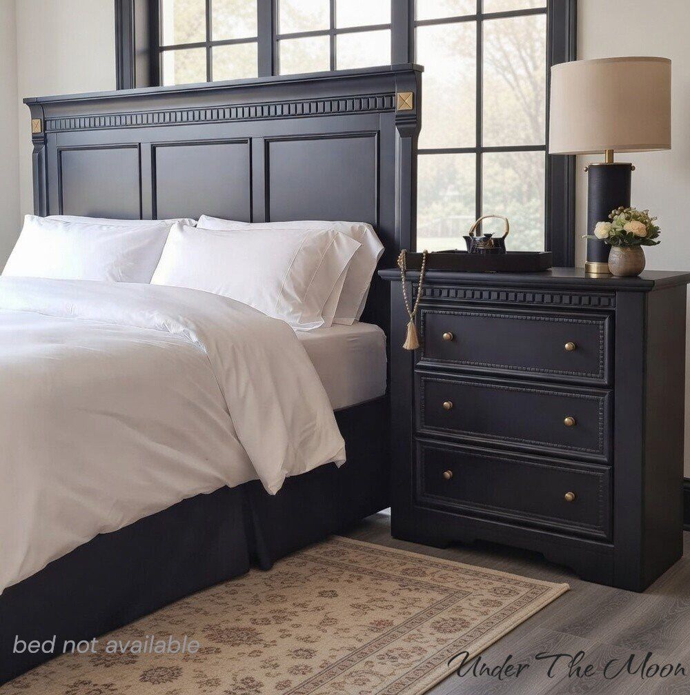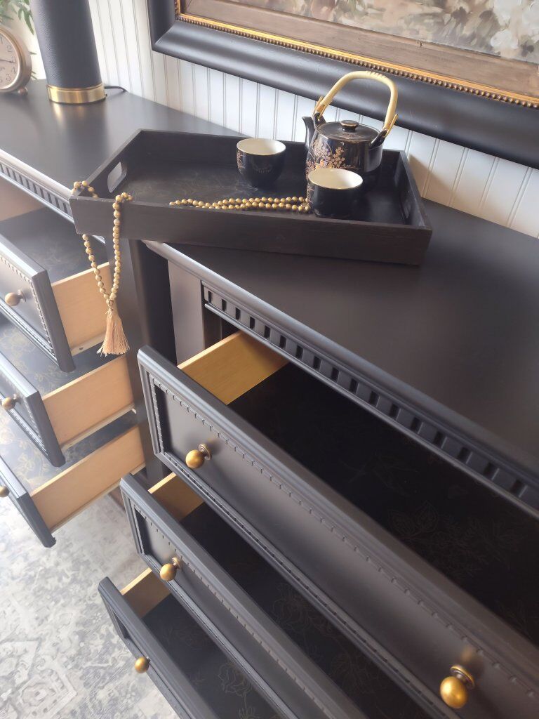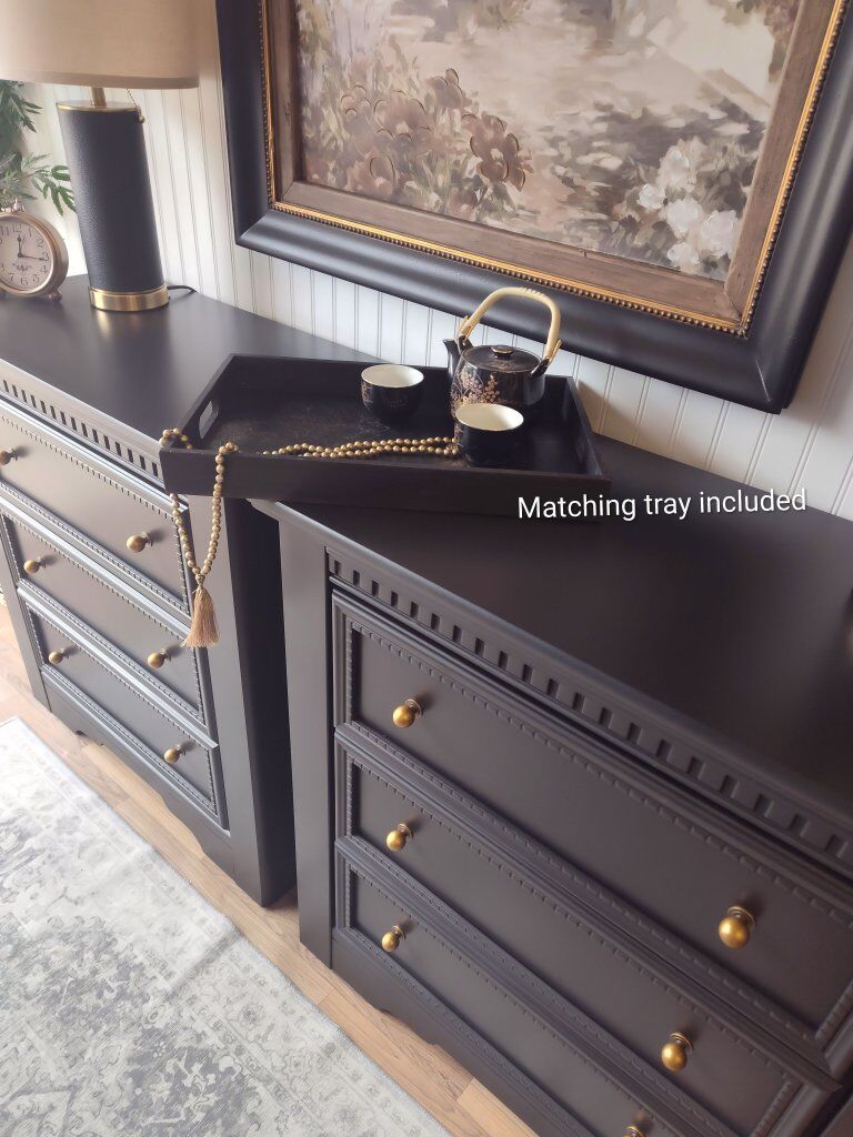 These feature: • Extra-large proportions – ideal beside king or queen beds and plenty of room for storage • Professionally refinished in a deep, rich black • Finished using top-quality enamel paint for lasting durability • New brass ball knobs for timeless warmth and contrast • Motion-sensor, rechargeable light in top drawer (detachable + 3 warmth settings) • Manual push-lights in lower drawers • Dark floral “hummingbird” drawer liner – sealed for long-term adhesion • Touch-up kit included • Refinished backs and bottoms – finished from every angle • Added slider feet make these a breeze to move across flooring • Soft sanded- makes these silky smooth to touch. They don't "feel painted" • Carefully foam-wrapped for safe transport • Matching coordinating tray included