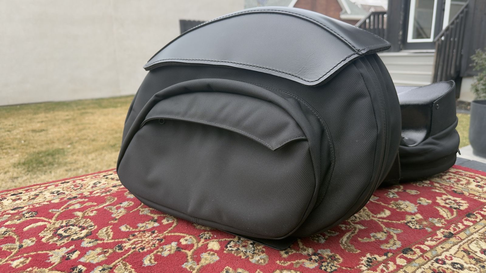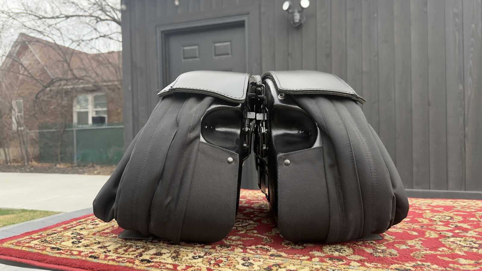 Secure quick-detach mounting system Molded back for closer fit Expandable for X-Large capacity 1050 Denier Anti-Abrasive CORDURA® Ballistic Nylon exterior Double Layered 9oz Full Grain Leather Lid Lockable to the bike Mounting Hardware Included Compatible with most exhaust systems Made in USA