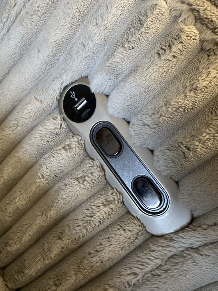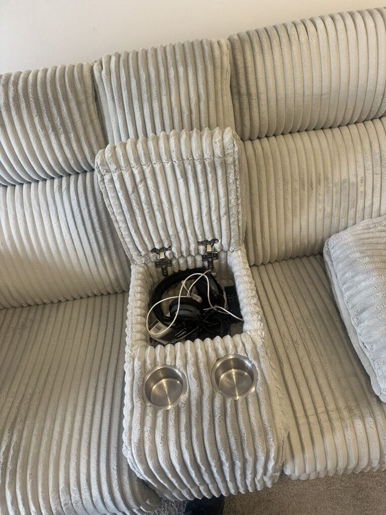 Fabric Power Glider Reclining Console Loveseat in Gray with USB Charging Ports and 2 Comfort Pillows. Have Only Had it for 9 months. Basically brand new.