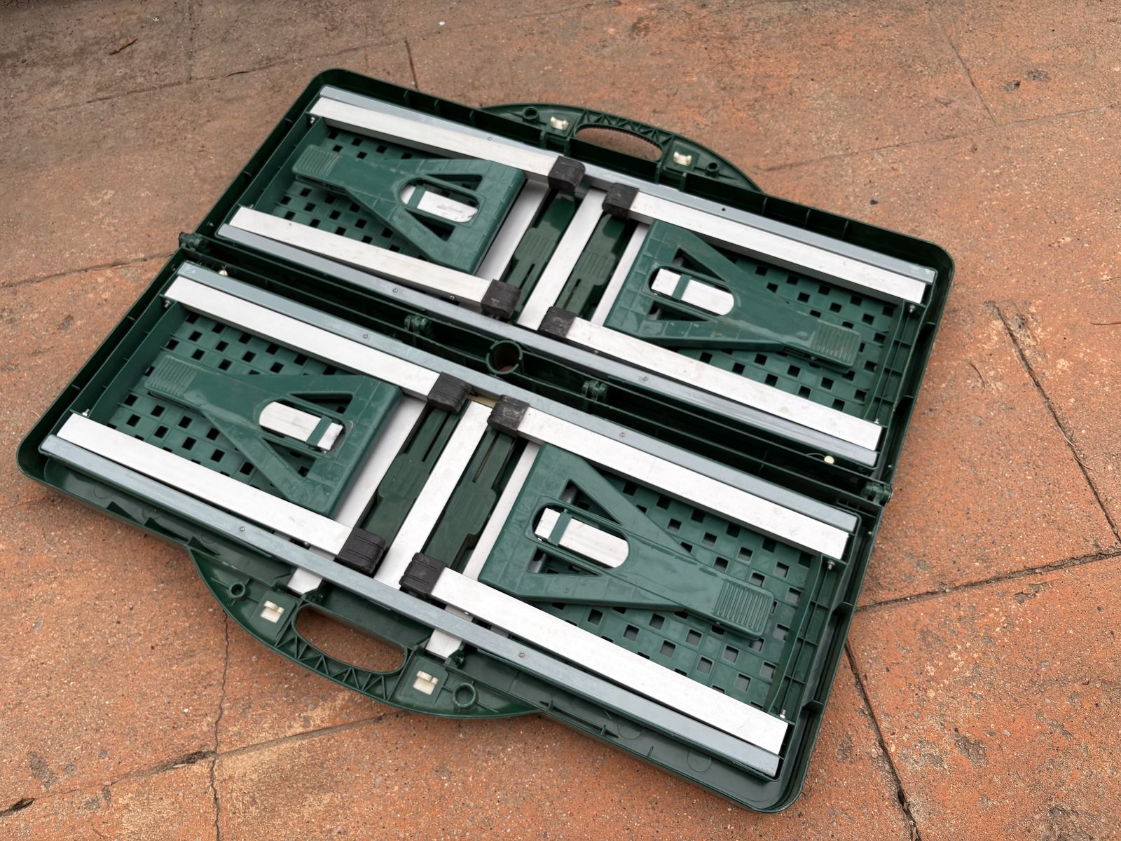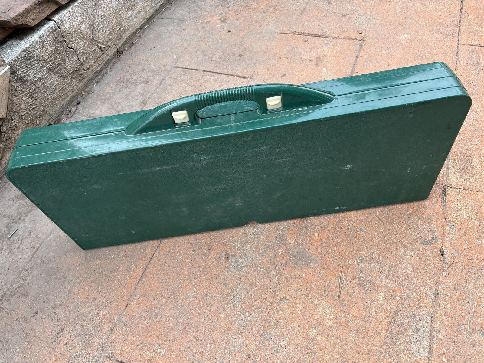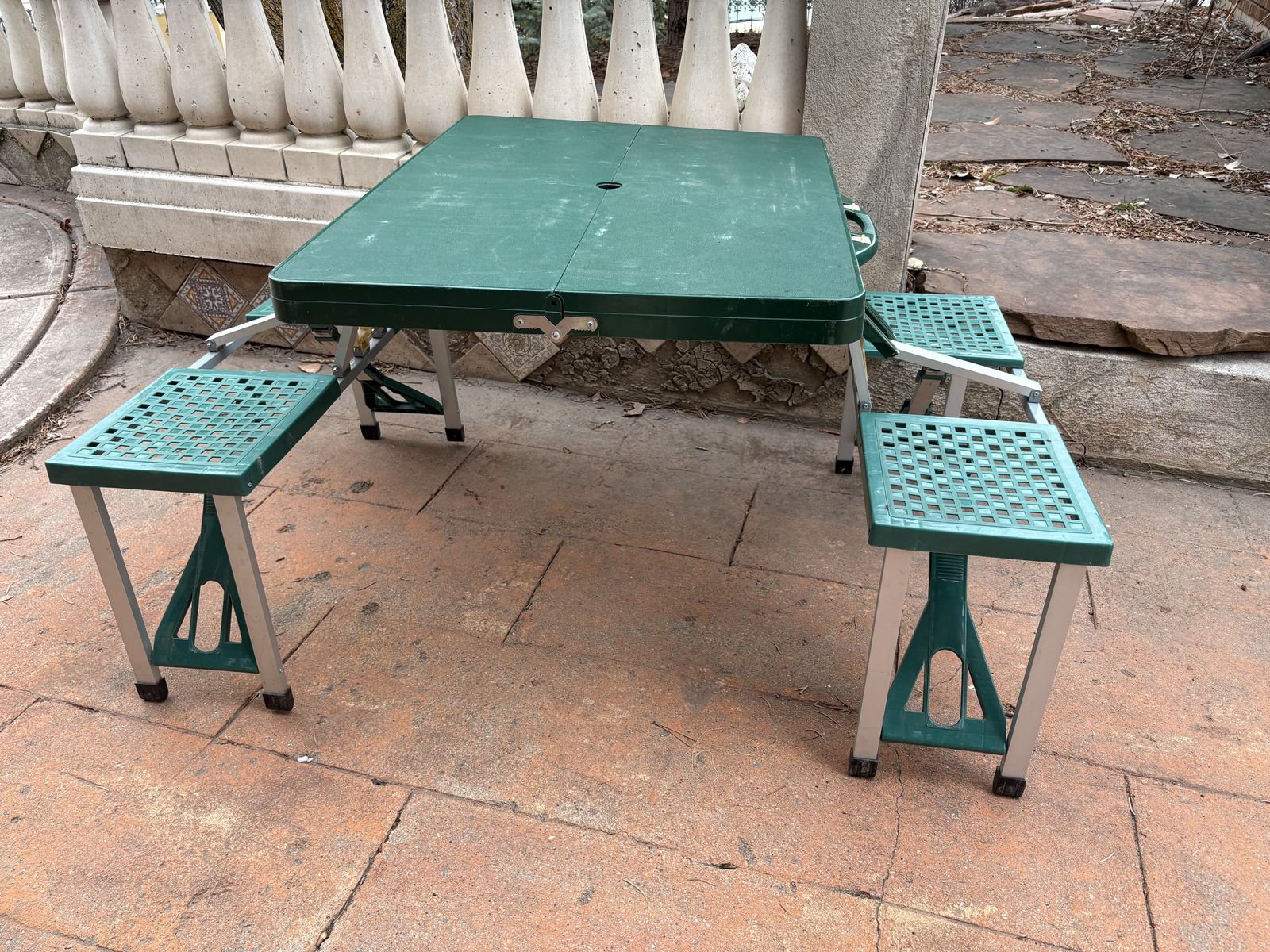 I have a small green folding picnic table with 4 attached chairs. When folded up it is 33 1/2 inches by 12 3/4 inches (not counting the handle). When set up it is 48 inches by 33 1/2 inches. It is 27 inches tall. It’s about $158 on Amazon and is sold at camping stores for about the same. It has a hole for an umbrella in the center. See my other ads for jewelry, artwork, home decor and more.