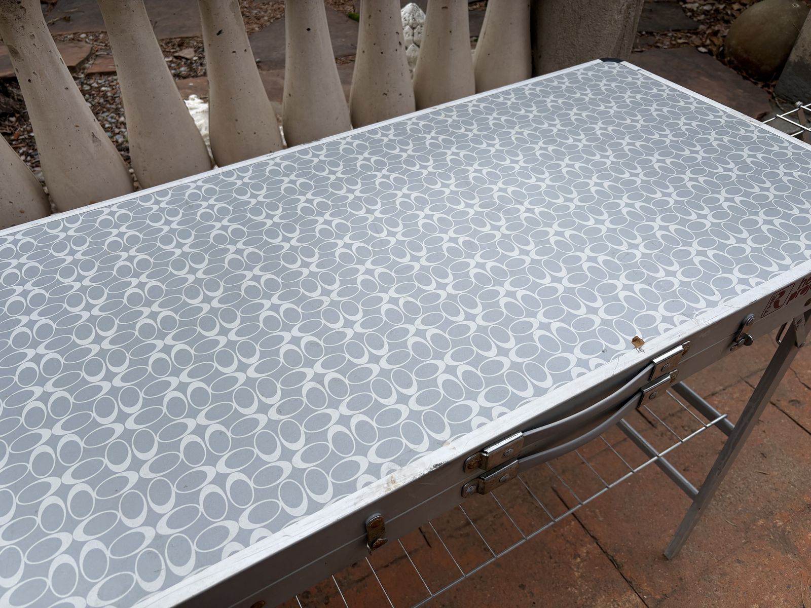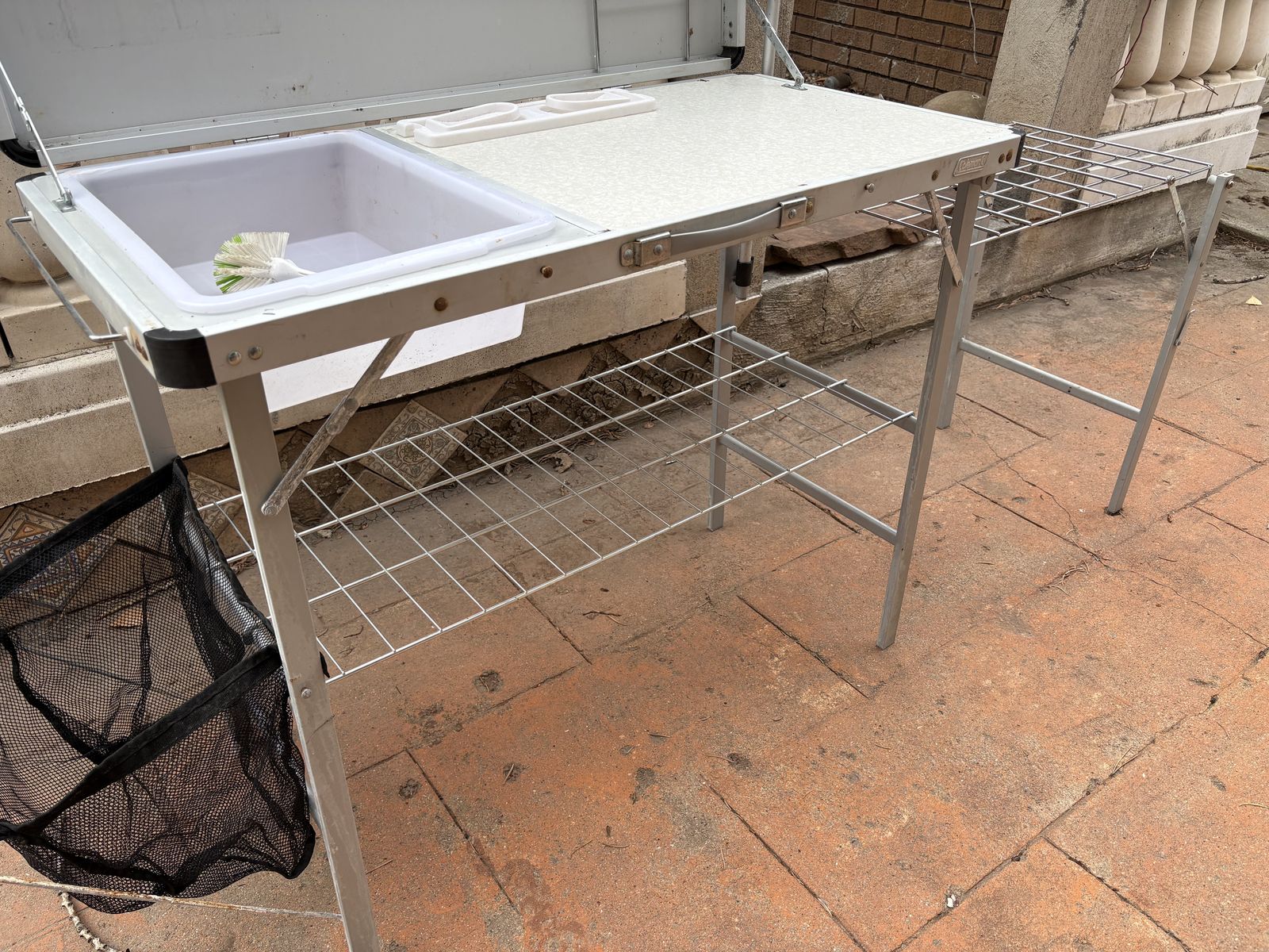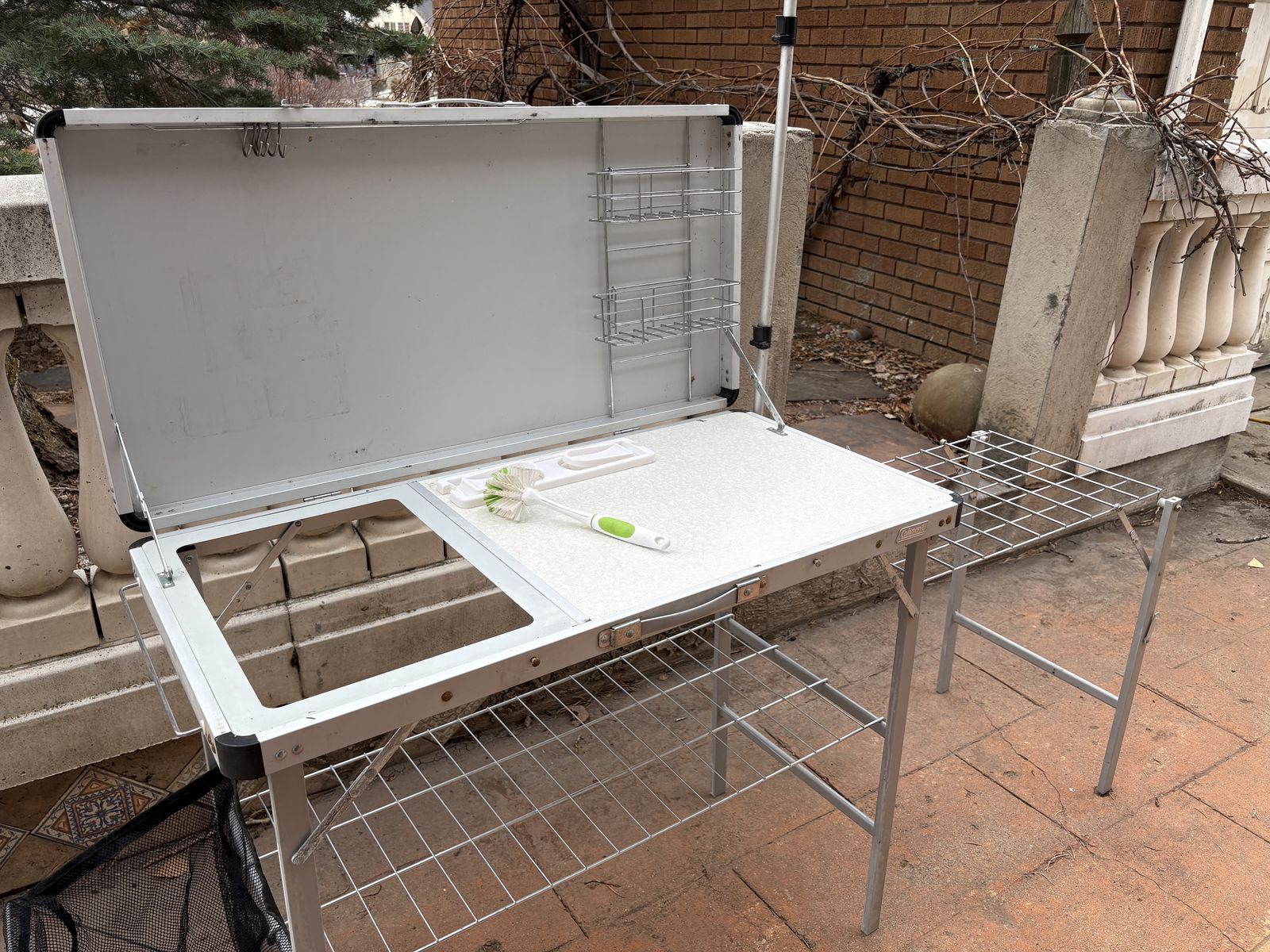 I have a vintage gray Coleman Pack-Away camping kitchen. It folds up to 39 1/2 inches by 19 3/4 inches which is the size of the main counter space. When opened up with the side counter and foldout garbage area it is 72 1/2 inches long. It has a removable shelf underneath, a removable stand to hold a lantern, a plastic paper towel holder you can stick on the back, a removable side counter area, a pullout dish towel holder on the side, hooks and removable bins. When set up the counter is 32 inches tall. Unfortunately the plastic sink has cracked (see the closeup picture). It’s just a bin that can be pulled out and replaced. There is one small mark on the outside lid when closed (see the pictures). See my other ads for jewelry, artwork, home decor and more.