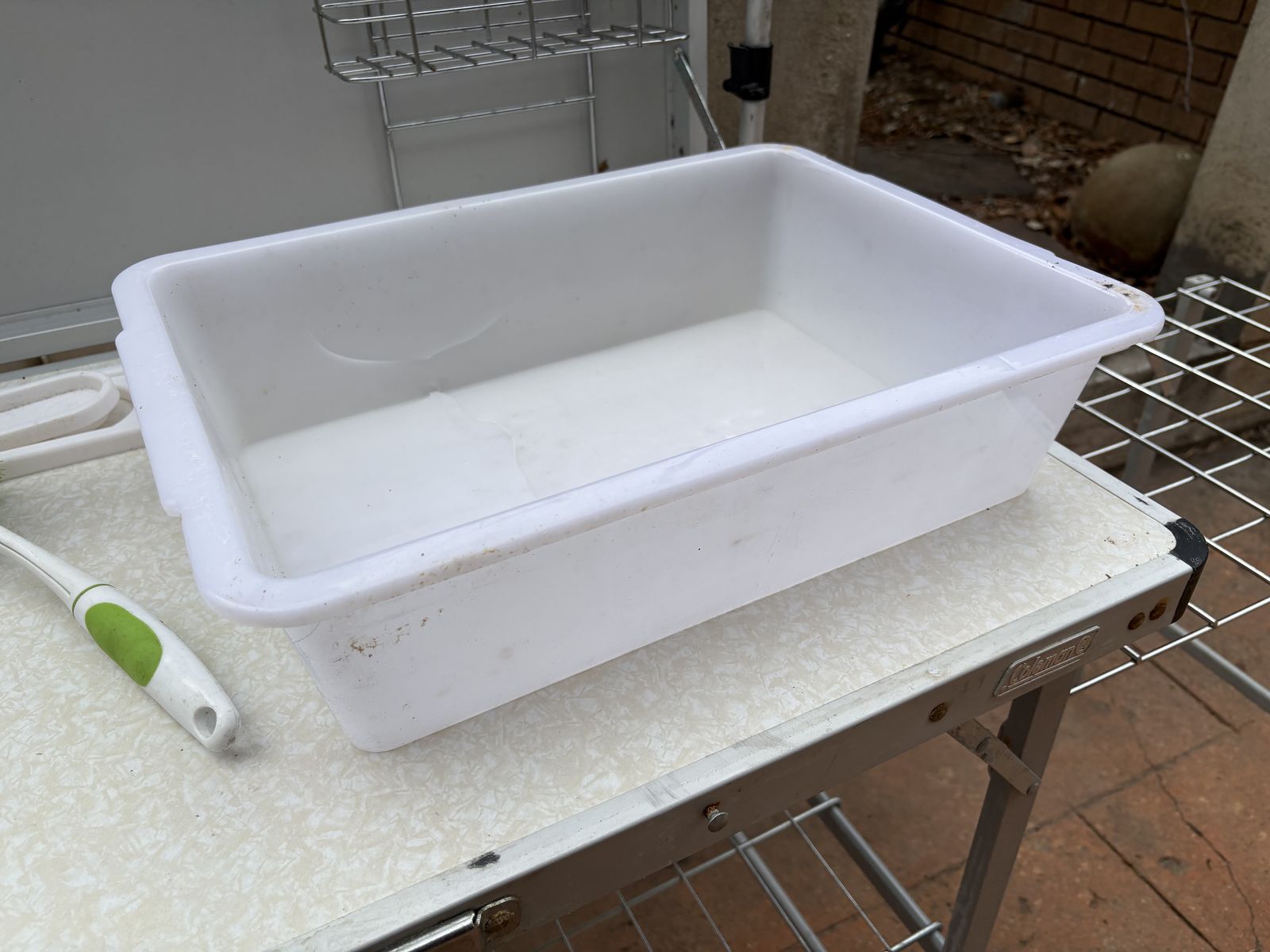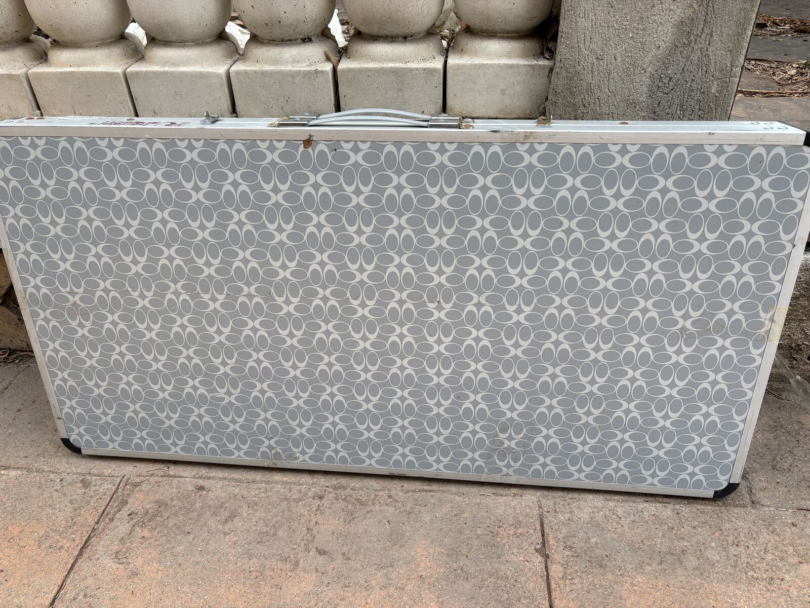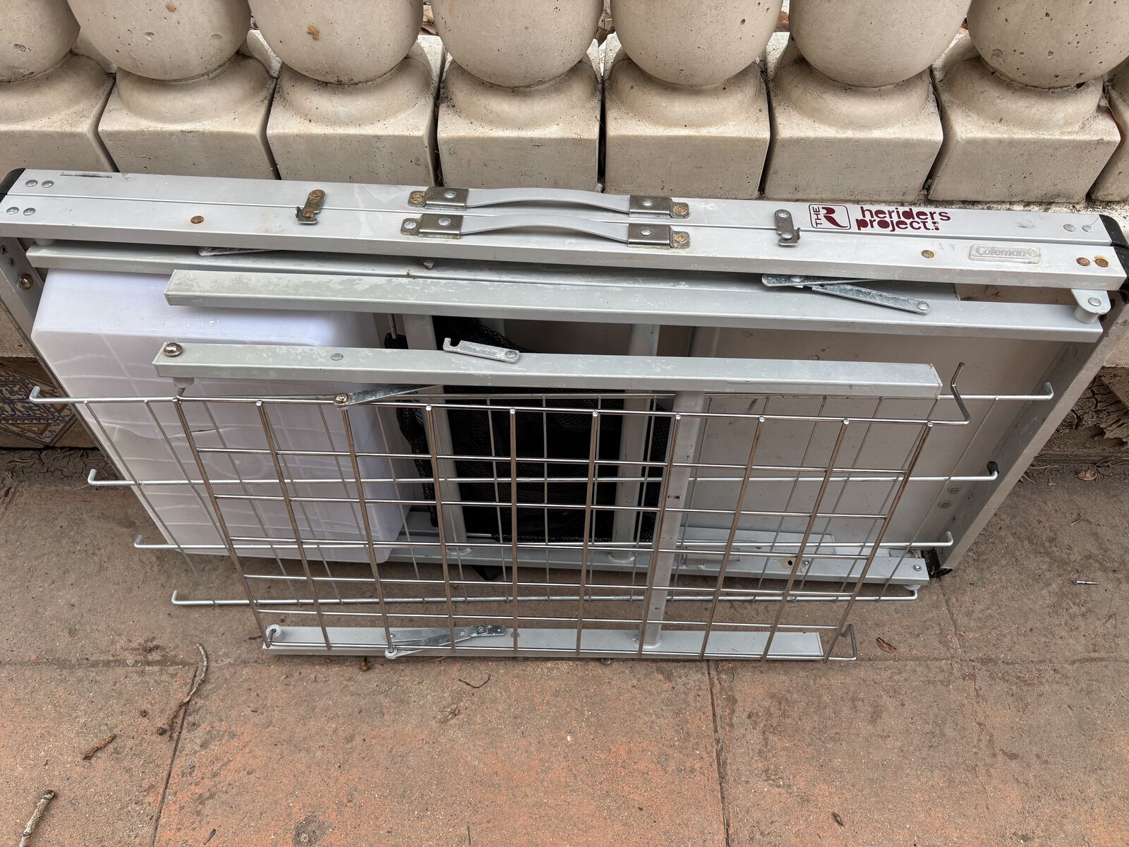 I have a vintage gray Coleman Pack-Away camping kitchen. It folds up to 39 1/2 inches by 19 3/4 inches which is the size of the main counter space. When opened up with the side counter and foldout garbage area it is 72 1/2 inches long. It has a removable shelf underneath, a removable stand to hold a lantern, a plastic paper towel holder you can stick on the back, a removable side counter area, a pullout dish towel holder on the side, hooks and removable bins. When set up the counter is 32 inches tall. Unfortunately the plastic sink has cracked (see the closeup picture). It’s just a bin that can be pulled out and replaced. There is one small mark on the outside lid when closed (see the pictures). See my other ads for jewelry, artwork, home decor and more.