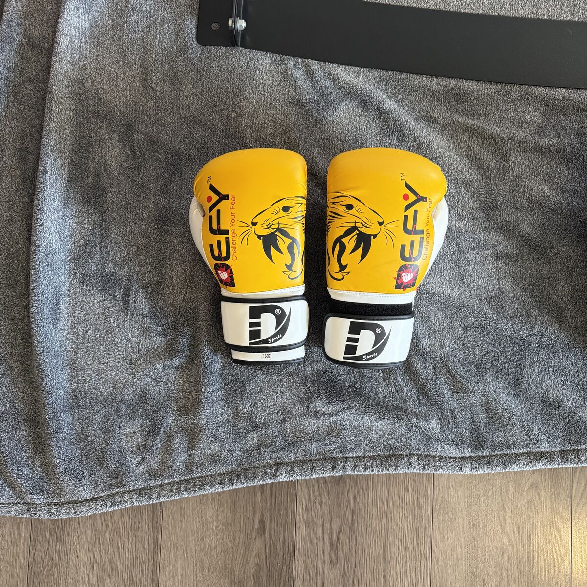 • FREE Gloves — Pair of 9Round black/white (12 oz) + pair of yellow Defy (Challenge Your Fear design, 12 oz) — both in good shape, included at no extra cost.