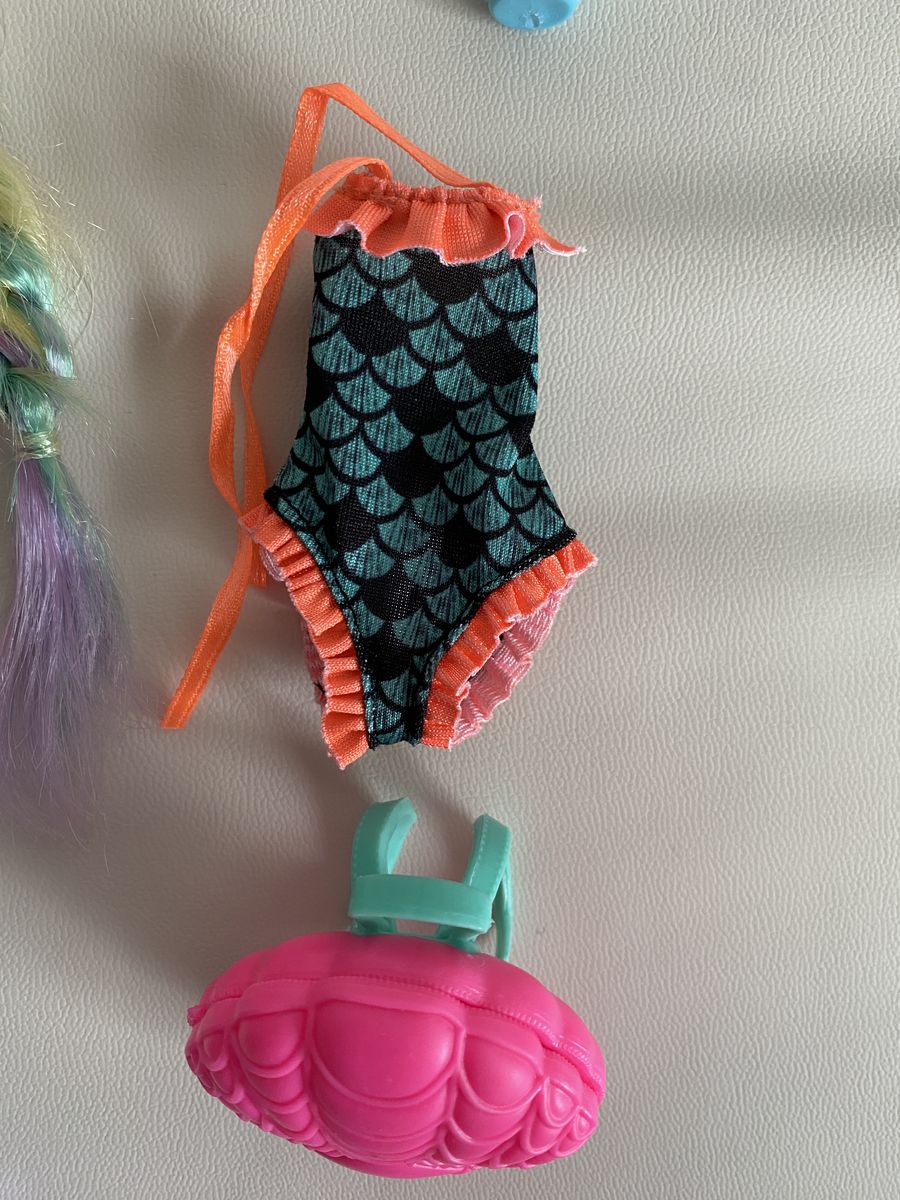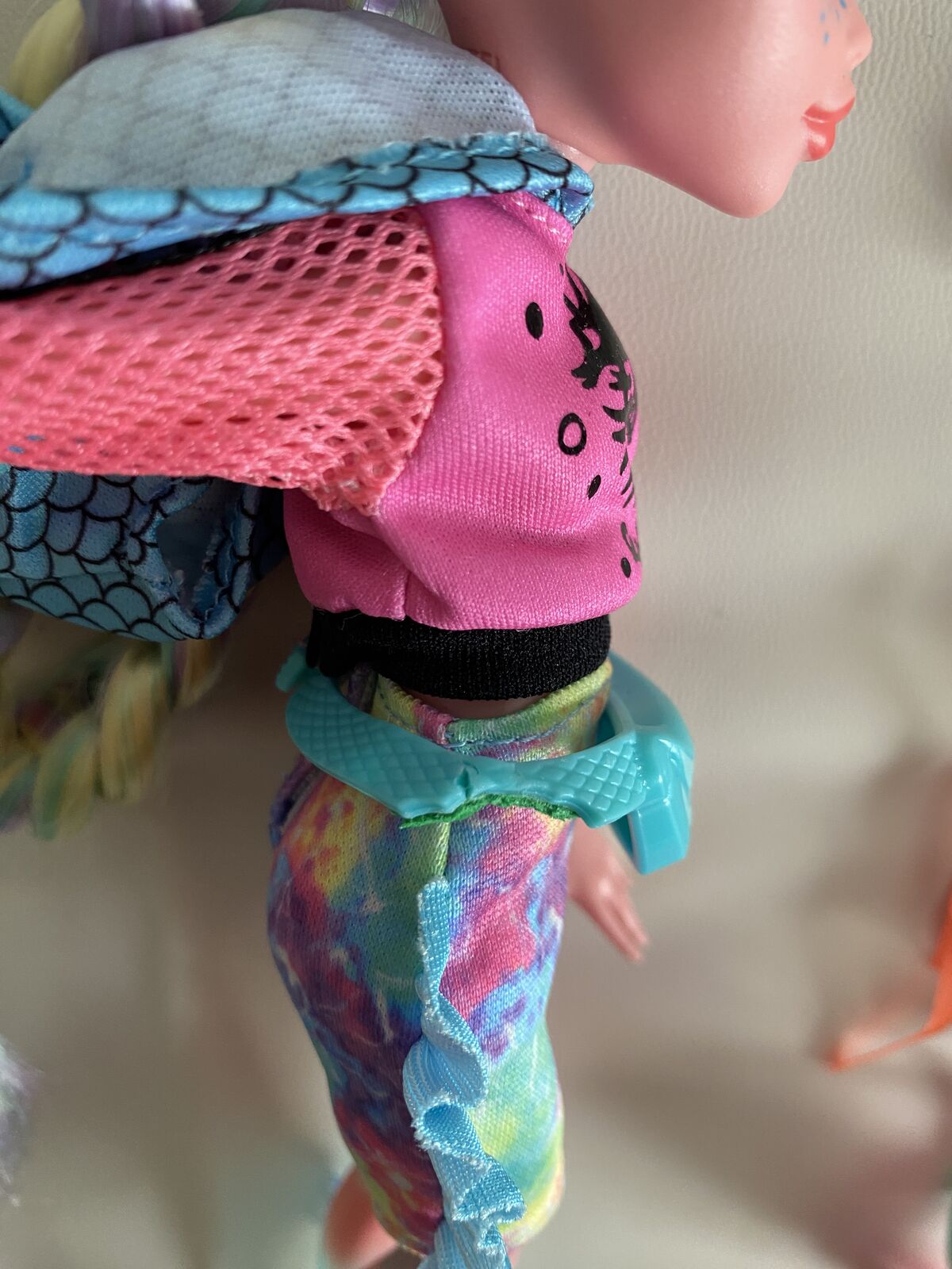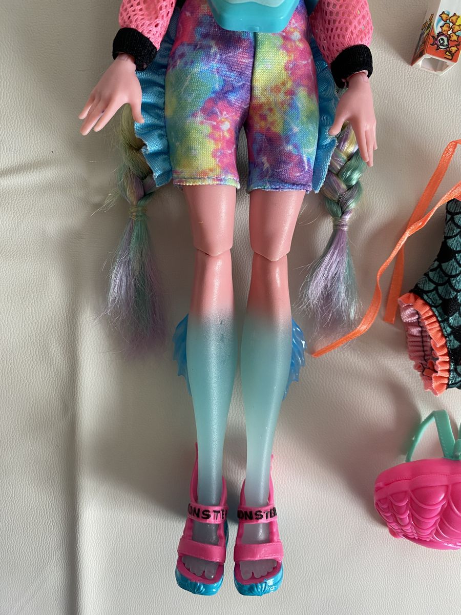 MH G3 core Lagoona Blue doll. Her fanny pack snapped, so it's been glued back together (please see photos). Her legs also have a few small chips. Other than that, she's in great condition. Comes with all of her accessories except for her necklace