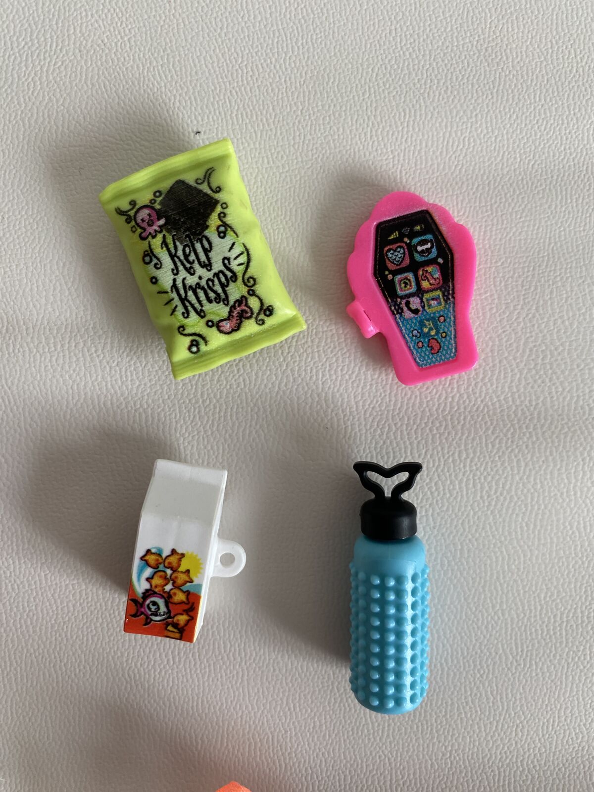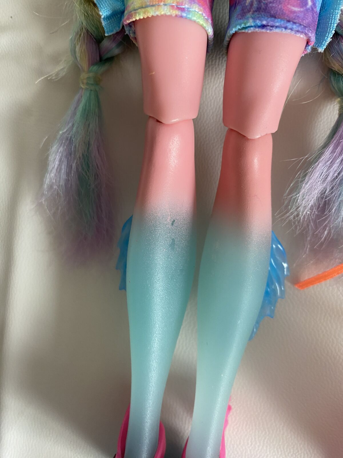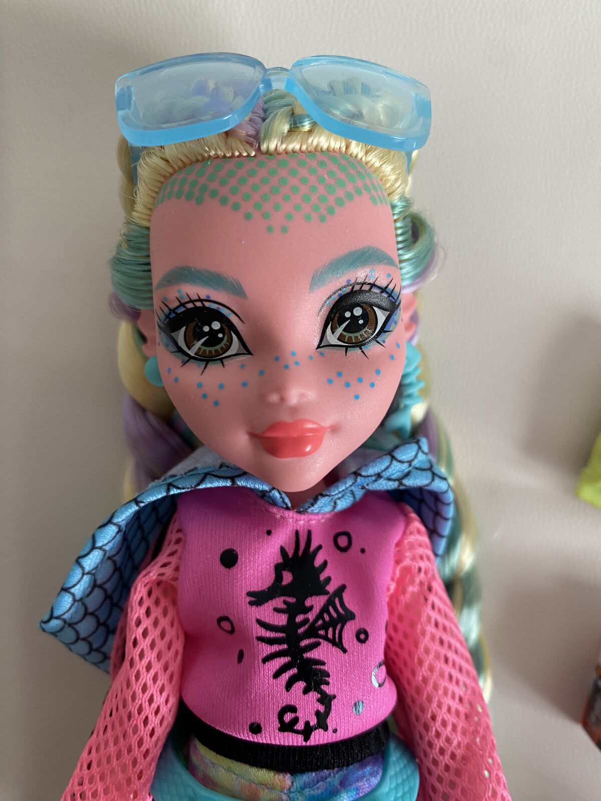 MH G3 core Lagoona Blue doll. Her fanny pack snapped, so it's been glued back together (please see photos). Her legs also have a few small chips. Other than that, she's in great condition. Comes with all of her accessories except for her necklace