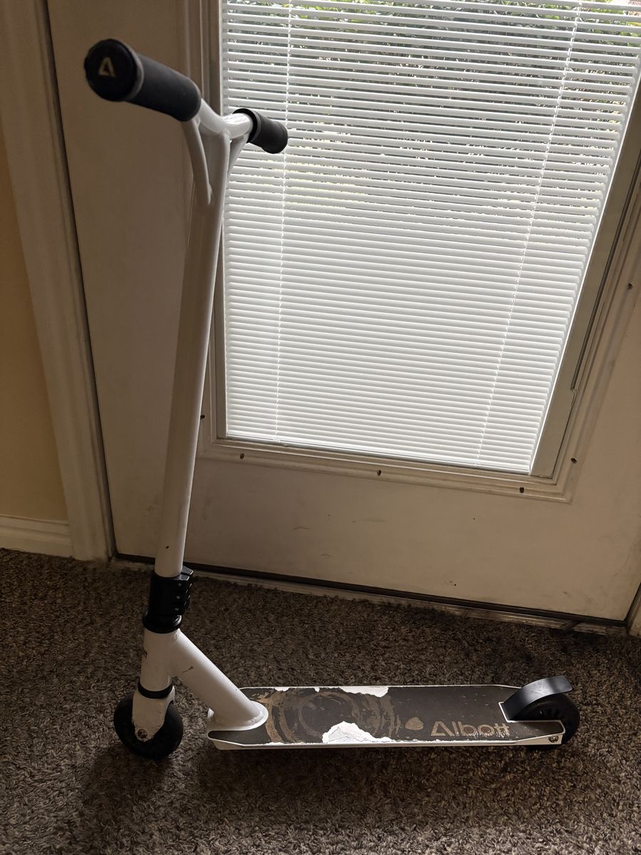 CashAppAlbott scooter, wheels hand grips and bearings good, grip tape on foot platform is a little worn. We are moving and My daughter has grown it. Height of handle bar is 31".