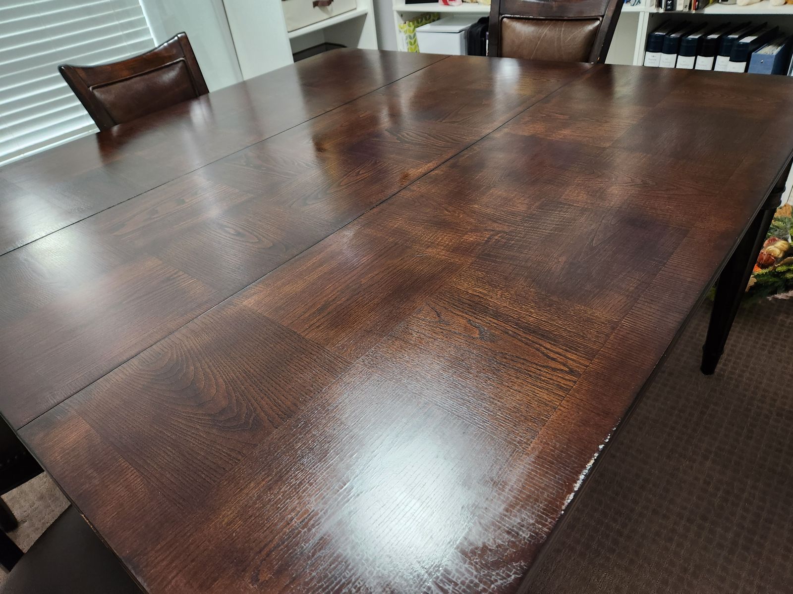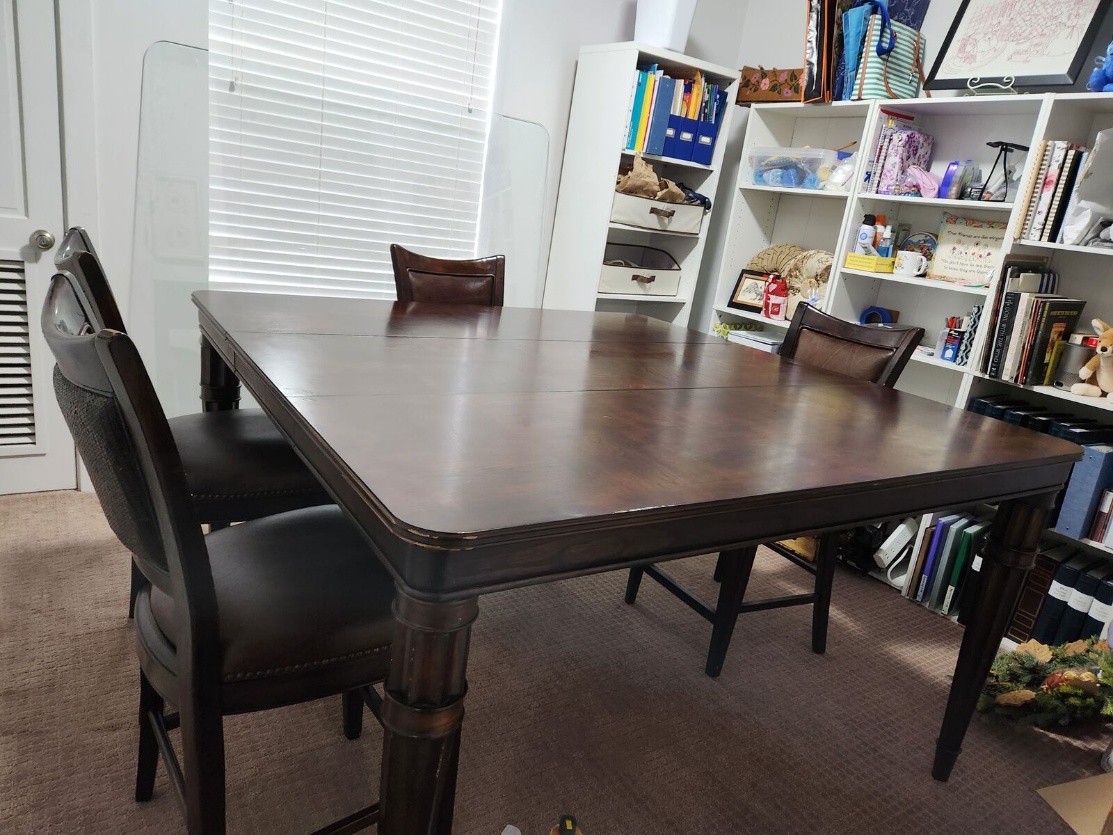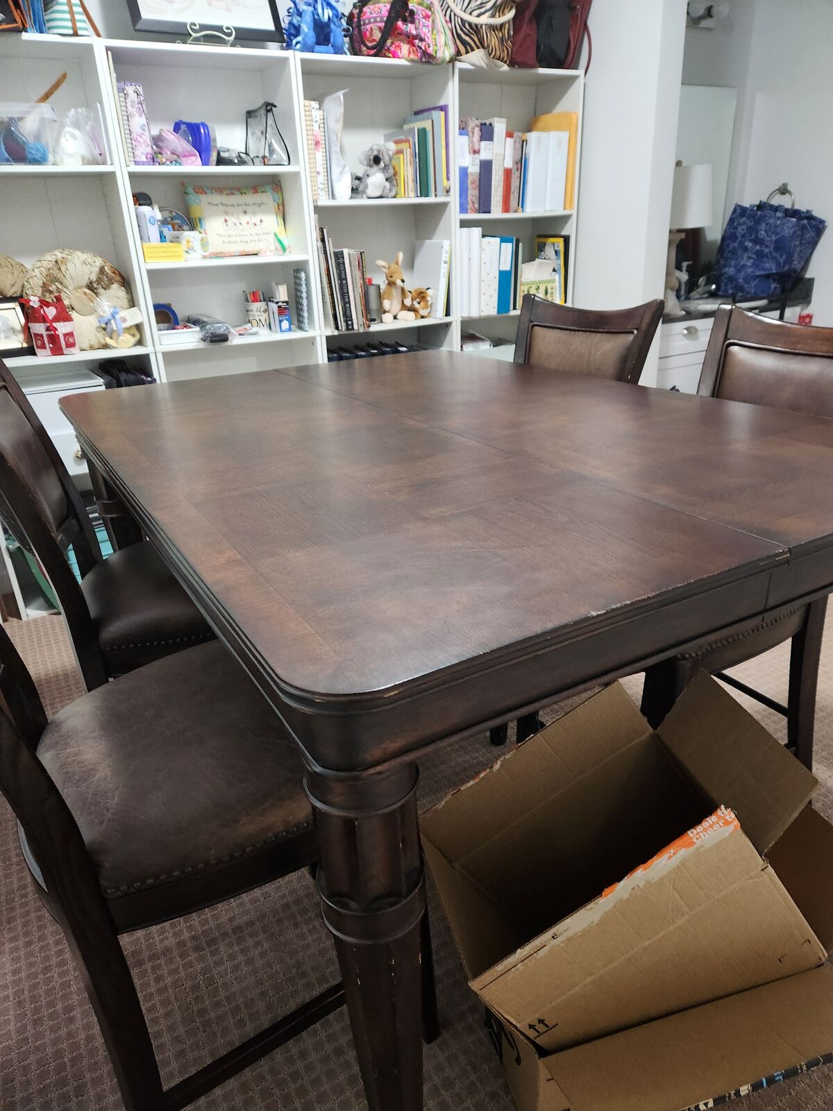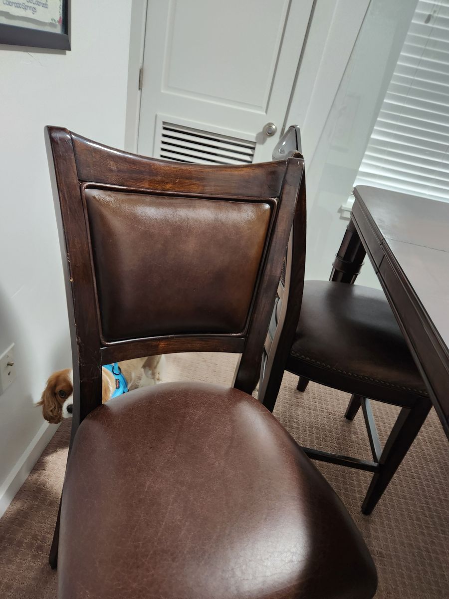ZelleMeasures 64x64 with leaf. 36x64 without leaf.36 inches tall. Chair 36 tall 18x18 seats. This table can be shorter by removing a section of the legs. The chairs fit the tall table.No cracks or tears on leather chairs