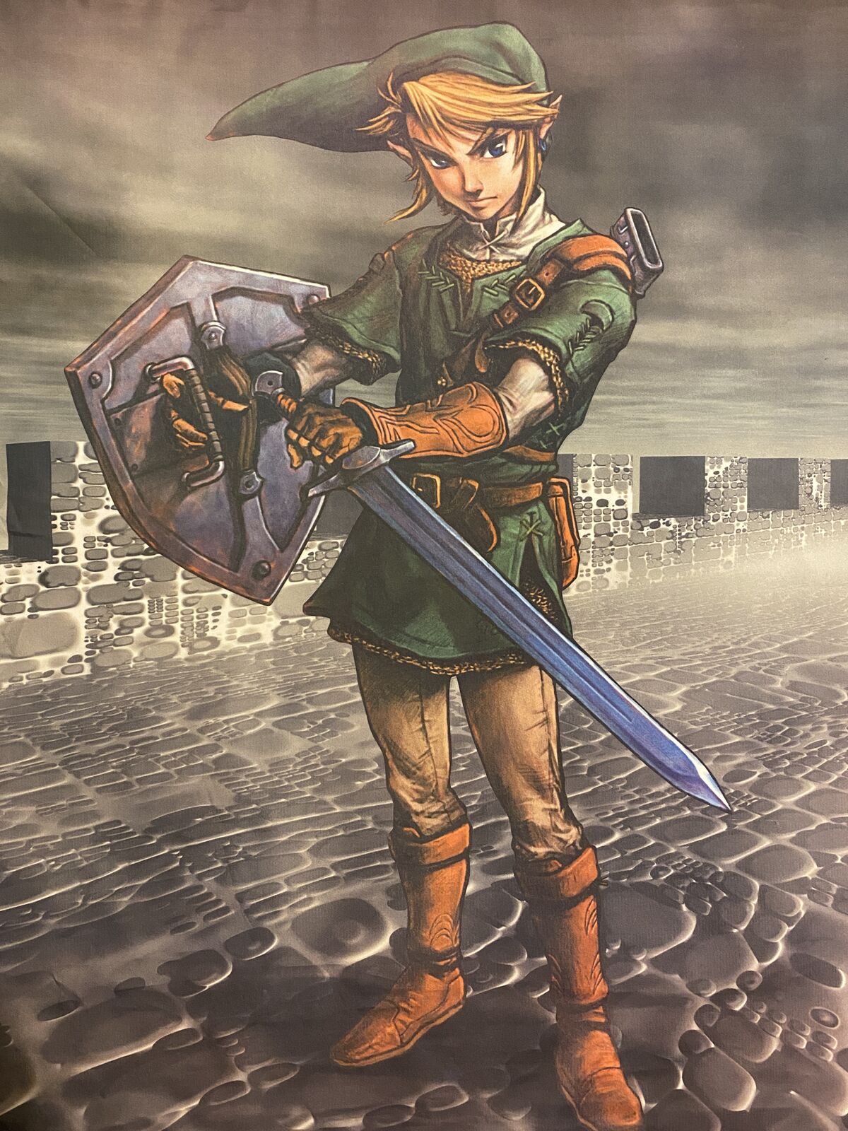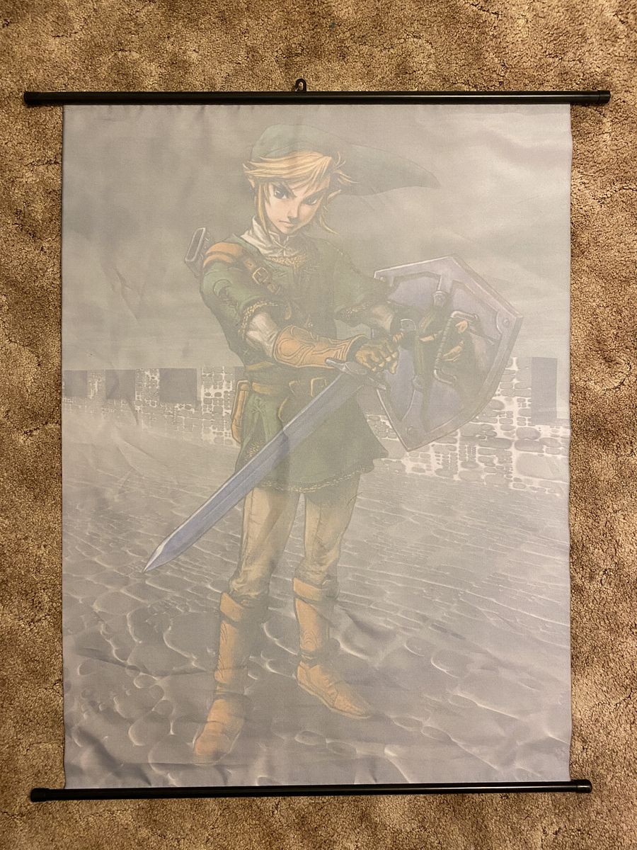 The Legend of Zelda: Twilight Princess Link fabric wall scroll. Measures about 29" wide by 39" long. In good condition