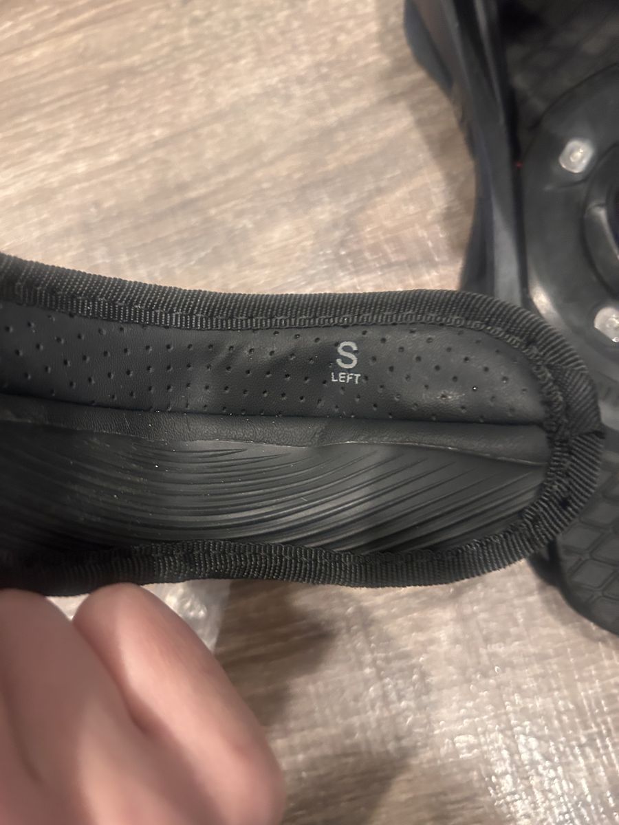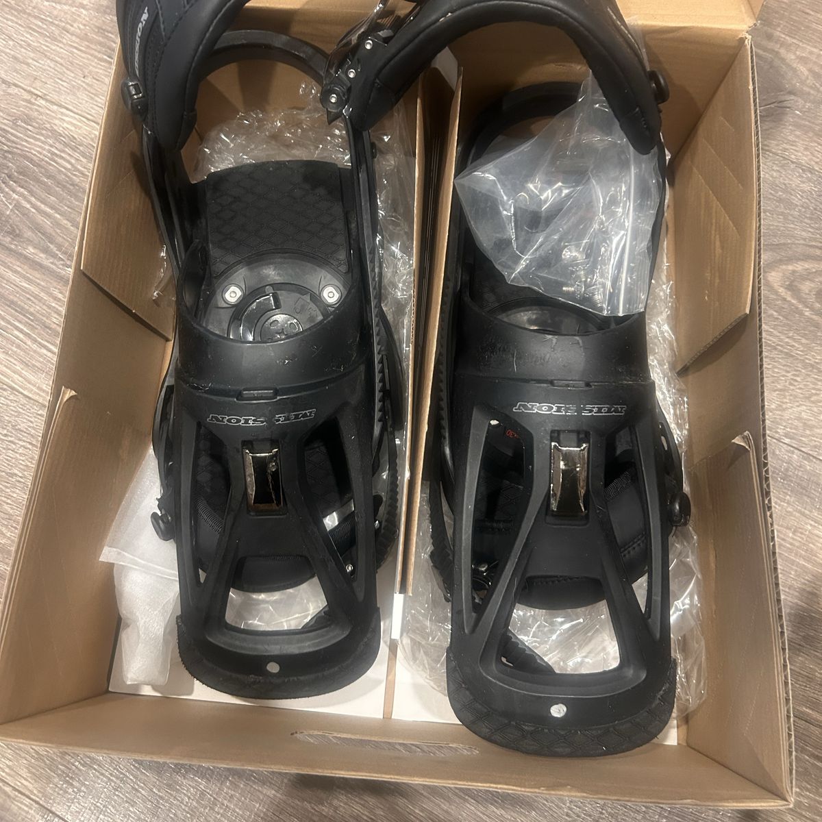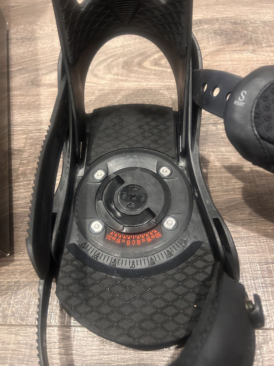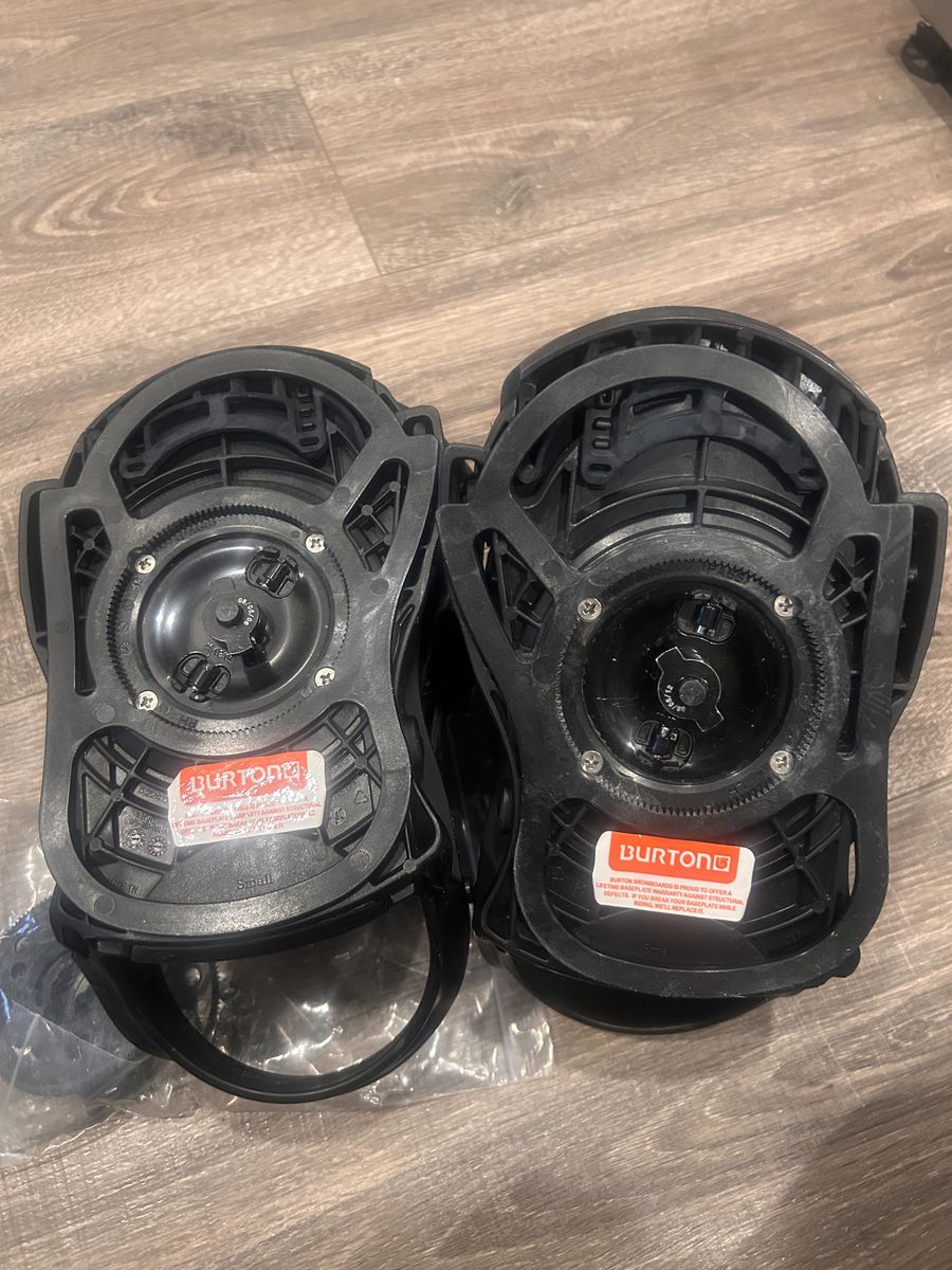 VenmoSize small, upgraded binding and these have been sitting in storage. Includes hardware- no call outs I can see, photos are of actual bindings.