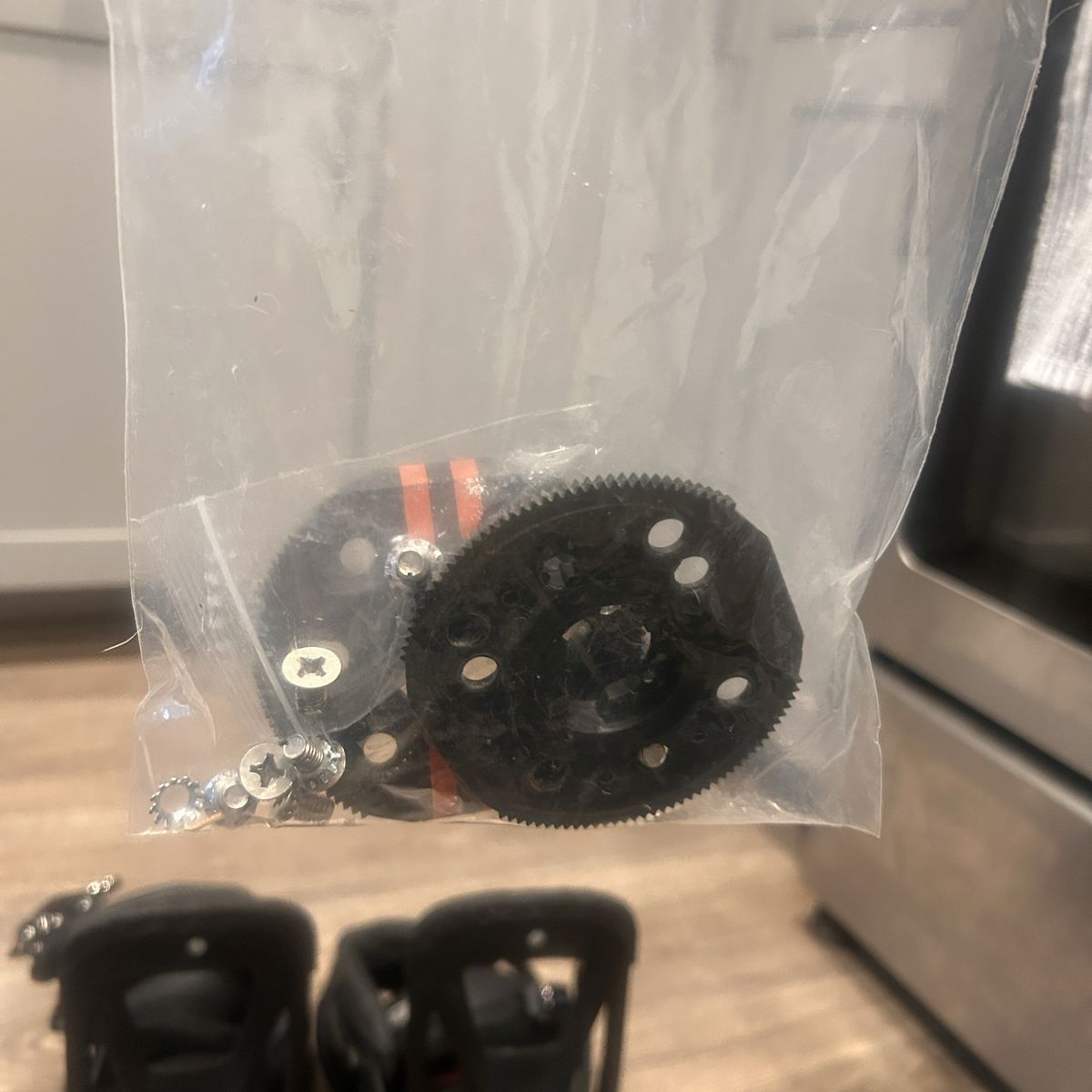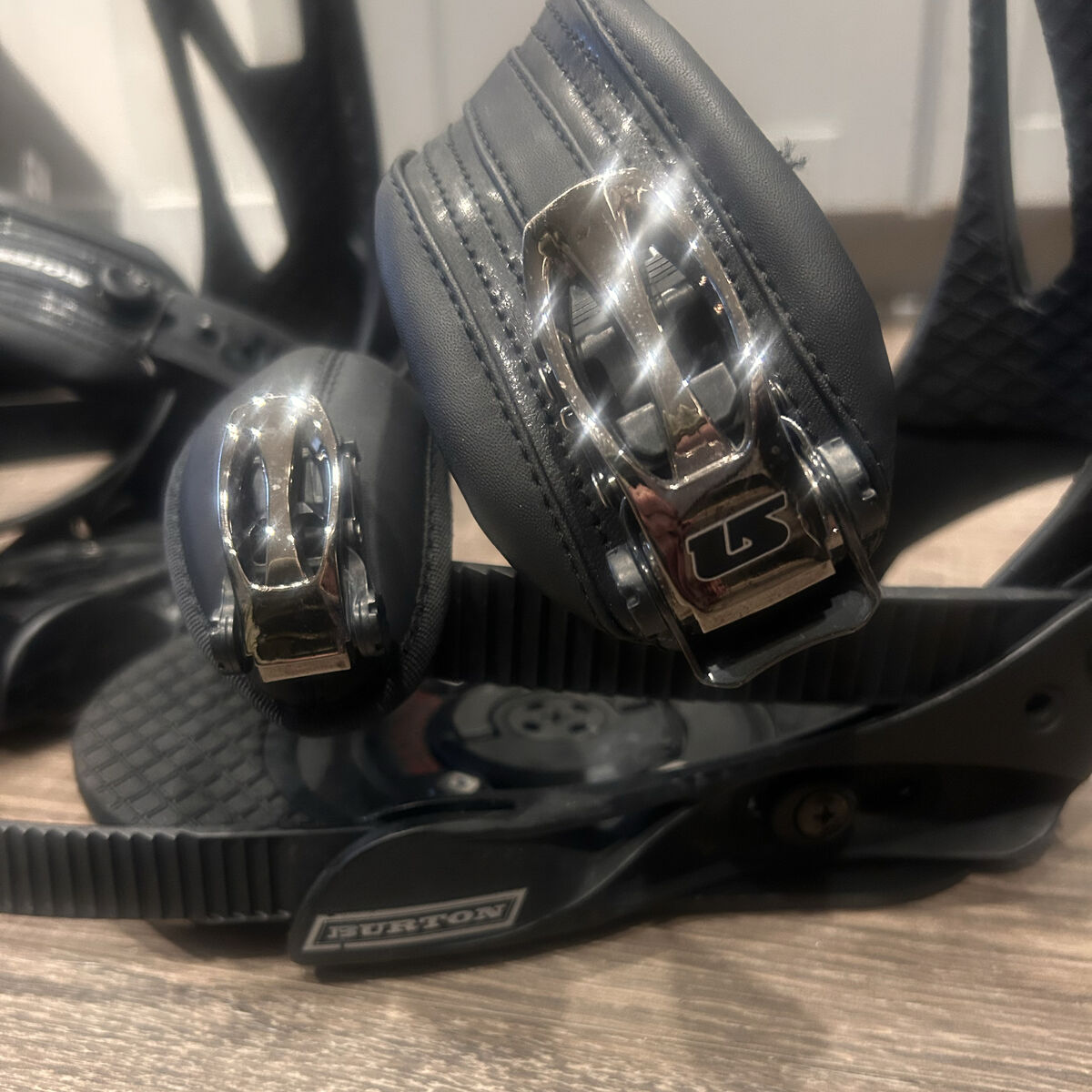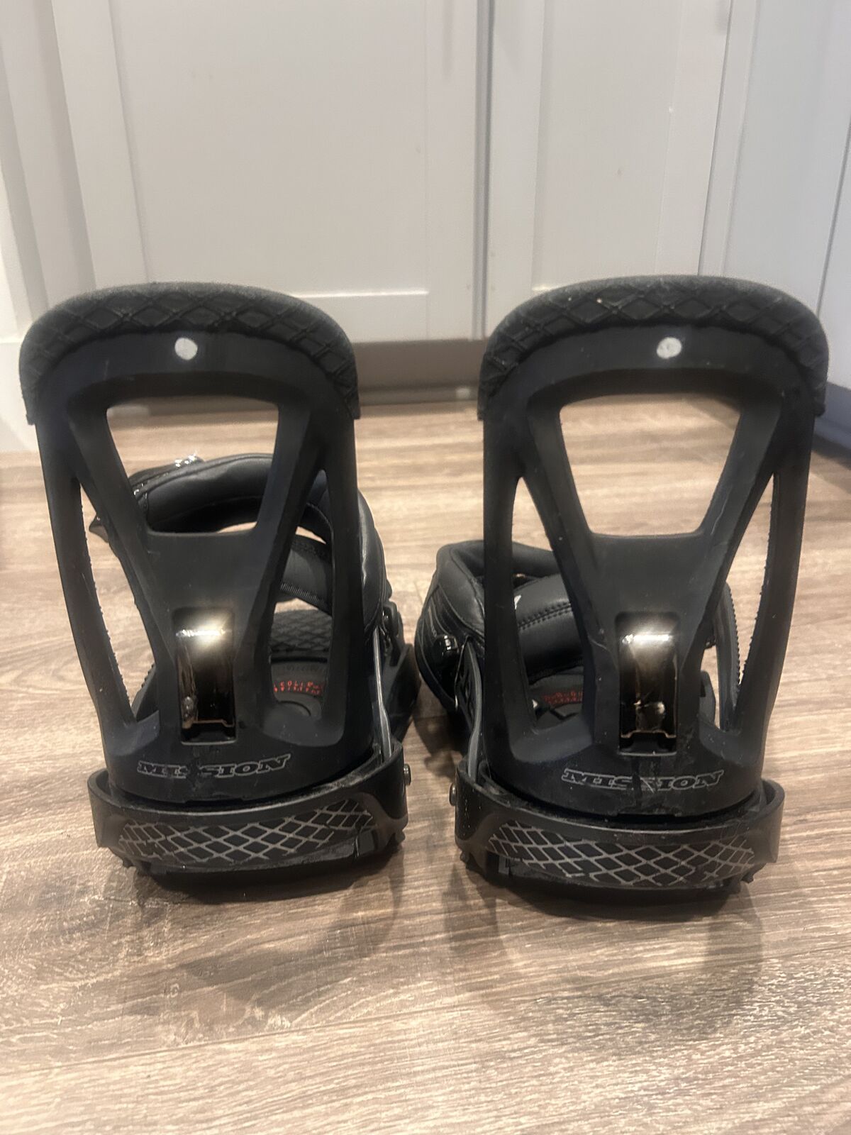 VenmoSize small, upgraded binding and these have been sitting in storage. Includes hardware- no call outs I can see, photos are of actual bindings.