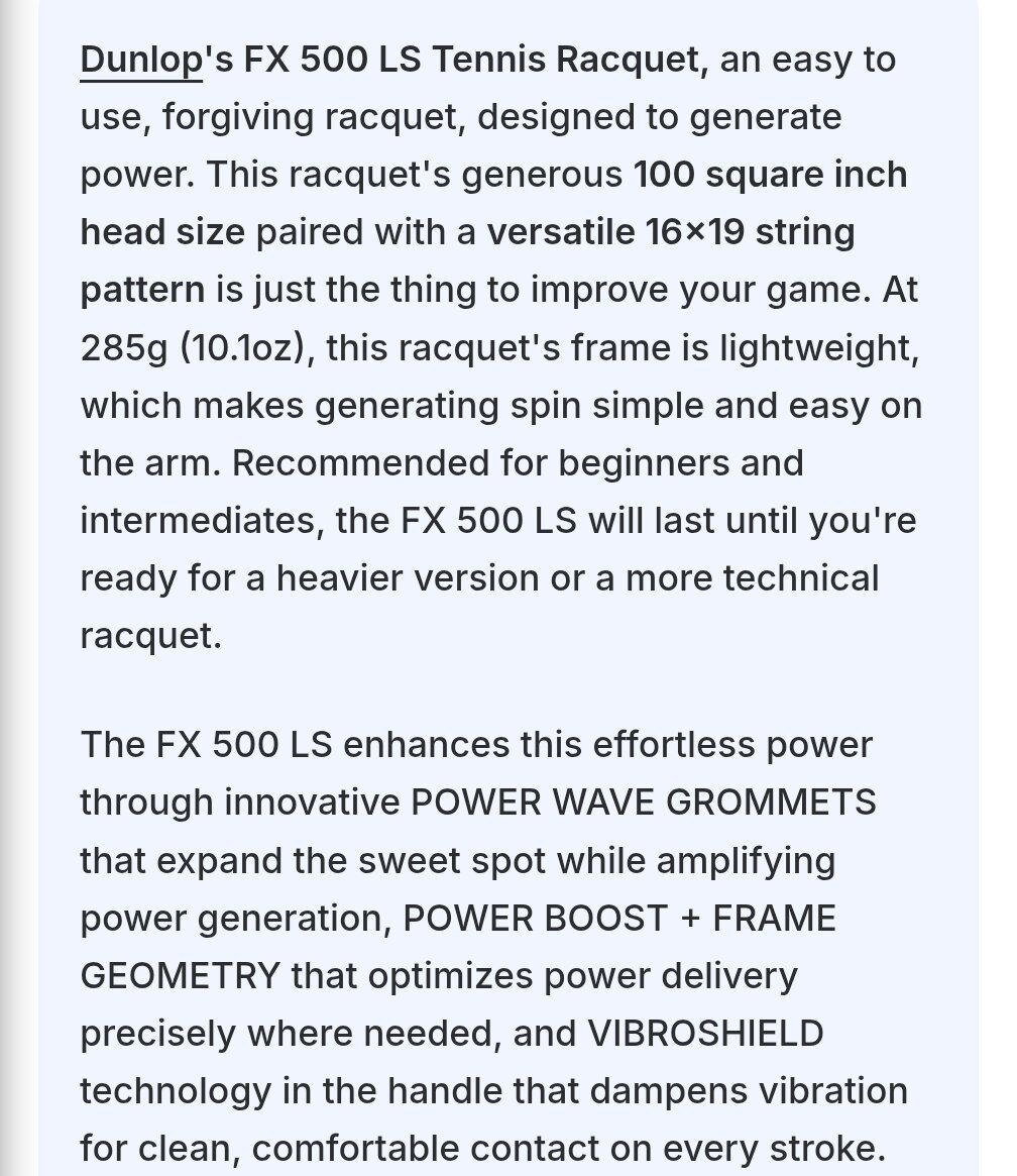 VenmoBrand new with tags Dunlop FX 500 LS Tennis Racket. Retails for $250. Asking $145. Details are in the pictures. Text if interested 801-903-8337
