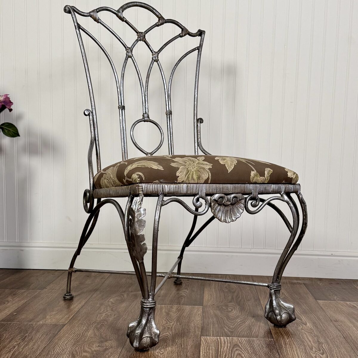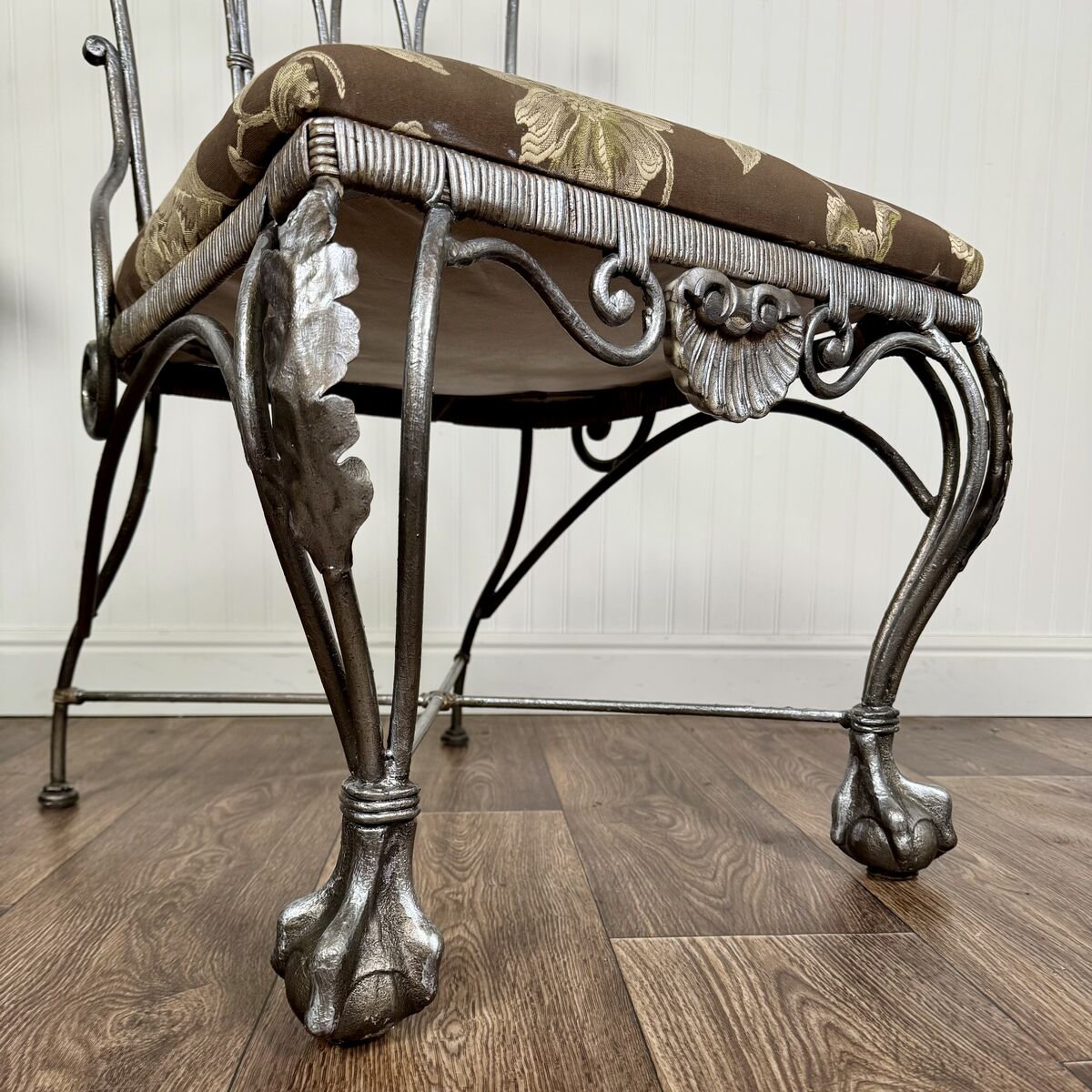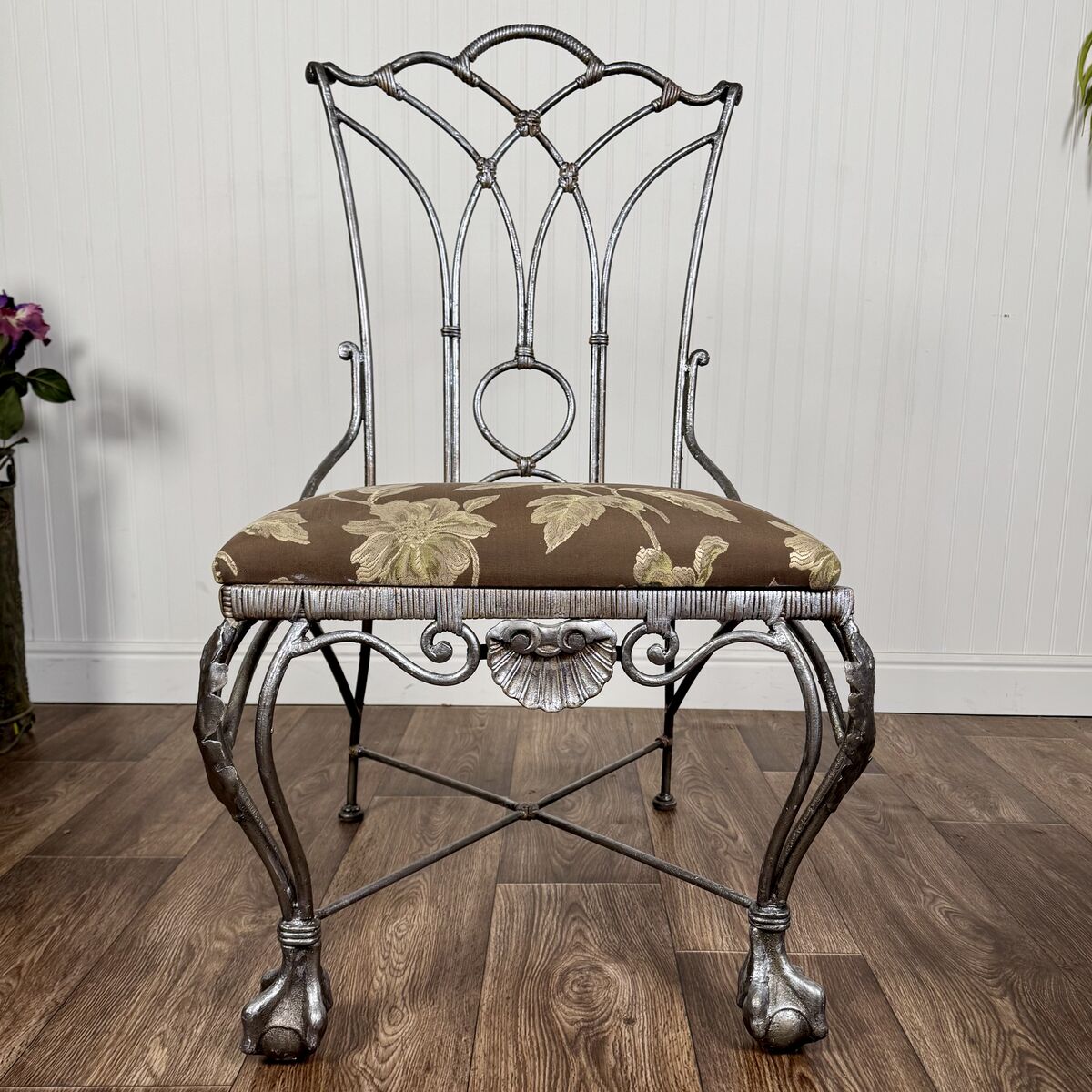 VenmoHeavy cast iron chair with ornate scrollwork, claw feet, and decorative shell detail. This piece has a romantic European garden feel and works beautifully in an entryway, bedroom corner, vanity setup, or covered patio. The silver finish also lends itself to more contemporary glam styles.