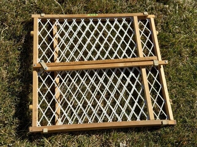 This 24-inch high wooden safety gate expands from 26 to 42 inches wide to fit various doorways or hallways. It features a classic diamond mesh design and a secure locking bar for easy installation. This lightweight gate is perfect for containing pets or toddlers and is in good used condition.