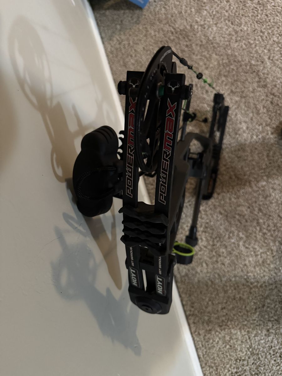 Hoyt Powermax set at 27.5" draw at 70lbs. Shooting about 291fps with a 400gr arrow.