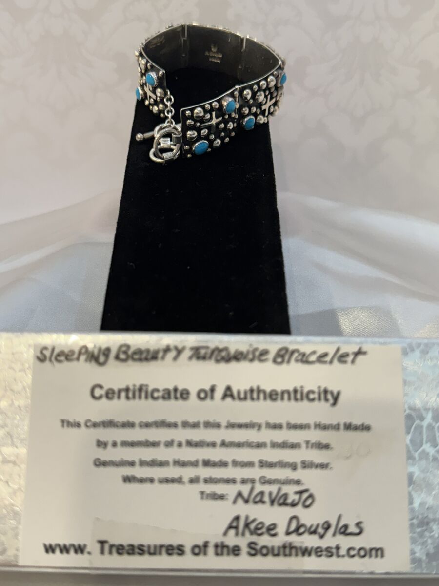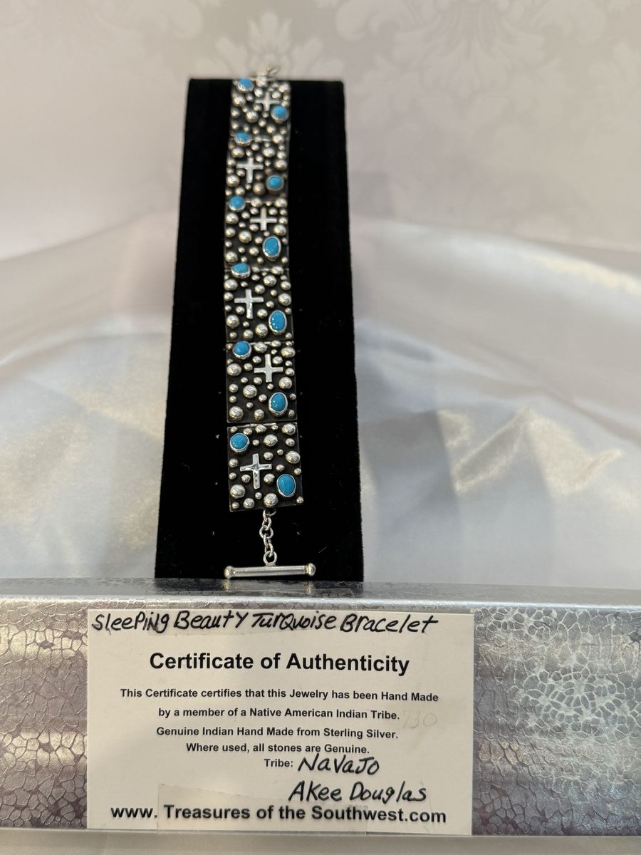 ZelleThis NEW - NEVER WORN Sleeping Beauty Turquoise Bracelet is an authentic piece of Native American jewelry handcrafted by Akee Douglas, a distinguished Navajo silversmith.