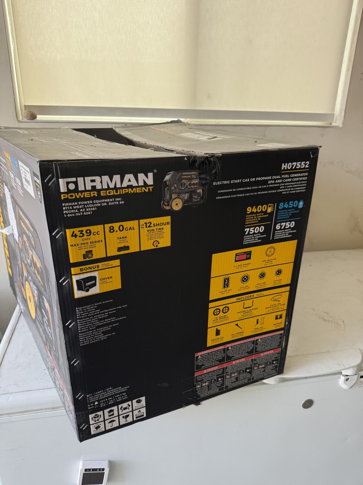 VenmoFirman H07552 Dual Fuel Generator. Runs on either gasoline or propane. 9400 starting watts / 7500 running watts on gas (8450/6750 on LPG).