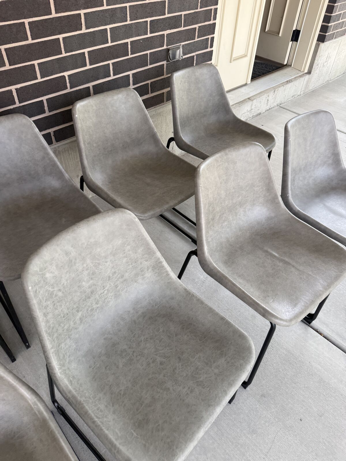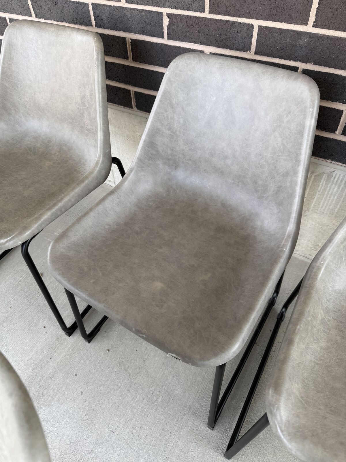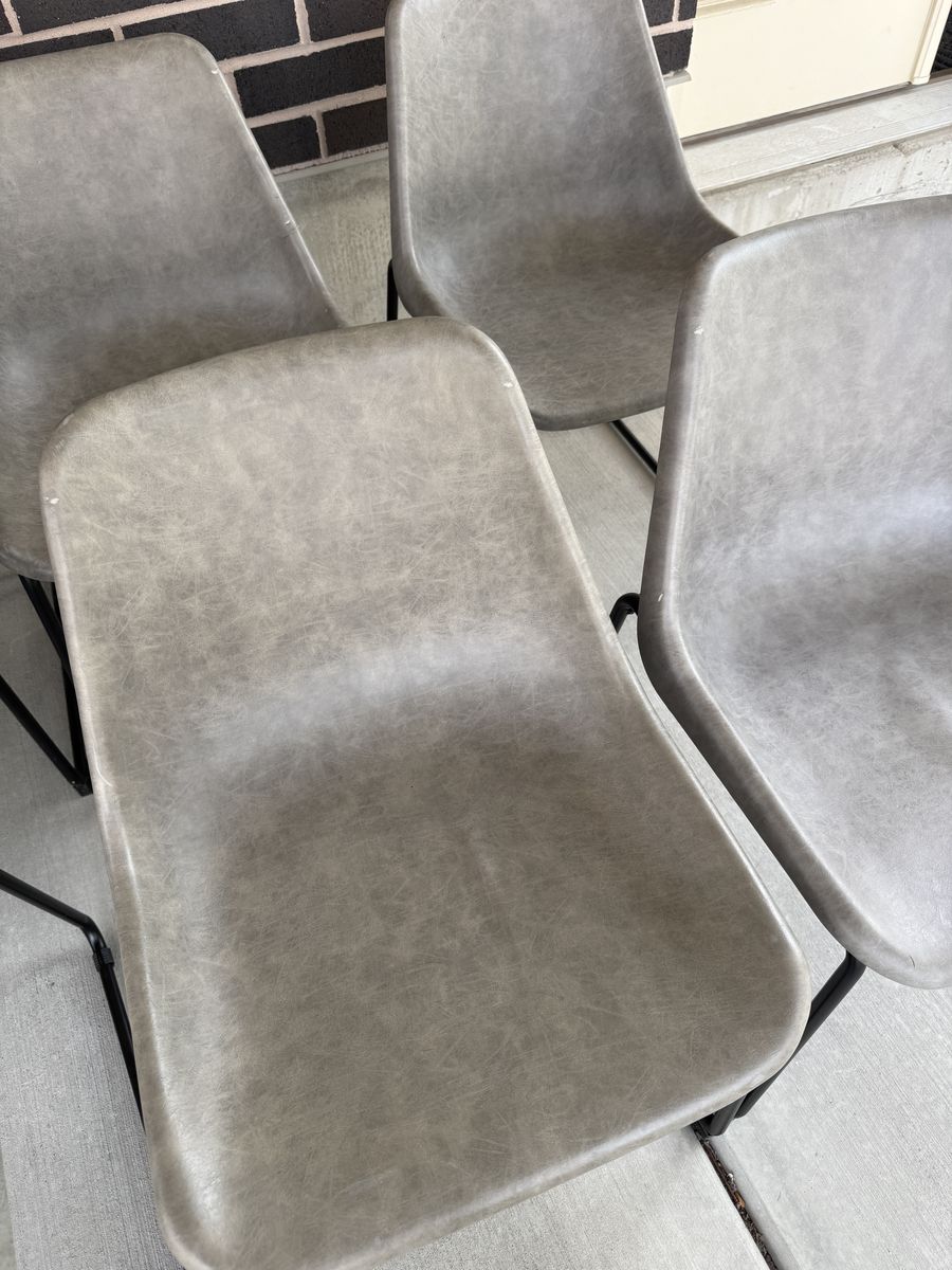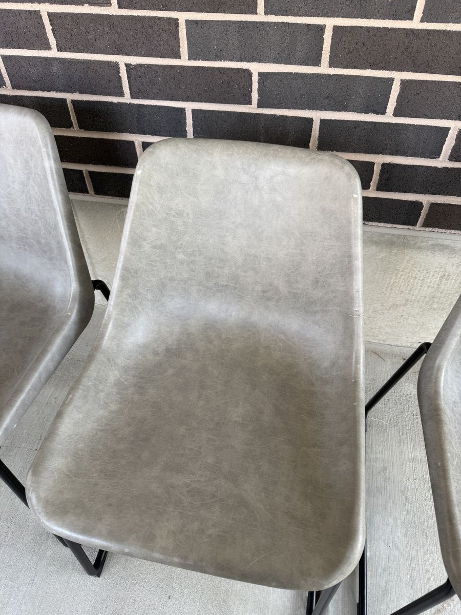 VenmoSet of 8 matching modern/industrial dining chairs. Grey faux leather bucket seats with black metal sled bases. Comfortable, easy to wipe clean, and in good condition. A few have minor tears/scuffs (see photos). Selling as a complete set of 8. Cash or Venmo. Pick up in Draper. Text if interested.