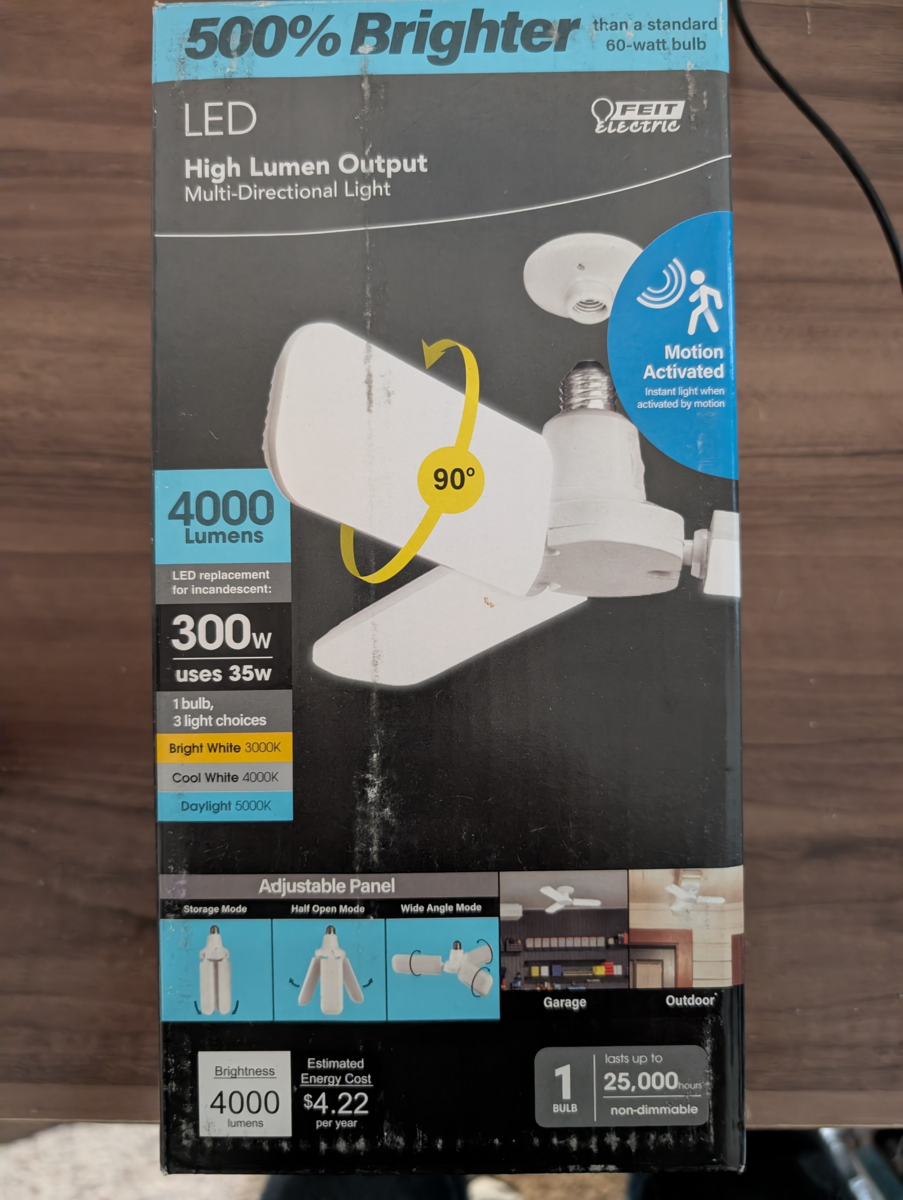 For garages, attics, patios, or other dark spaces, the Feit Electric ADJ4000/3CCT/LED Multi-Directional light provides an efficient and flexible way to get bright illumination in a small form. This light screws into standard E26 sockets and comes with independently adjustable rotating panels that unfold 90 degree and rotate 180 degree to direct light exactly where desired. Integrated non-dimmable LEDs produce 4000 lumens of 3000K/4000K/5000K Bright White, Cool White, or Daylight White light using only 35 watts an energy savings of over 88 percent compared to equivalent 300-watt incandescent bulbs. Each light lasts up to 25,000 hours/22.8 years of bright, reliable illumination. The estimated annual energy cost is only 4.22, based on 3 hours of daily use.Energy-saving LED lights use 88% less electricity than equivalent incandescent lights and fits into standard household sockets *180 Degree rotational panels light exactly where you want3000K/4000K/5000K bright white, cool white, or daylight white light for any room4000-lumen light is 500% brighter than 60-watt incandescent bulbs, ideal for garages, attics, workshops, patios, or other dark indoor and outdoor spacesFlicker-free, instant-on illumination at full brightness