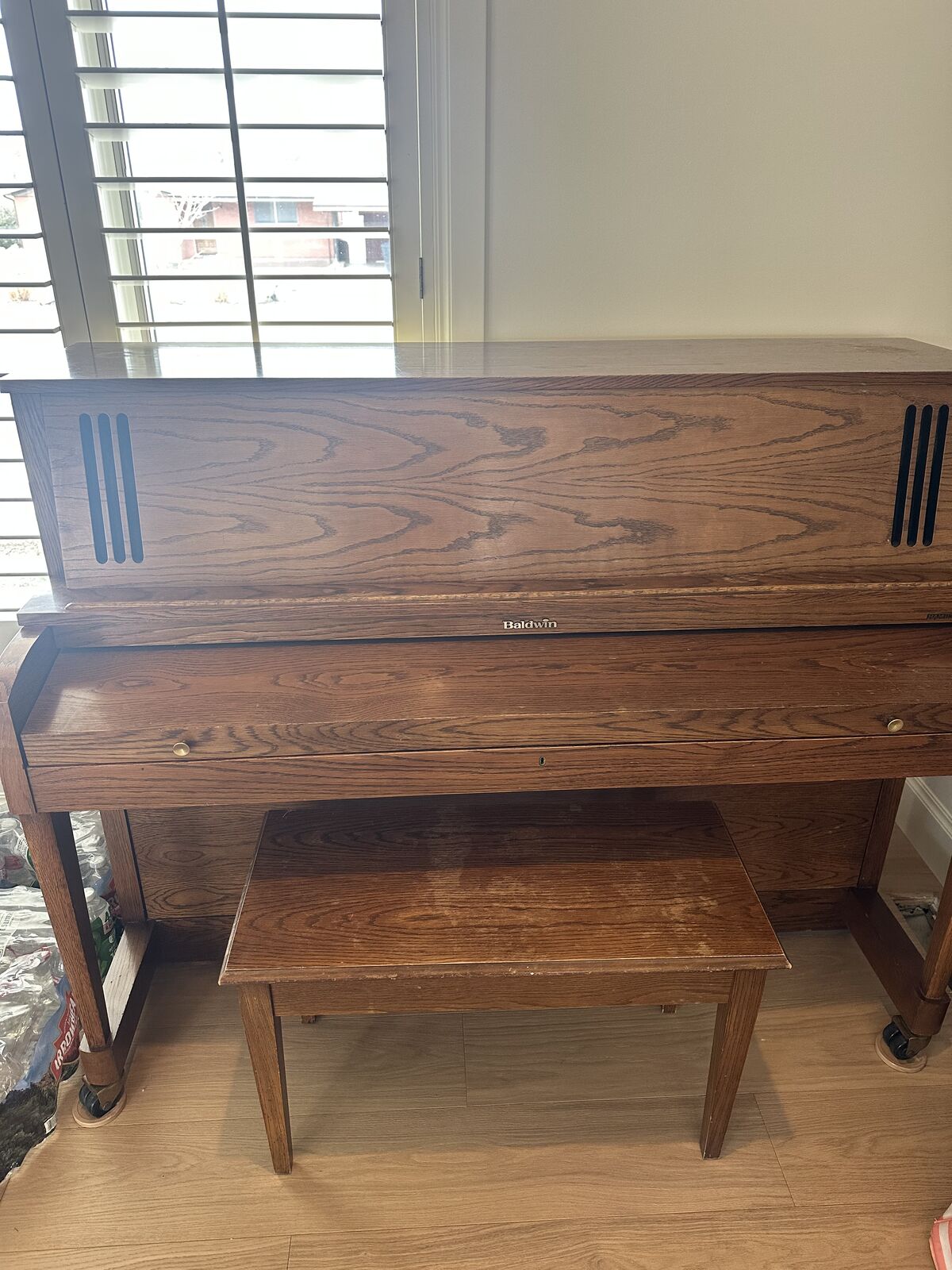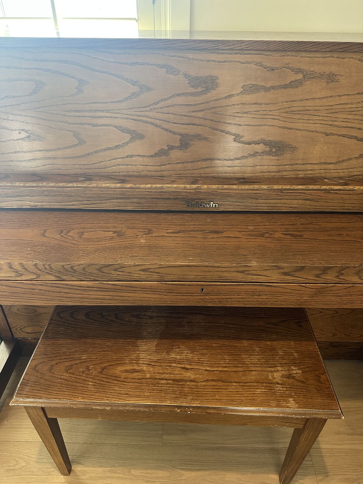 • Baldwin Hamilton model • Solid wood cabinet • Traditional oak finish • Bench included • On caster wheels for easier moving • Well cared for, clean condition