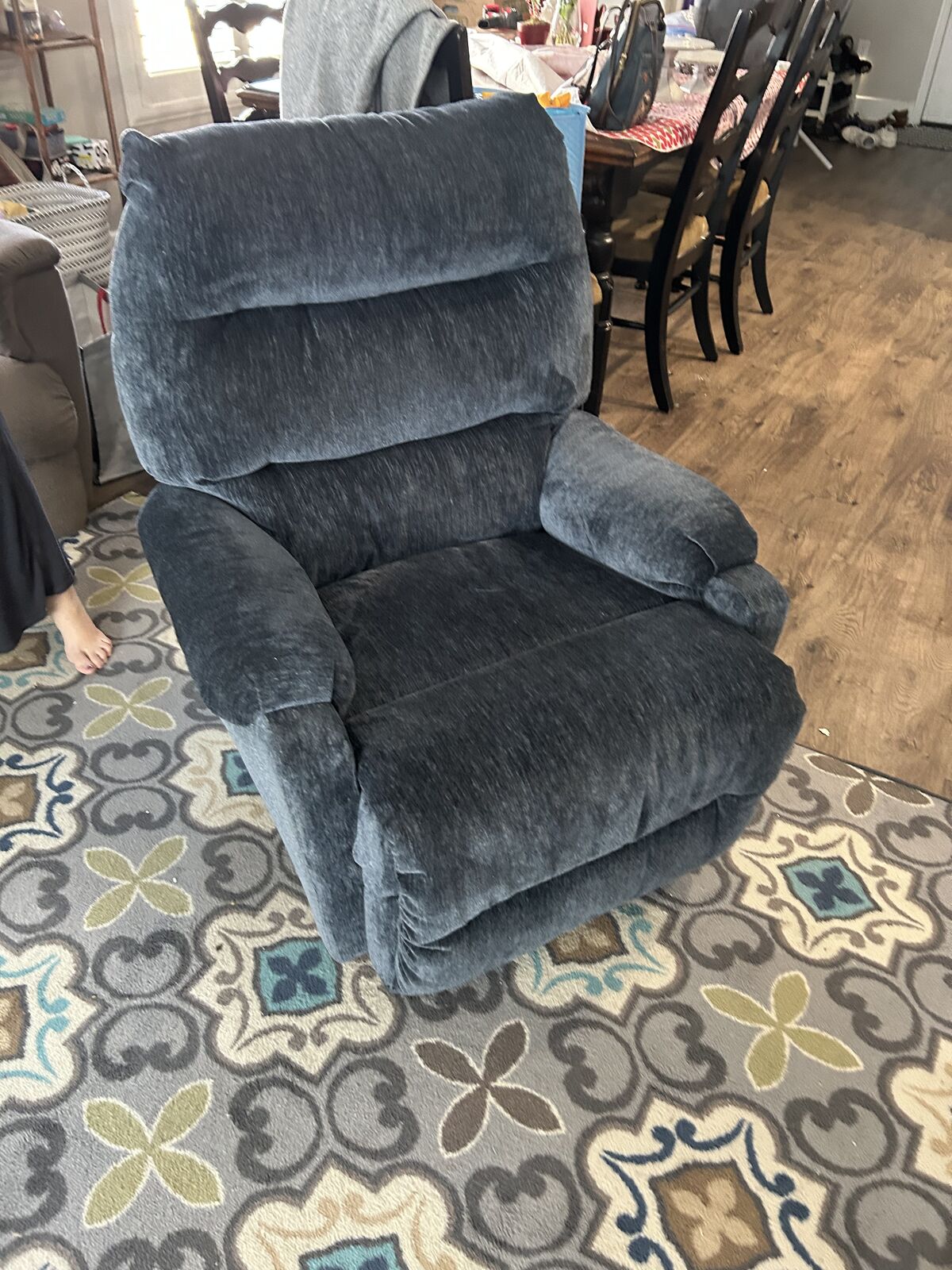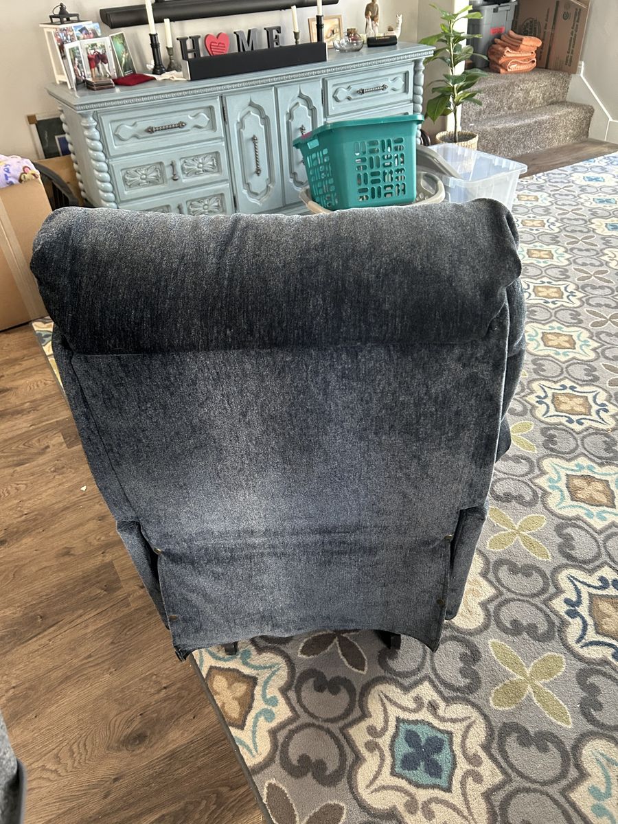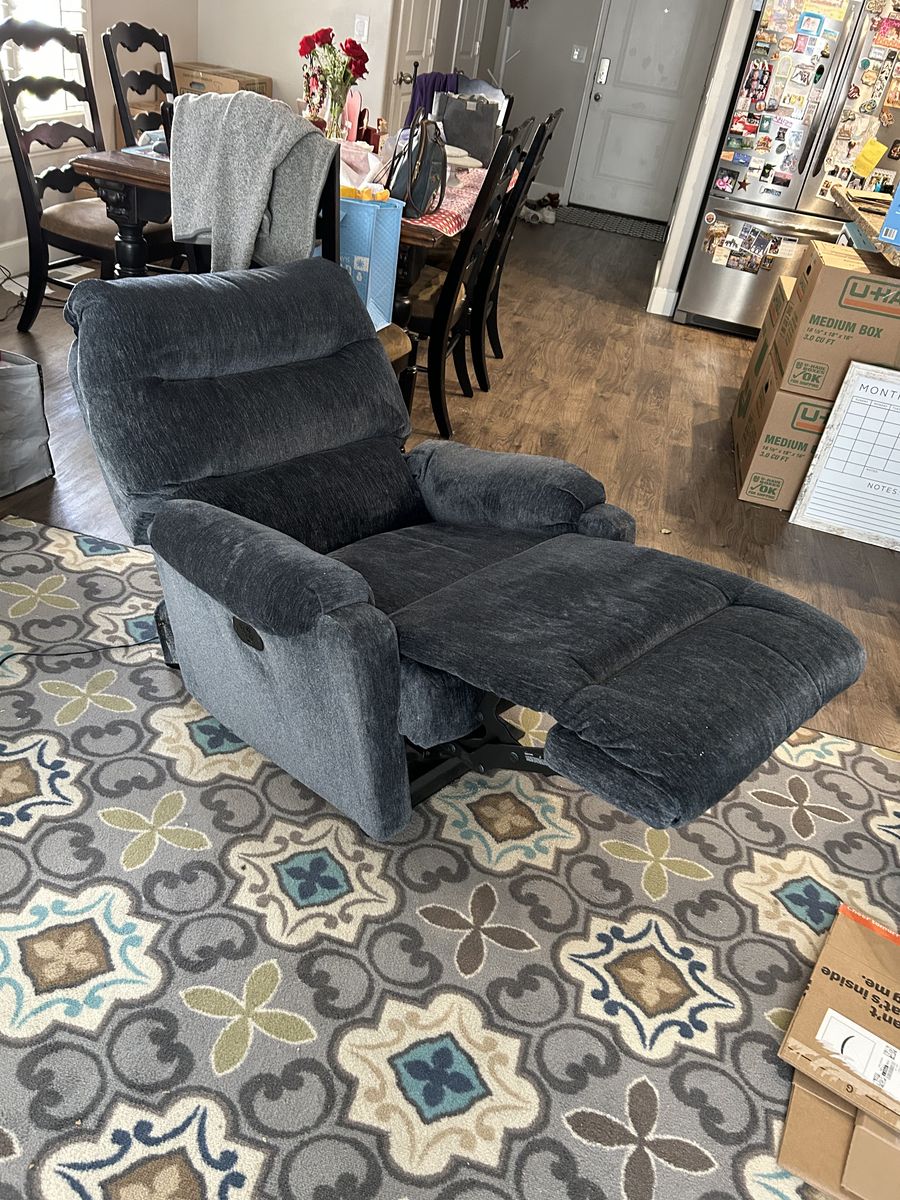 VenmoKid/teen size powered recliner. Cloth upholstered. Navy color. Slightly used in a pet and smoking free home. 5’ 6” man pictured in the chair. No stains or bad smells.