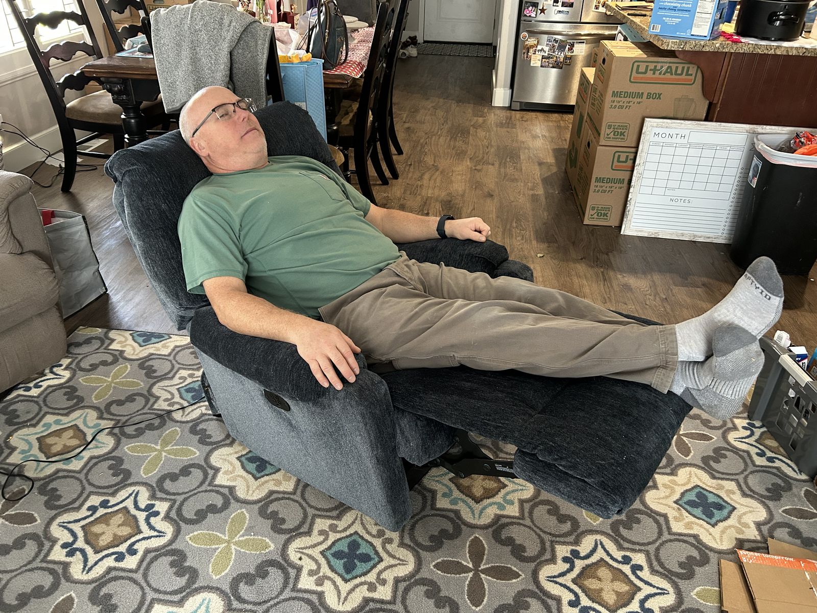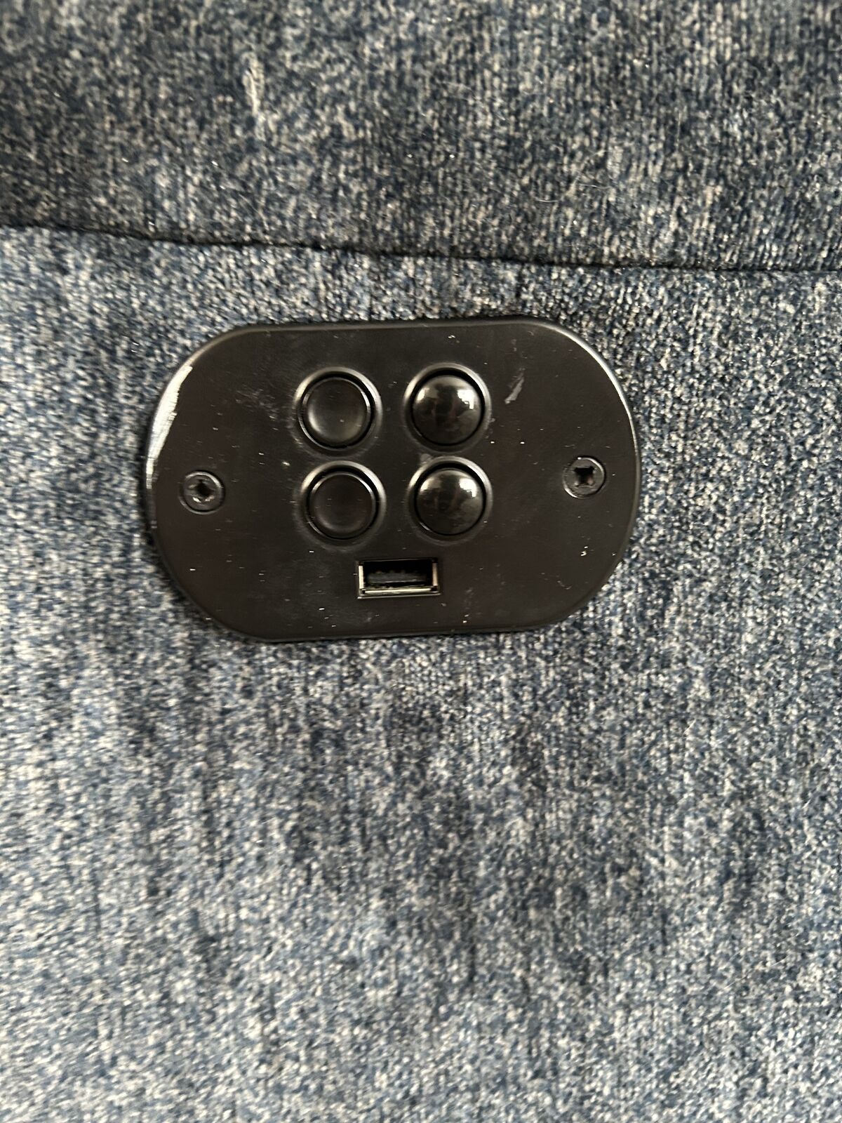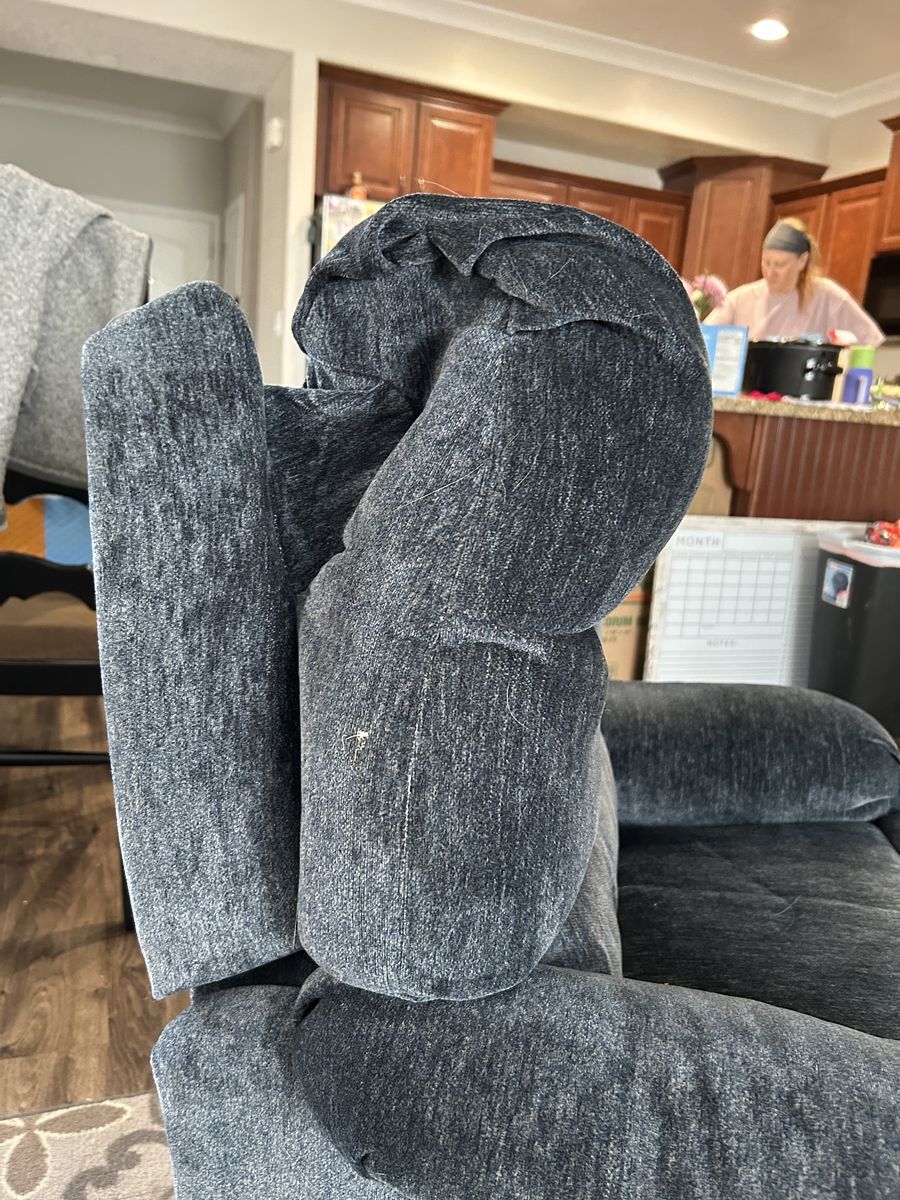 VenmoKid/teen size powered recliner. Cloth upholstered. Navy color. Slightly used in a pet and smoking free home. 5’ 6” man pictured in the chair. No stains or bad smells.