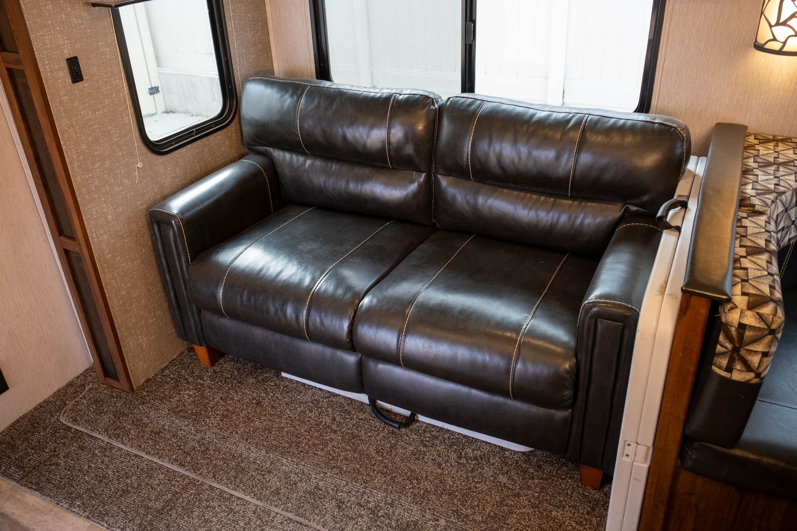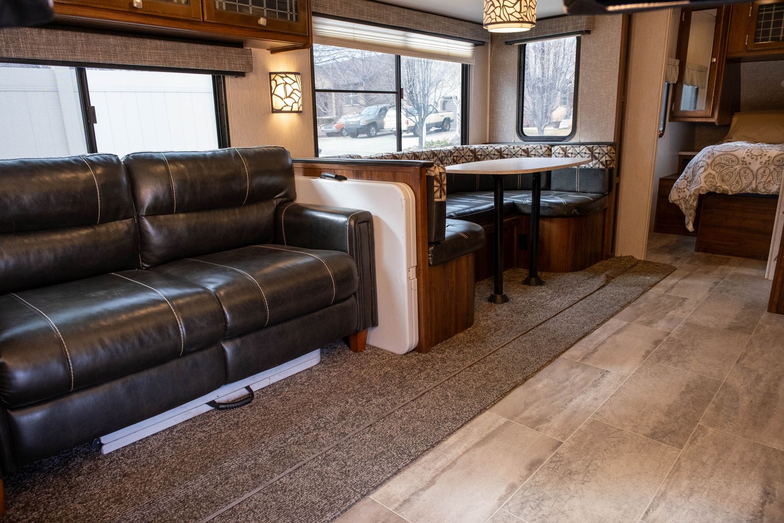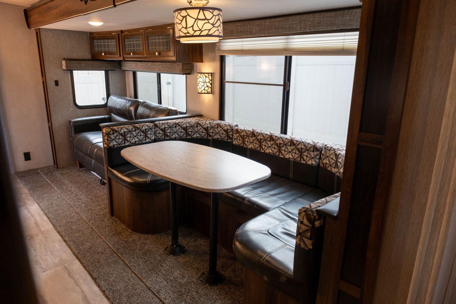 Living Area: U-shaped dinette in a slide-out, sofa, and overhead cabinets.