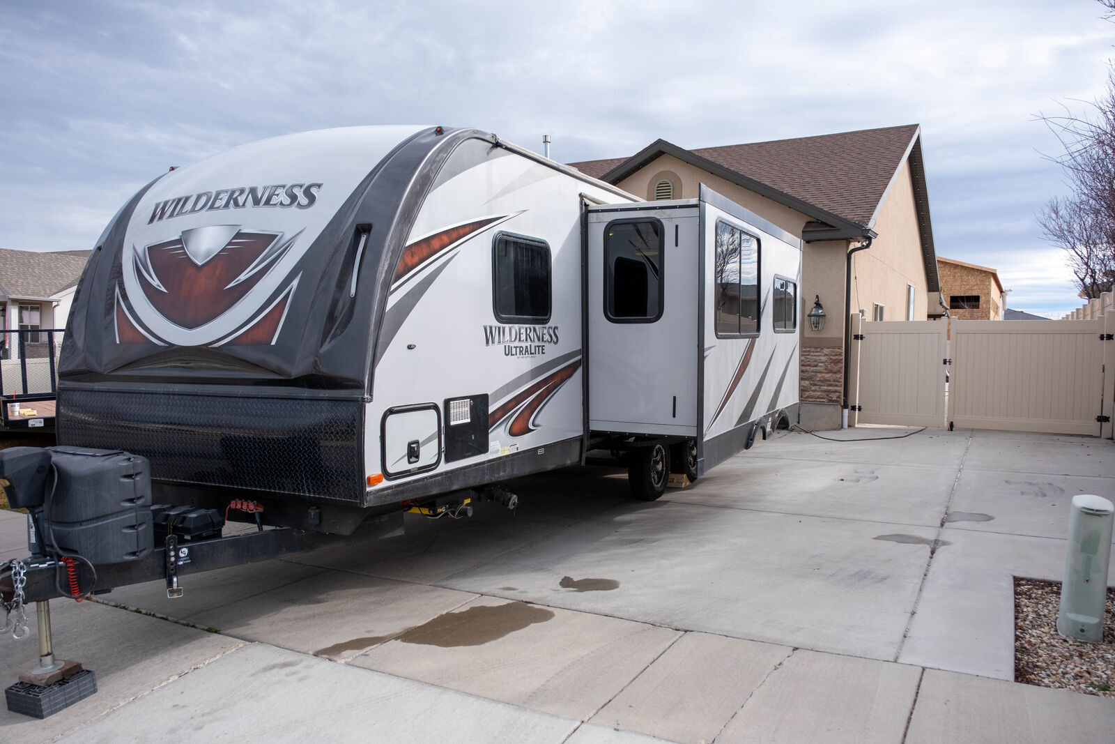 Exterior: Outdoor kitchen, power awning, power tongue jack, and stabilizer jacks.