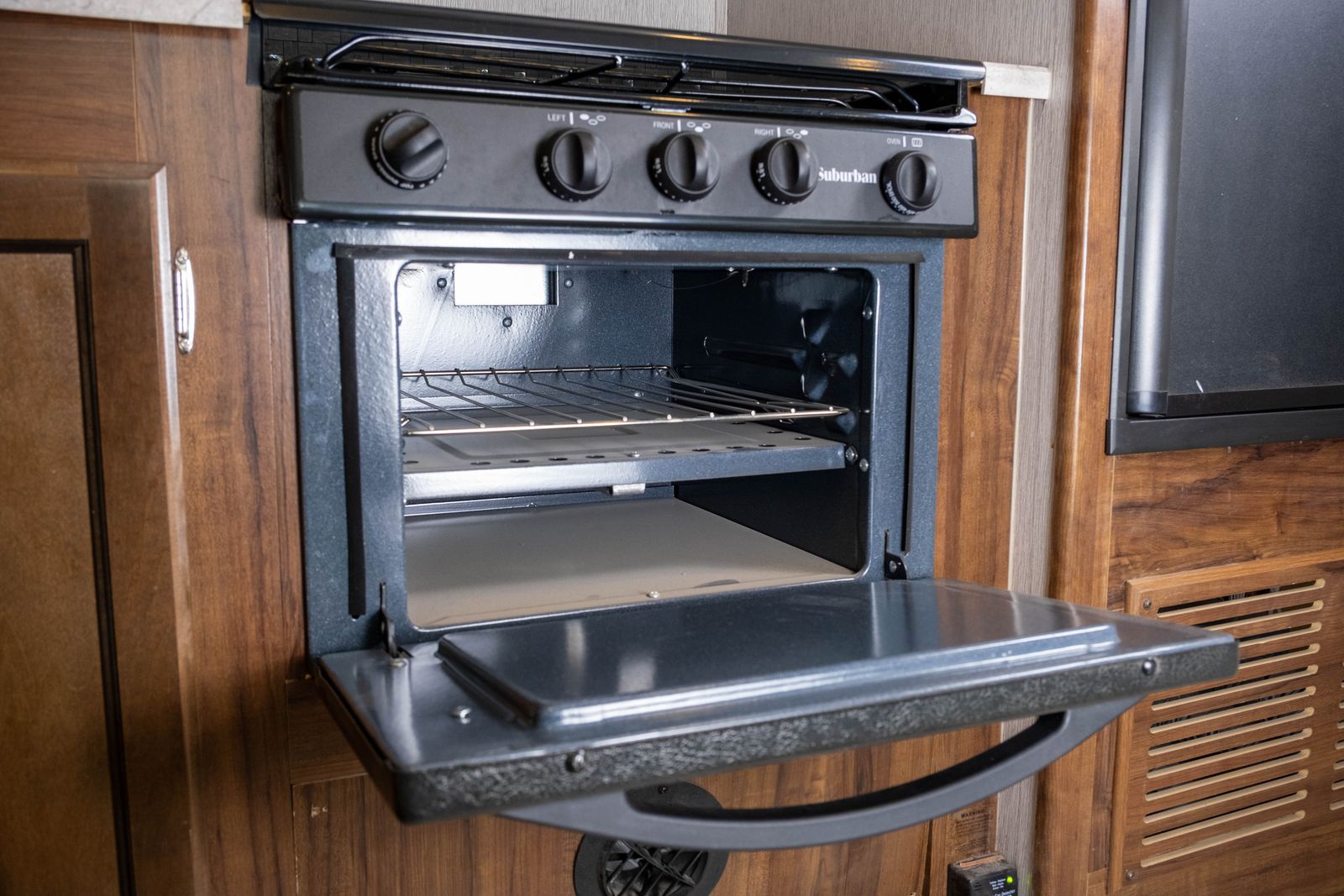 Kitchen: 3-burner stove with oven, microwave, and double-door refrigerator.