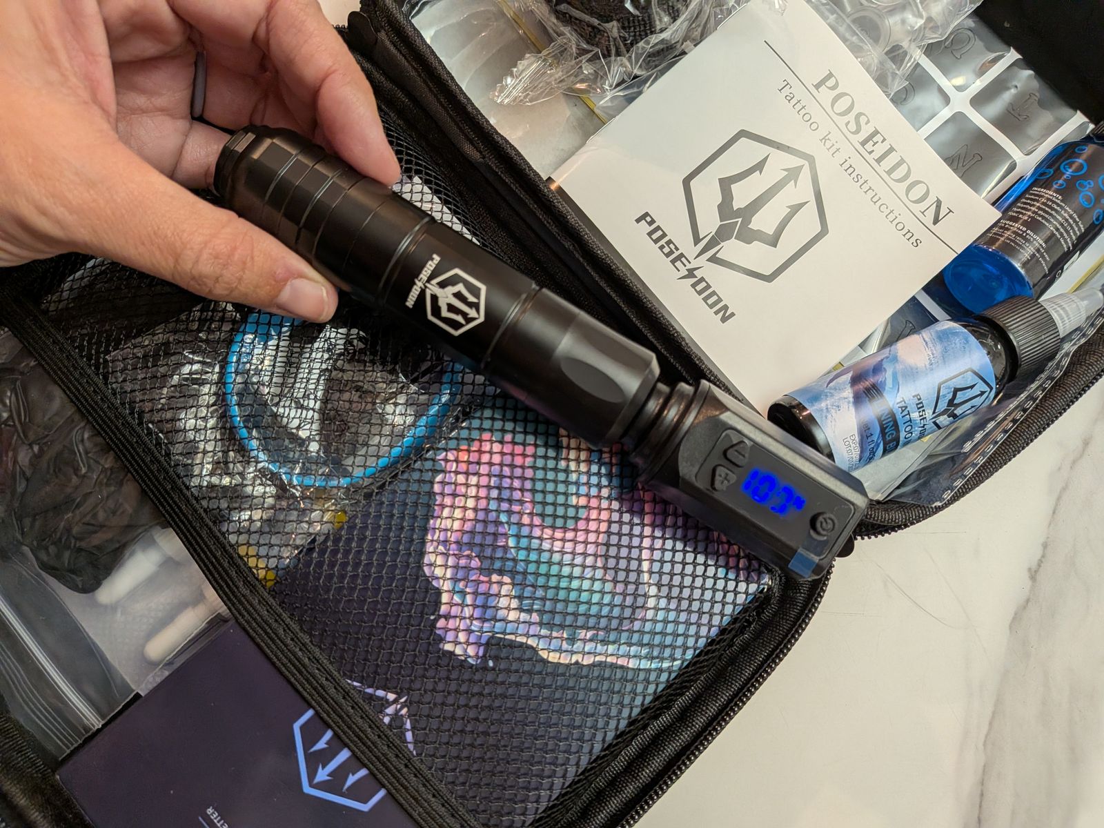 VenmoComplete Poseidon wireless tattoo machine kit in hard carrying case. Clean condition and fully functional. Includes: • Wireless tattoo pen with digital voltage display • Rechargeable battery pack • Charging cable • Assorted sterile cartridge needles (individually packaged) • Multiple tattoo ink bottles • Practice supplies • Instruction booklet • Zippered hard case Everything pictured is included. Great for: • Tattoo apprentices • Beginners practicing on synthetic skin • Expanding your current setup • Backup machine Condition: Clean and lightly used Location: West Valley City Price: $120 (reasonable offers considered) Serious inquiries only. Text preferred.