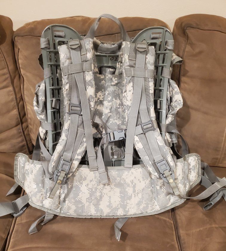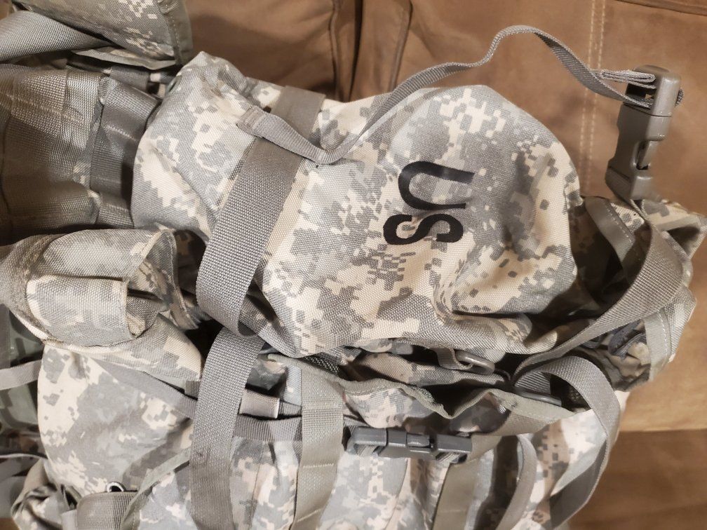 This is a large U.S. military surplus molle 2 rucksack. This pack is in good condition and every buckle, zipper, pull cord, and strap work as they should. It is rated for up to 200 pound load capacity with approximately 5,000 cu. in. of space. It comes with both side pouches. It has been stored indoors in my basement in a smoke-free and pet-free home.