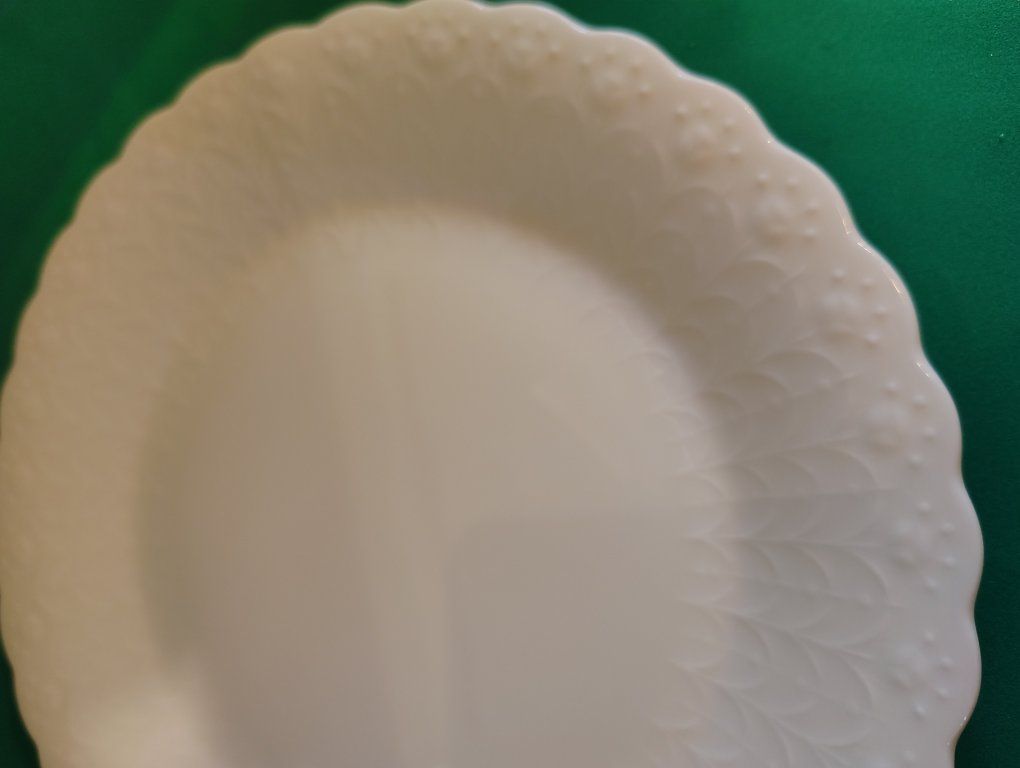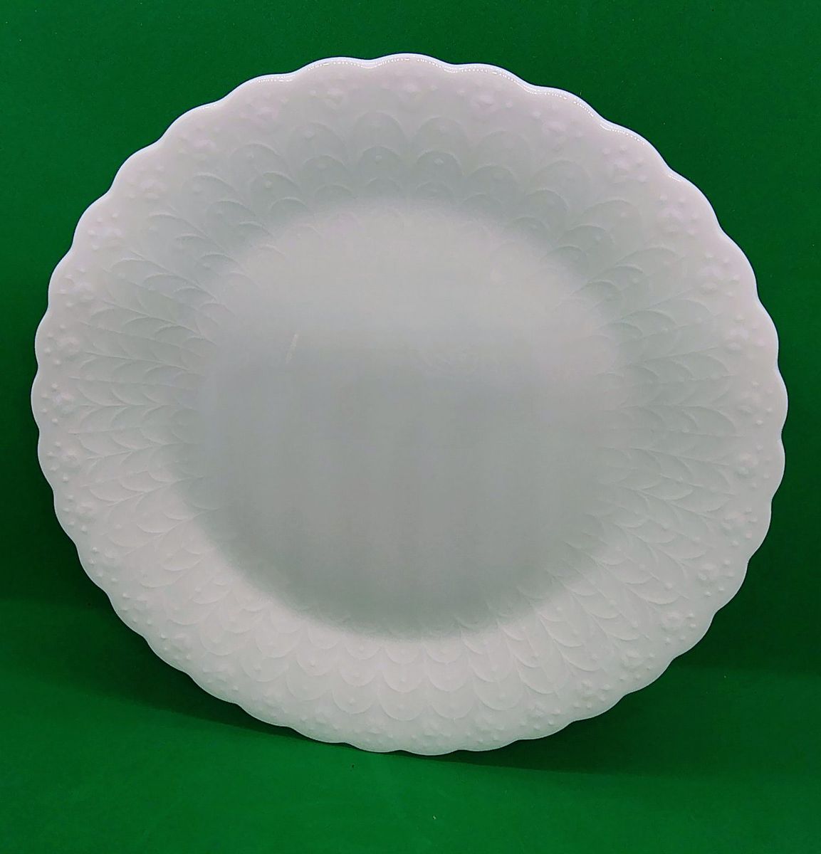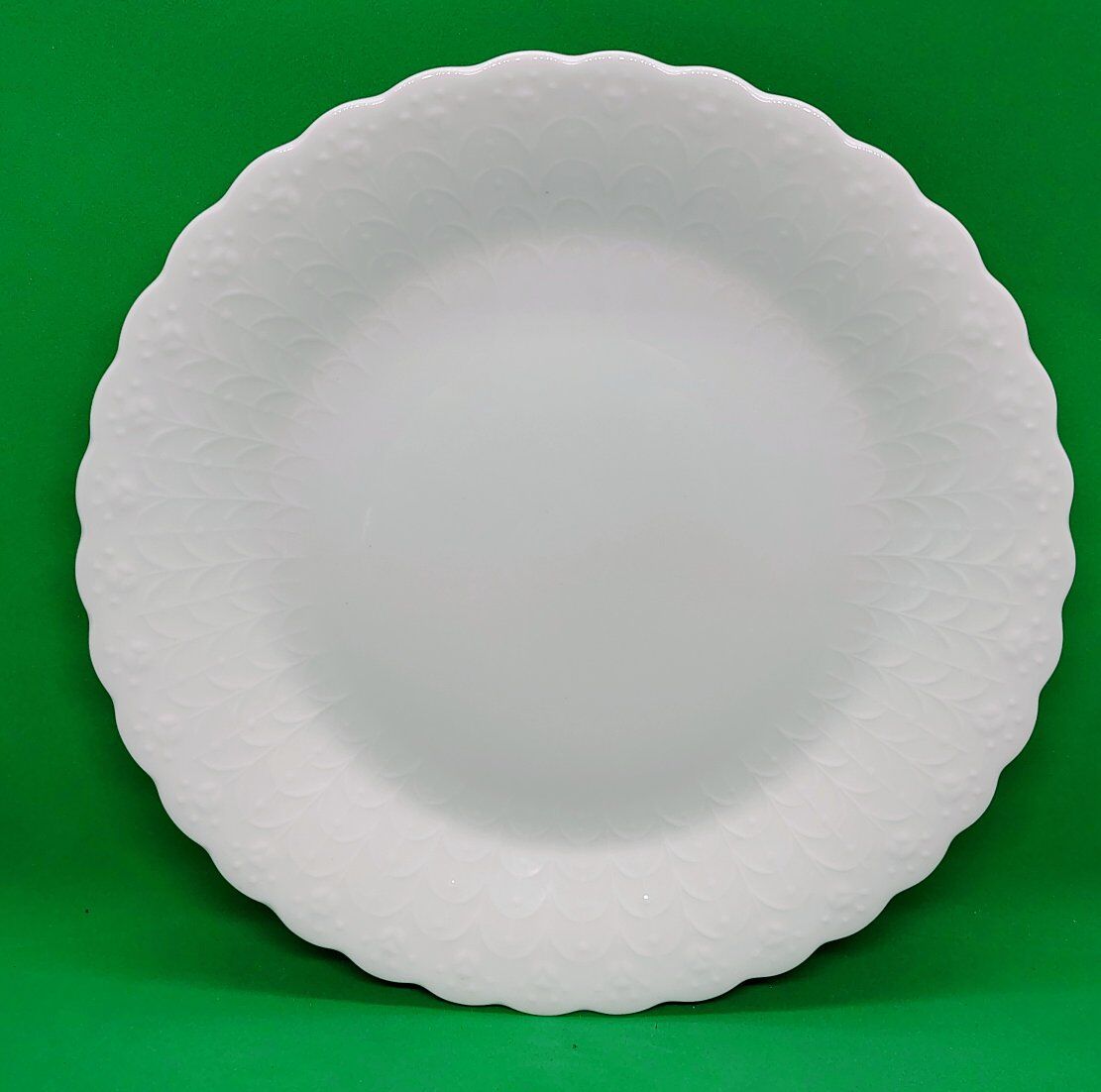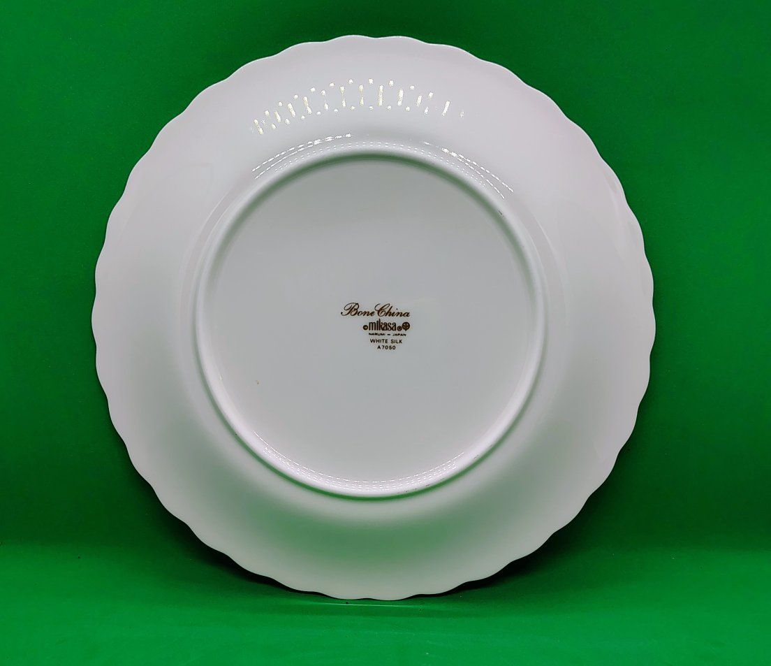 Mikasa "White Silk" (Pattern A7050) collection featuring an all-white design with an embossed flower and scroll rim and was produced from 1980 to 1997. Material: Bone China Condition: Very good Salad plates (approx. 7 5/8" or 7.75" diameter)