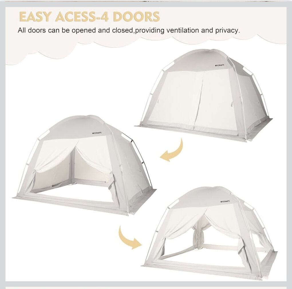 Comfort and Privacy Tent: The indoor tent features 4 doors,providing you with a private and cozy space. You can choose to open or close multiple doors,ensuring good air circulation